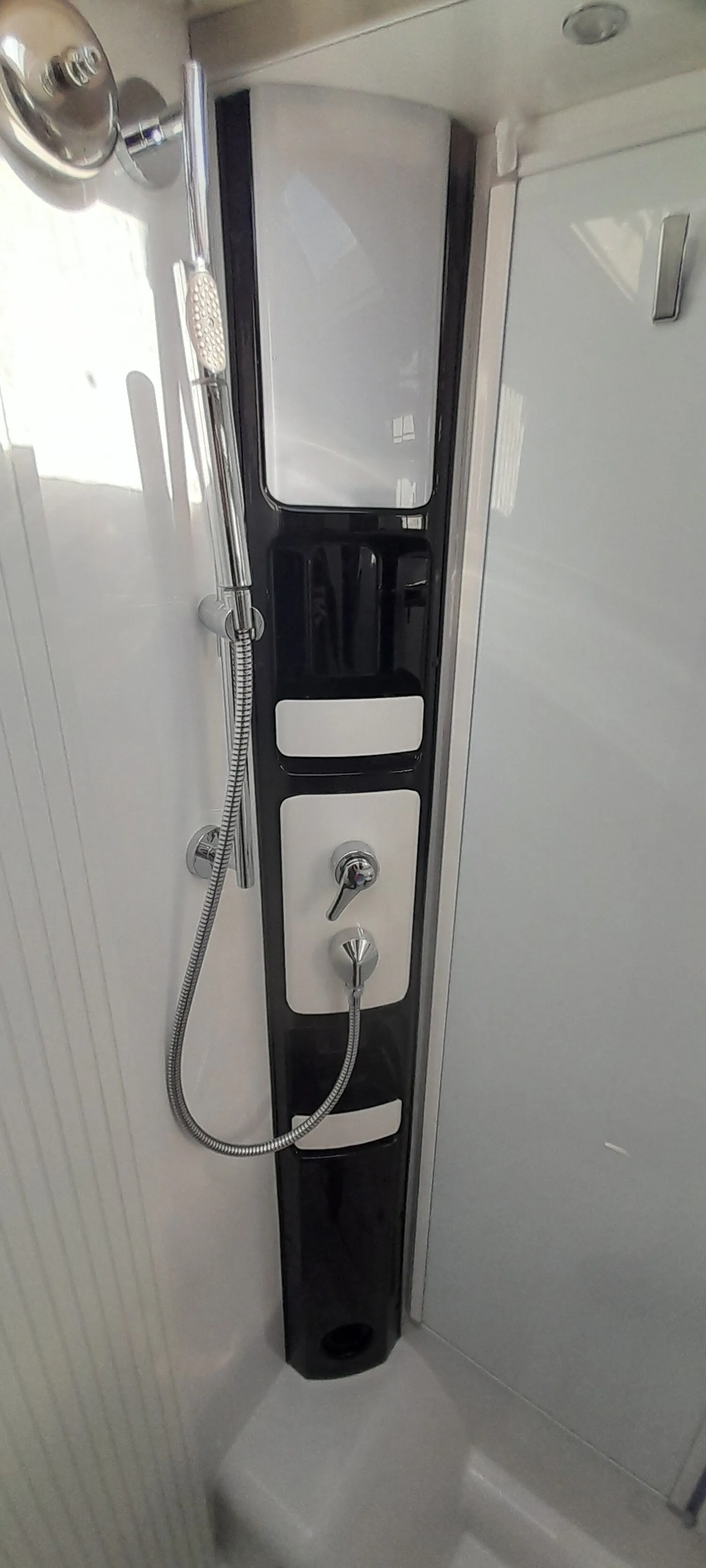 - Eingangstür, extrabreit mit Doppelverriegelung, Fenster, Abfalleimer und Staufächern, lichtes Maß: 605 x 1.740 mm