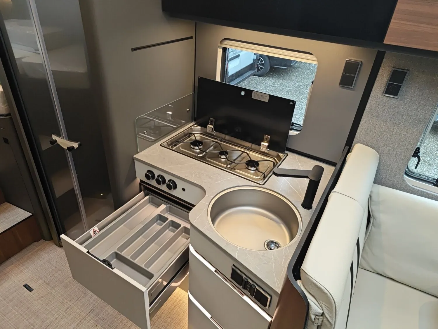 - Schublade und Einlegewanne als Stauraum in der Sitzgruppe