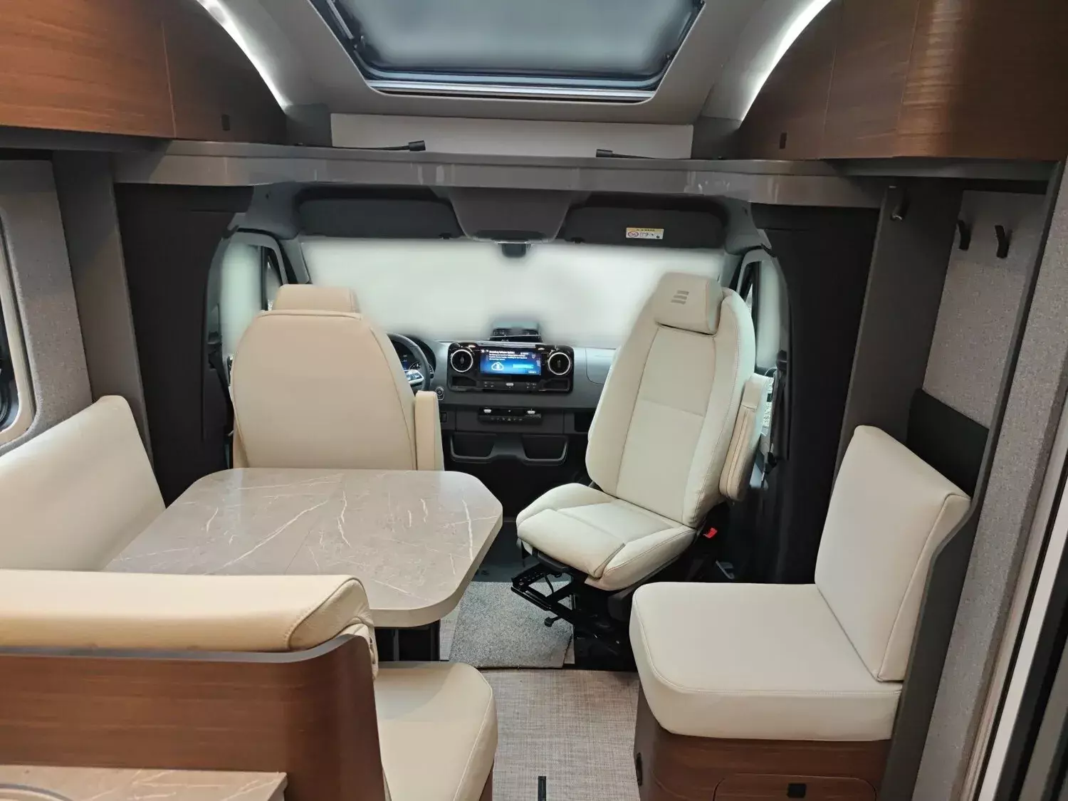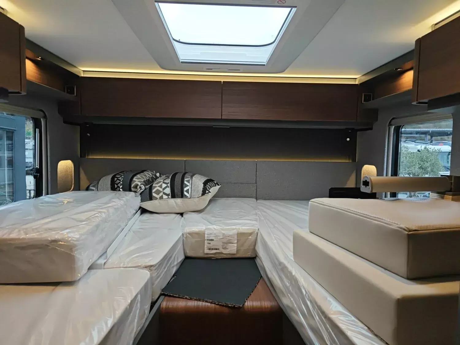 - Wohnkomfort-Paket (Filzverkleidung in Heckgarage, Spannbettlaken nach Maß für Heckbetten individuell an Matratzen angepasst, 2 Kissen mit Bezug, Ambient-Light-System: Mehr-Ebenen Lichtsystem mit dynamischer und individueller Steuerung der Beleuchtung (inkl. Lichttemperatur) sowie stimmungsvoller Sockelbeleuchtung, 4 x 230 V / 2 x Doppel-USB Zusatzsteckdosen)