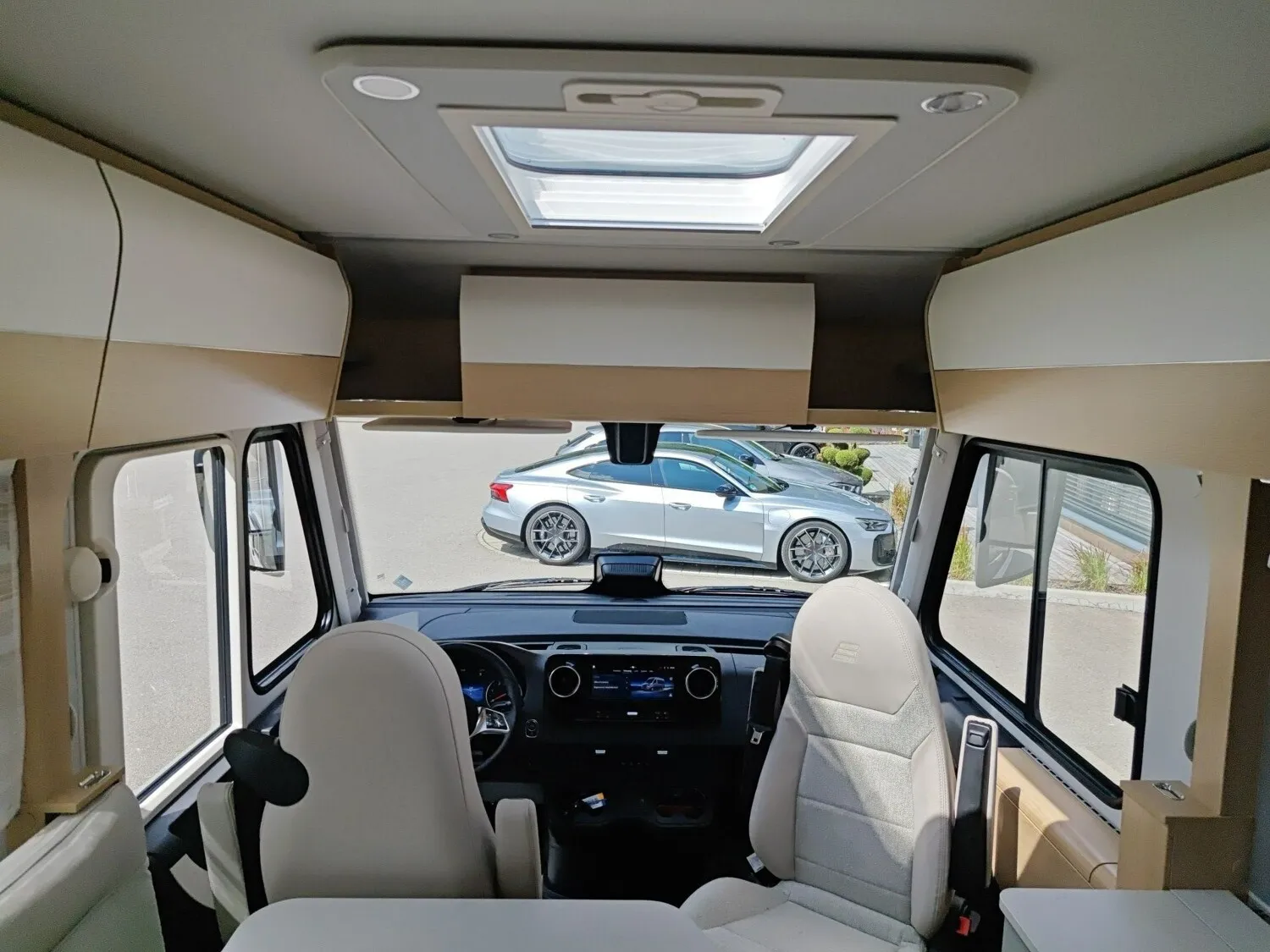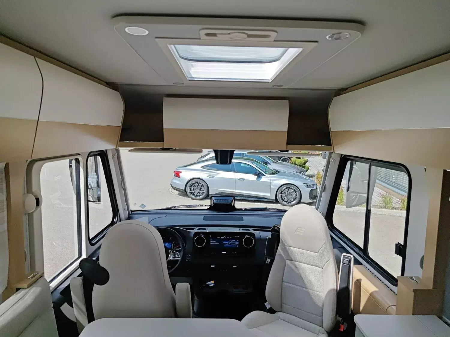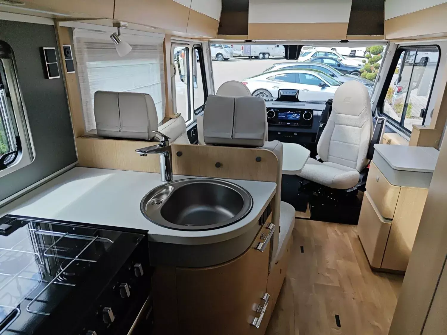 - Wohnkomfort-Paket (Einlegeboden mit Holzoberfläche, Spannbettlaken nach Maß für Heckbetten individuell an Matratzen angepasst, 4 Kissen mit Bezug, Ambient-Light-System: Mehr-Ebenen Lichtsystem mit dynamischer und individueller Steuerung der Beleuchtung (inkl. Lichttemperatur) sowie stimmungsvoller Sockelbeleuchtung, 4 x 230 V / 1 x 12 V / 1 x Doppel-USB Zusatzsteckdosen (inkl. Küchenwand-Verkleidung))