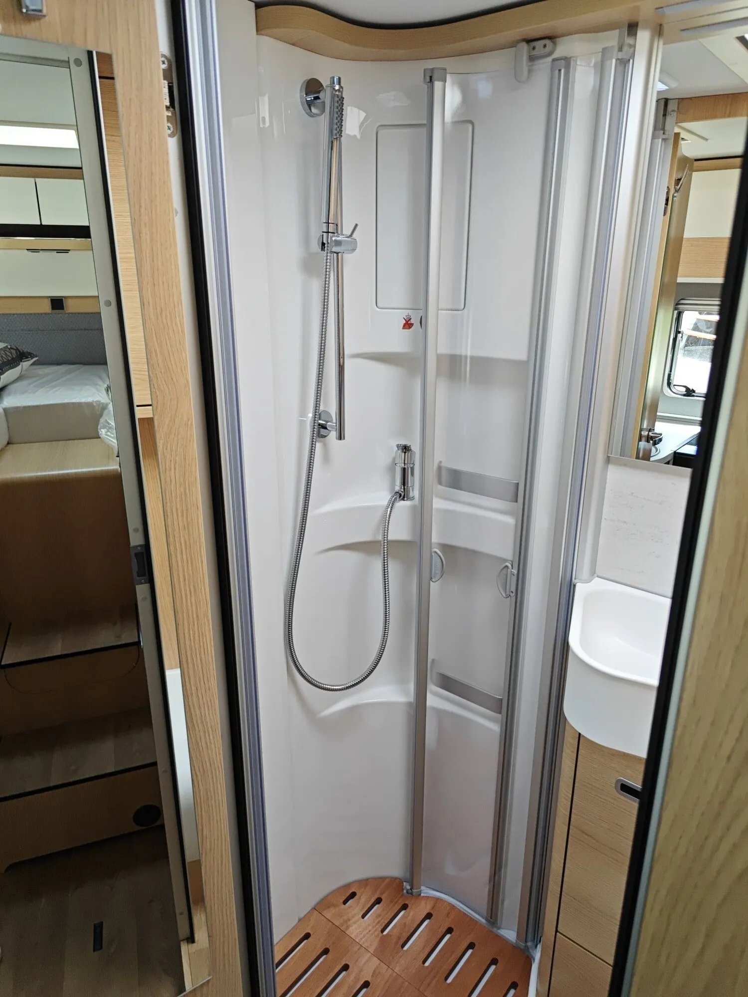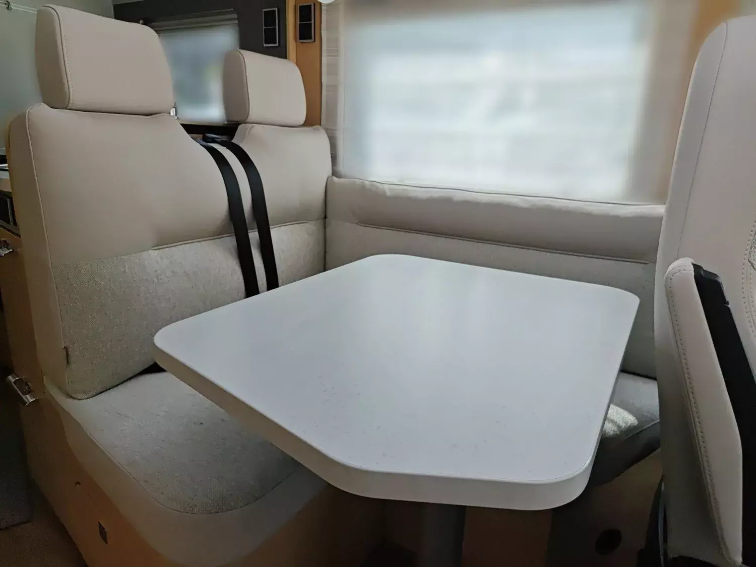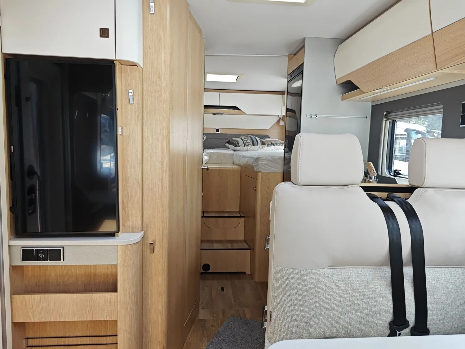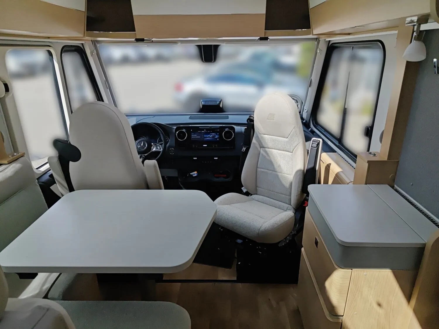 - Wohnkomfort-Paket (Einlegeboden mit Holzoberfläche, Spannbettlaken nach Maß für Heckbetten individuell an Matratzen angepasst, 4 Kissen mit Bezug, Ambient-Light-System: Mehr-Ebenen Lichtsystem mit dynamischer und individueller Steuerung der Beleuchtung (inkl. Lichttemperatur) sowie stimmungsvoller Sockelbeleuchtung, 4 x 230 V / 1 x 12 V / 1 x Doppel-USB Zusatzsteckdosen (inkl. Küchenwand-Verkleidung))