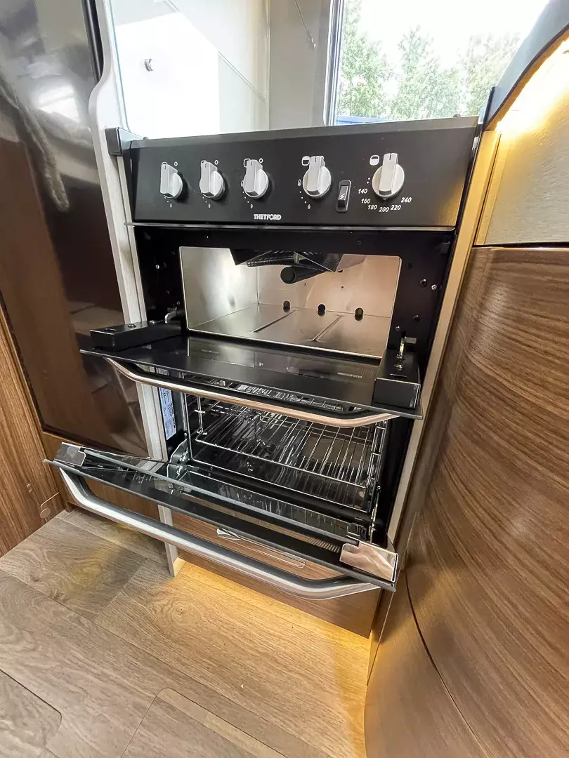 * Mit dem absenkbaren Tisch lässt sich die L-Sitzgruppe in einen weiteren Schlafplatz verwandeln, und die große Heckgarage bietet reichlich Platz für Gepäck und Fahrräder. Die separate Dusche, das bequeme Schlafsystem mit Tellerfederrosten und die durchdachte Küche mit Herd-Backofen-Kombination machen den Alltag unterwegs besonders angenehm.
