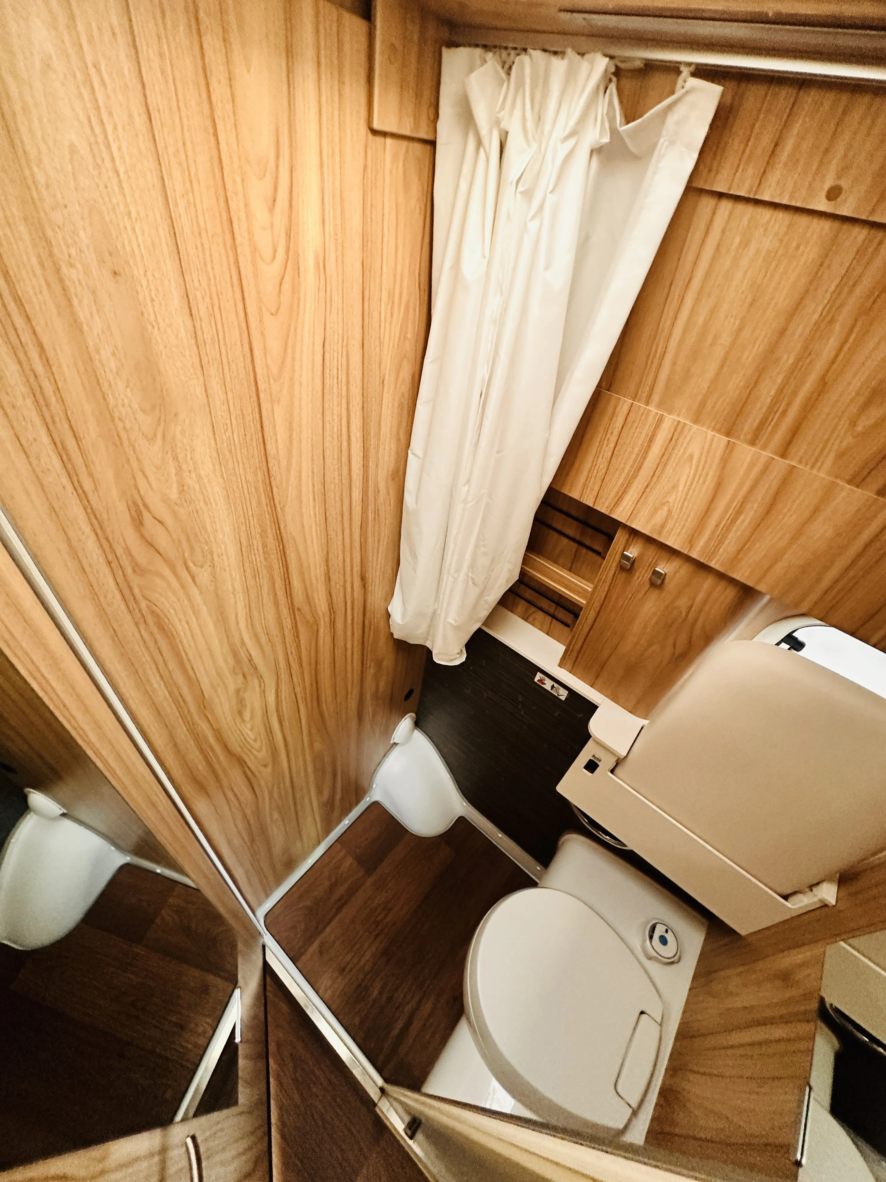 Kompaktbad mit Tür, Duschwanne U-förmig, Spiegelschrank, Designer-Klappwaschbecken (Mineralwerkstoff)