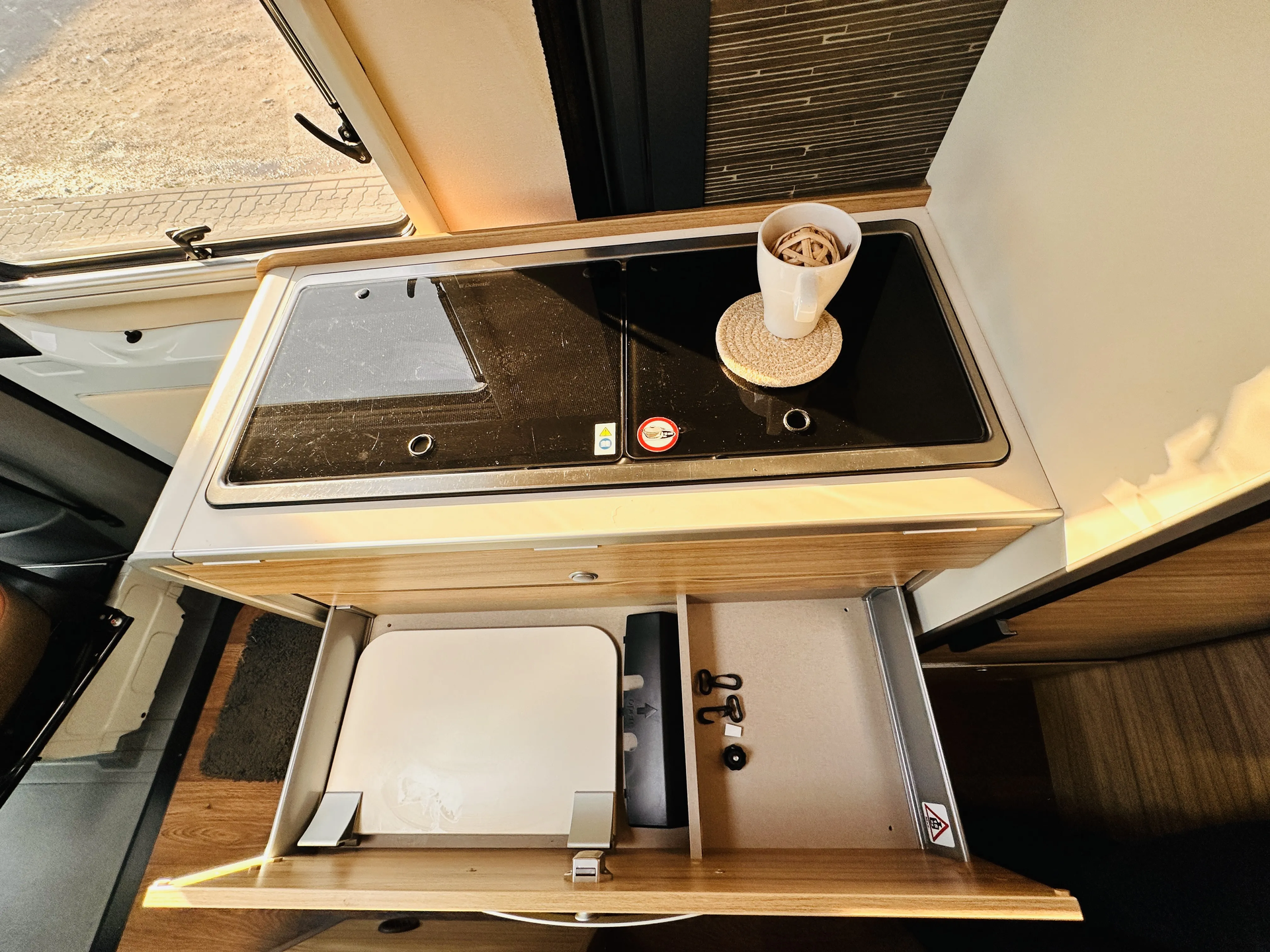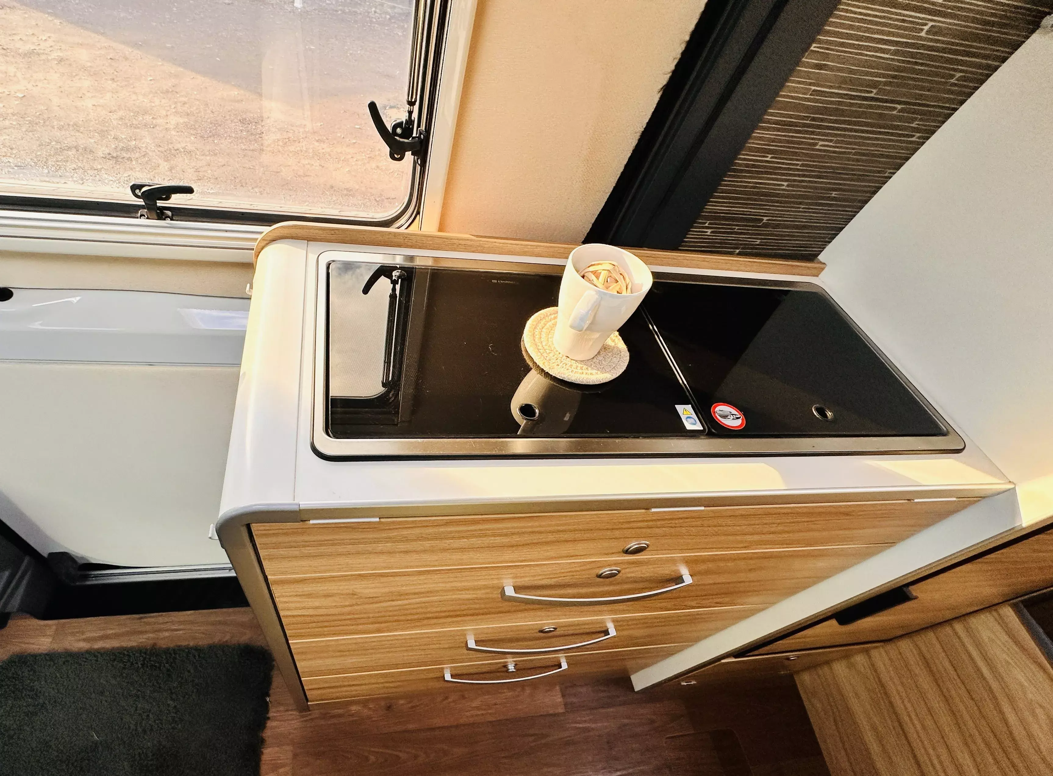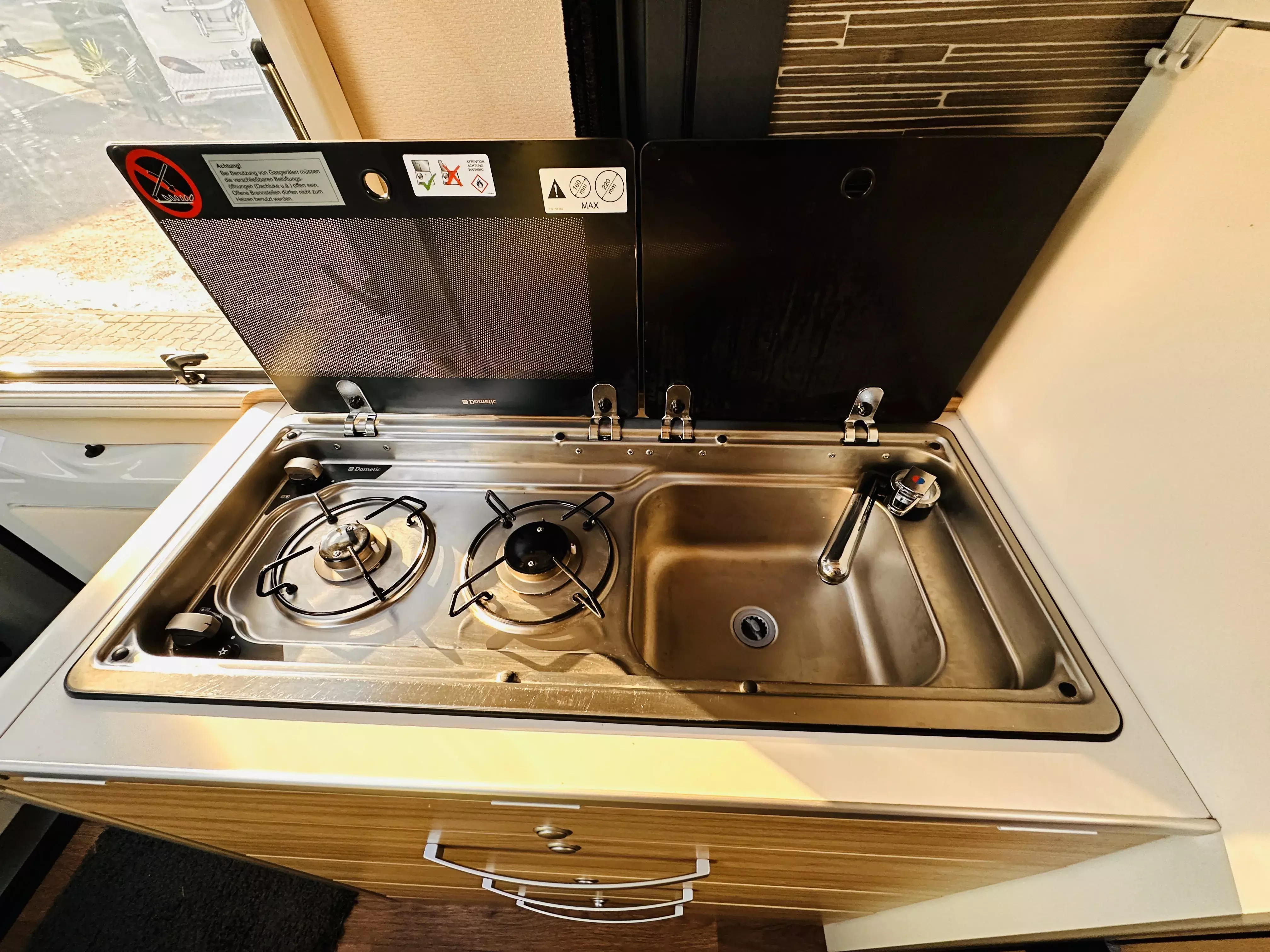 Koch-Spül-Kombination mit 2-Flammen-Gaskocher und Glasabdeckung