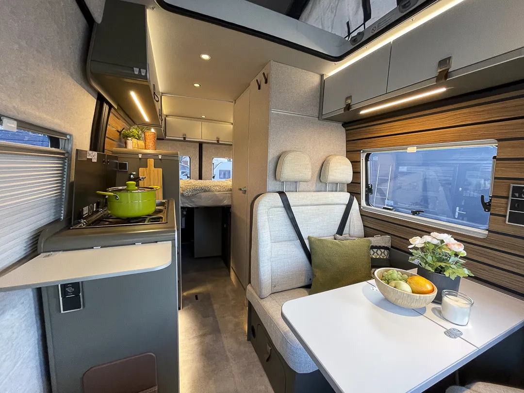 * Innen empfängt einen die wohnliche Kombination aus Indiana-Bezügen und dem eleganten Dekor Ivy Green. Das Querbett im Heck ist großzügig, warm und hervorragend isoliert – dank starkem Wand- und Dachaufbau, isoliertem Boden und hochwertigen Aluminium-Rahmenfenstern. Die seitliche Sitzgruppe mit Mercedes-Komfortsitzen schafft eine gemütliche Lounge-Atmosphäre, während die vielen Dachhauben den Innenraum hell und offen wirken lassen.