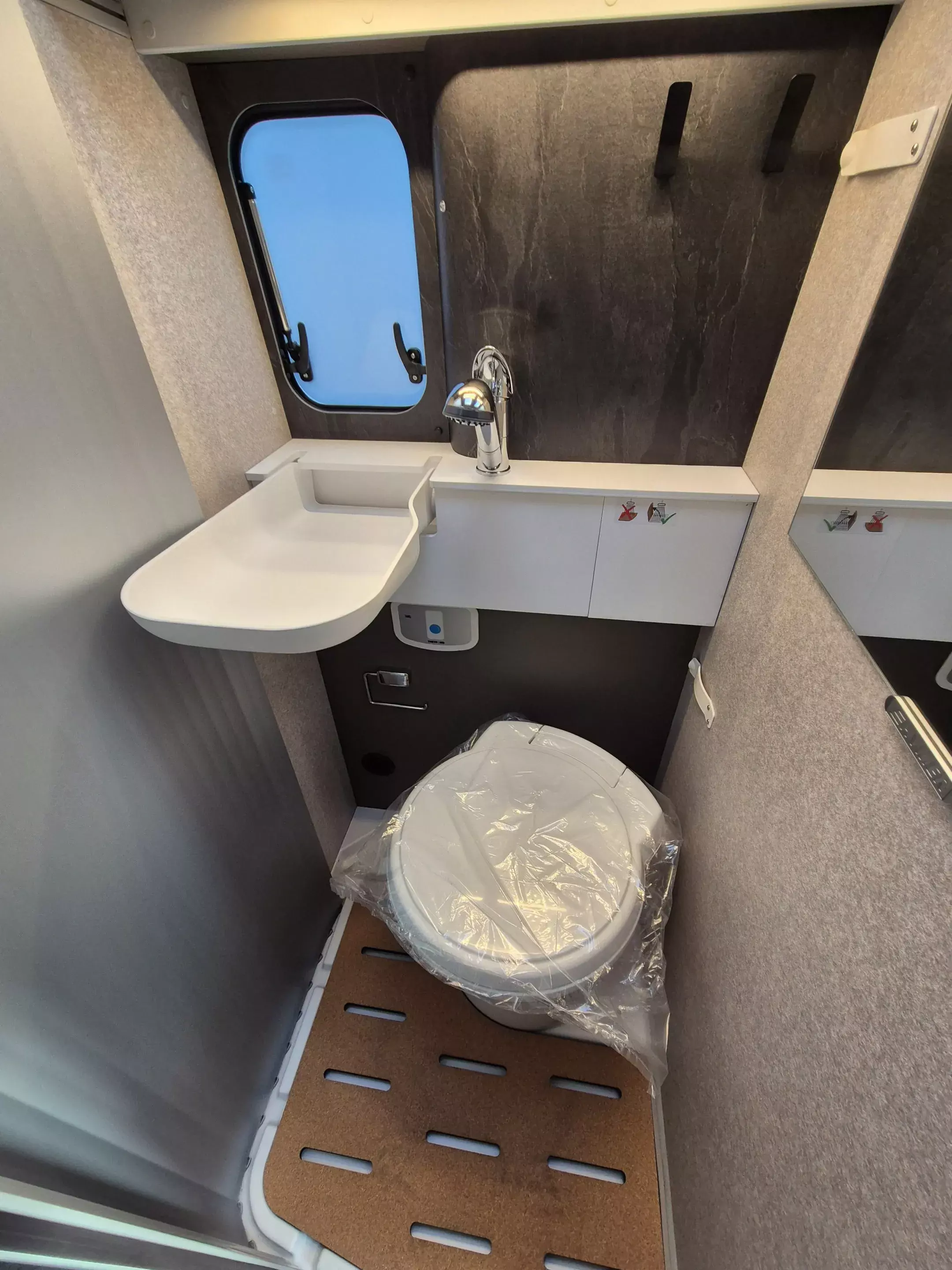 - Ausstellfenster im Heck in Fahrtrichtung rechts inkl. Vedunkelungsrollo und Mückenschutz