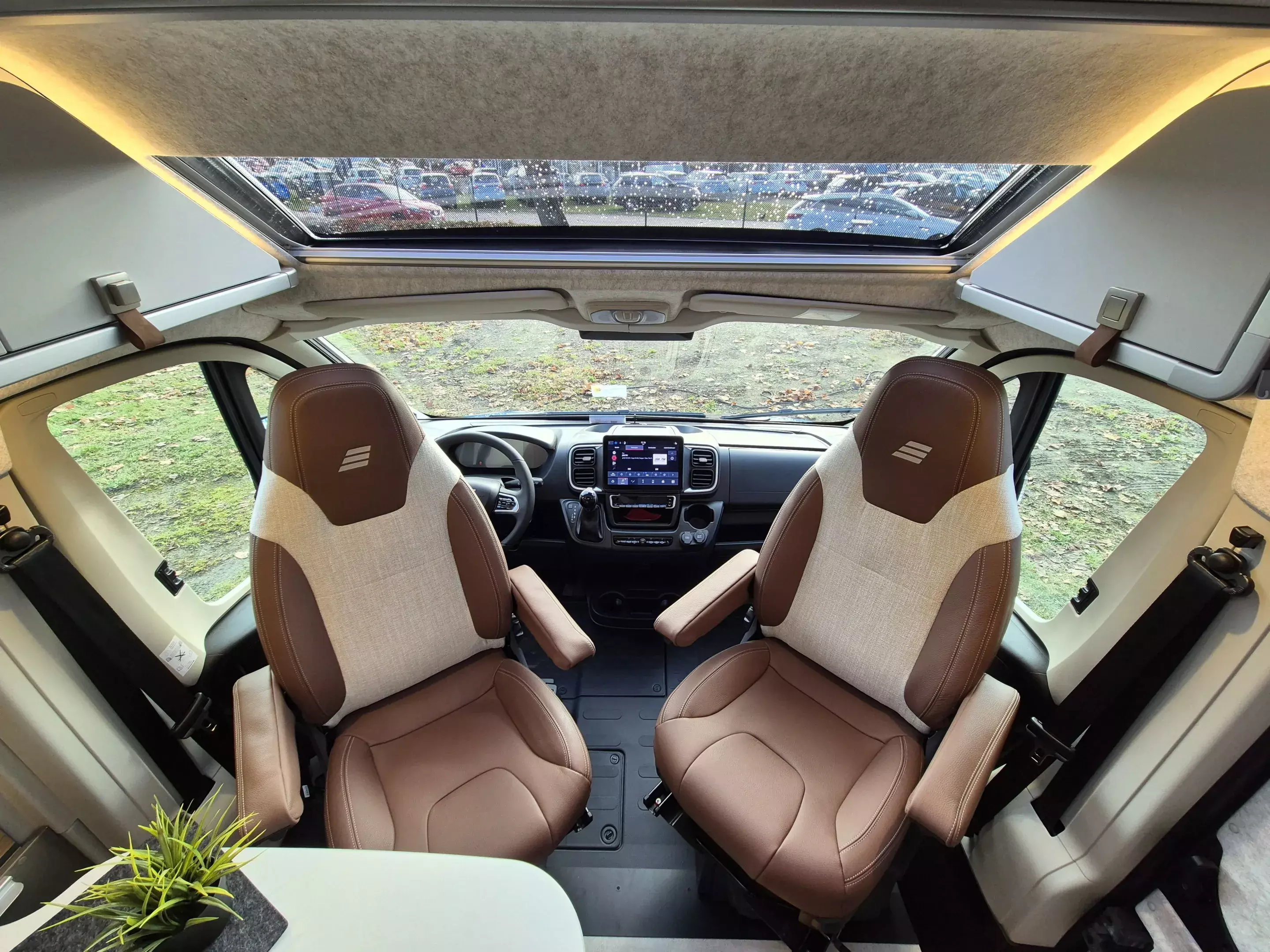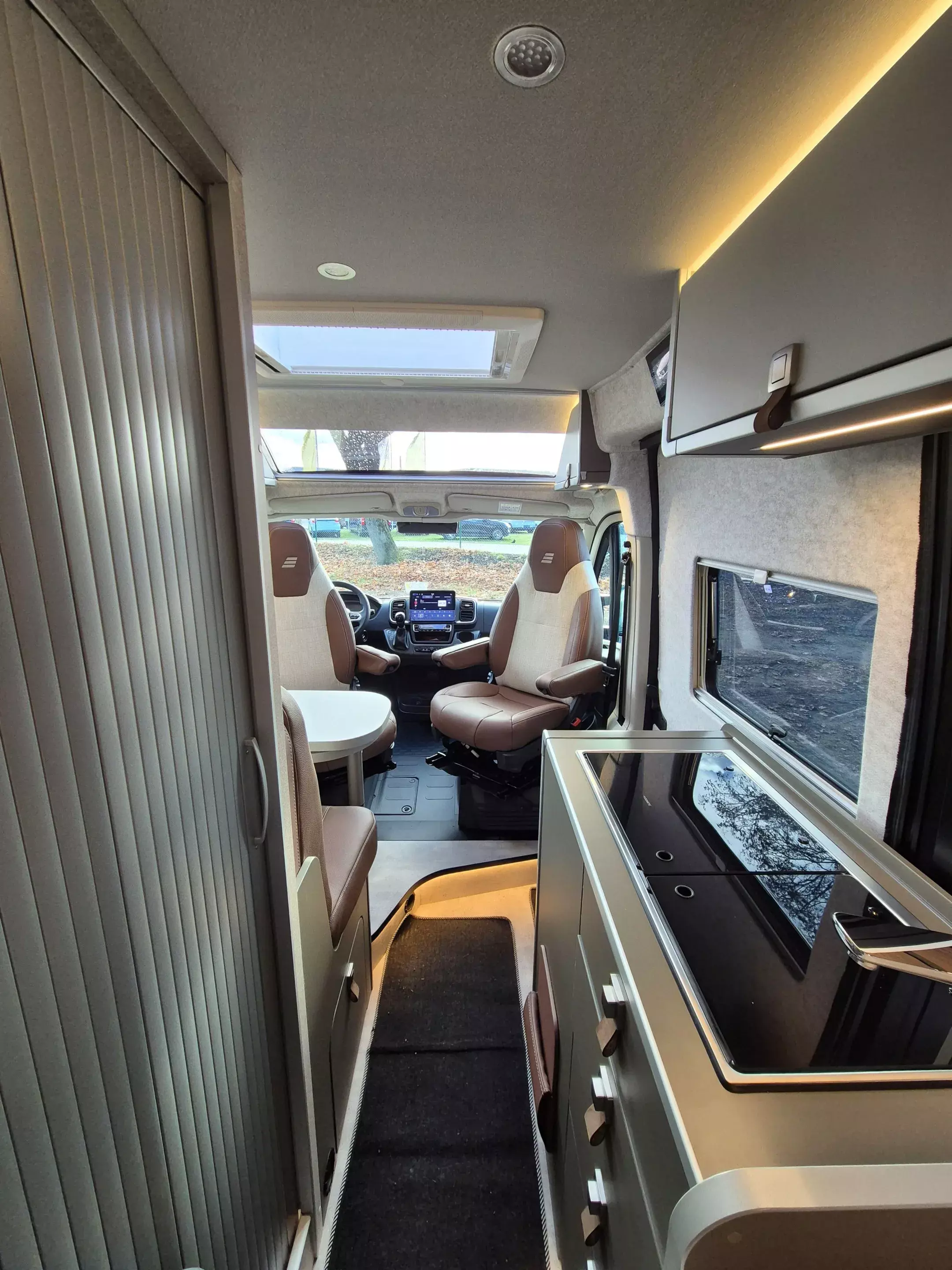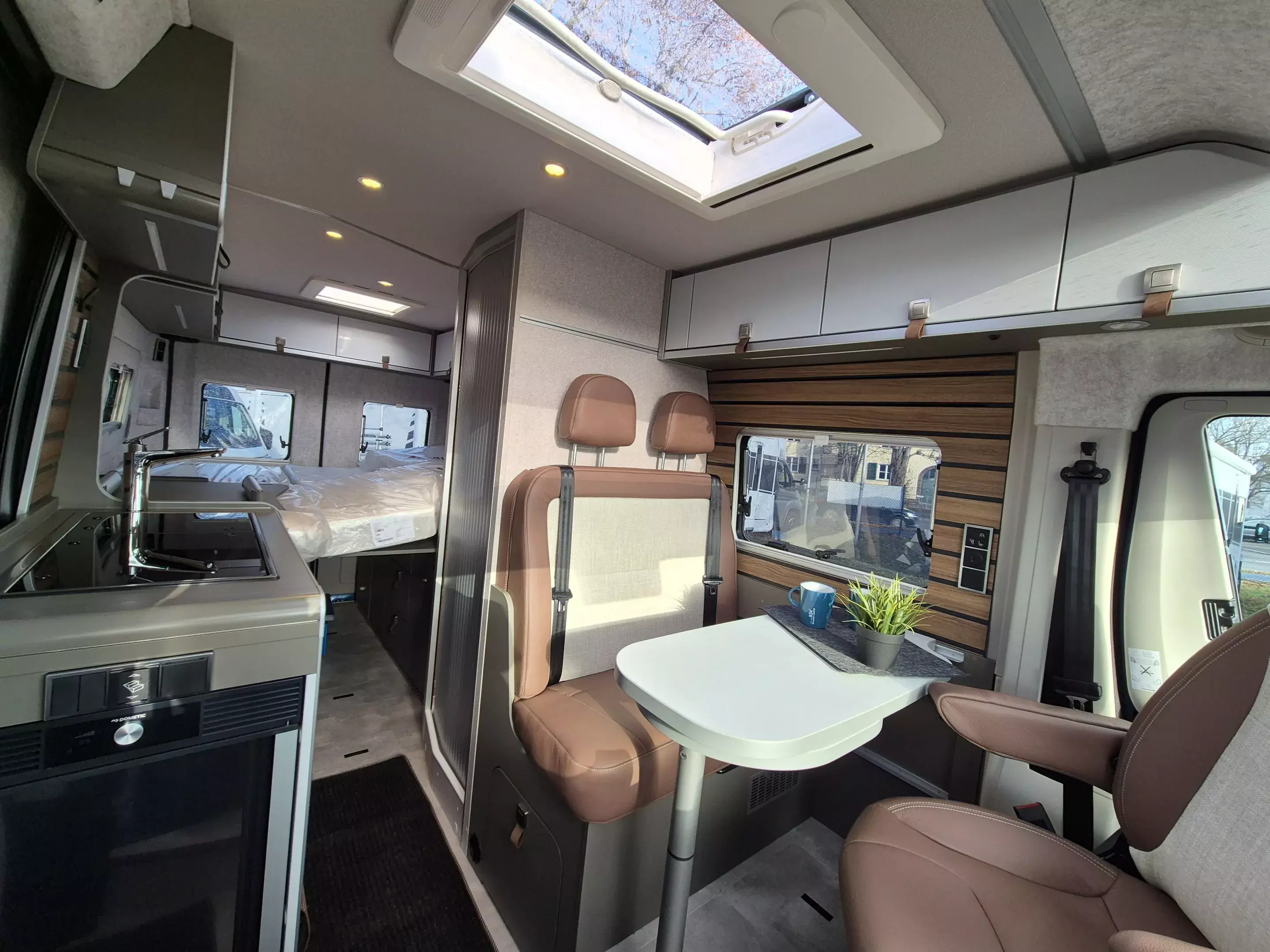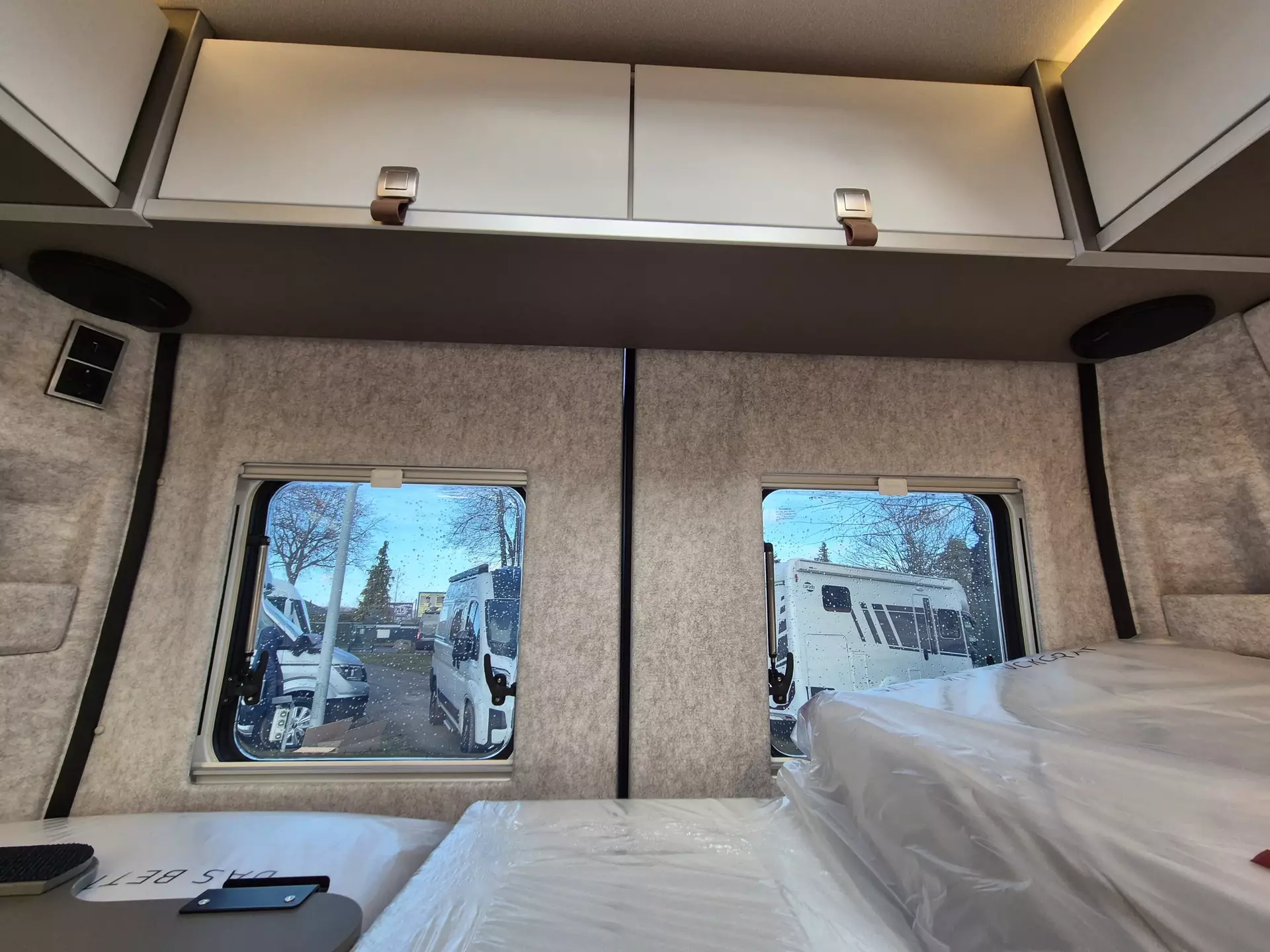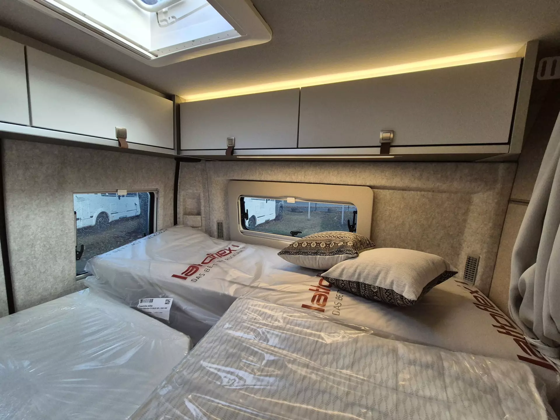 - Wohnkomfort Paket: Skyview Fenster Fahrerhaus inkl. Verdunklung; Ambient-Light-System: Mehr-Ebenen Lichtsystem mit dynamischer und individueller Steuerung der Beleuchtung (inkl. Lichttemperatur) sowie stimmungsvoller Sockelbeleuchtung; Wohnwelt "HOME" (2 Kissen und Stofftasche); Spannbettlaken nach Maß für Heckbetten individuell an Matratzen angepasst; Einlegeboden mit Korkoberfläche