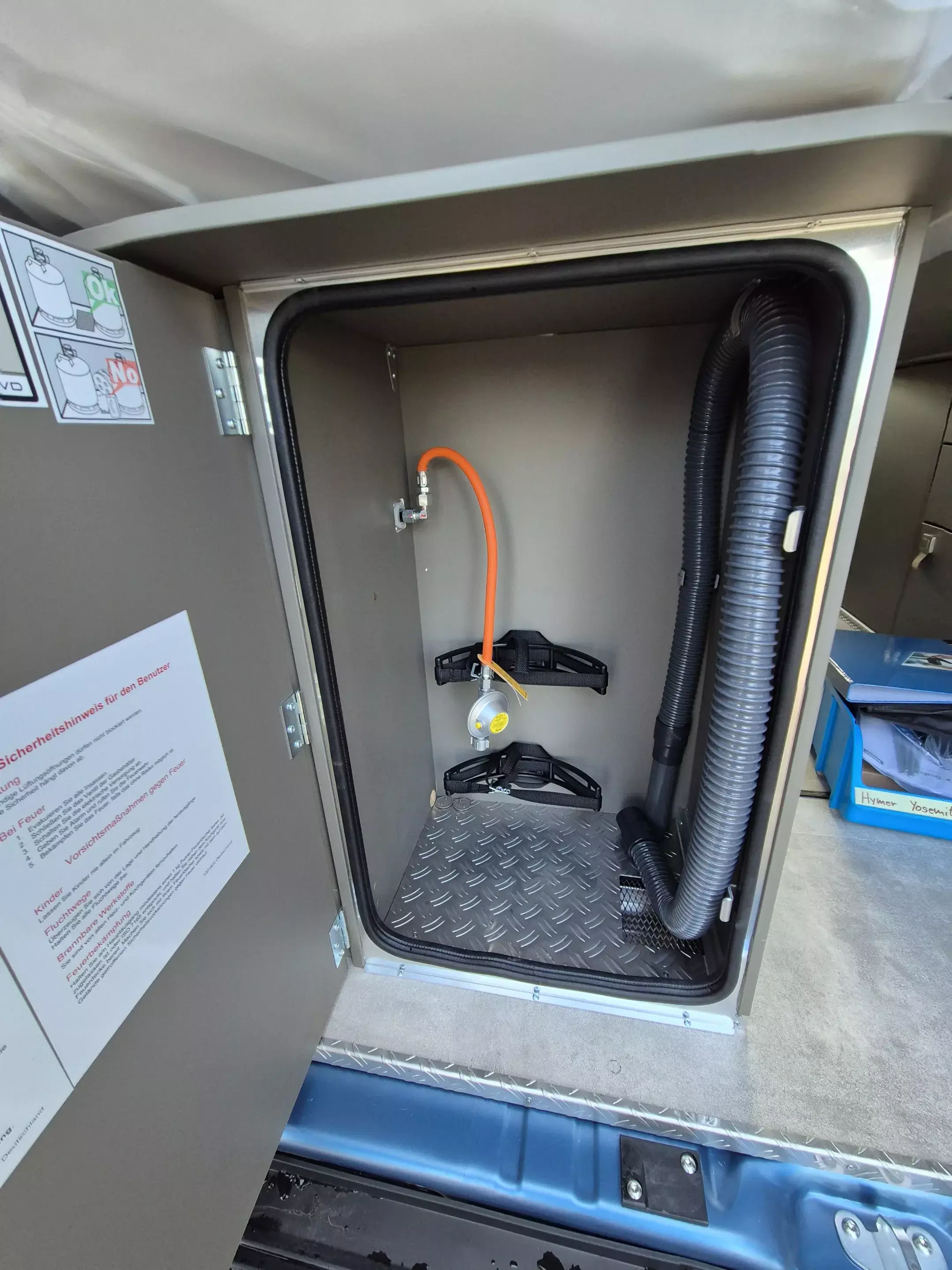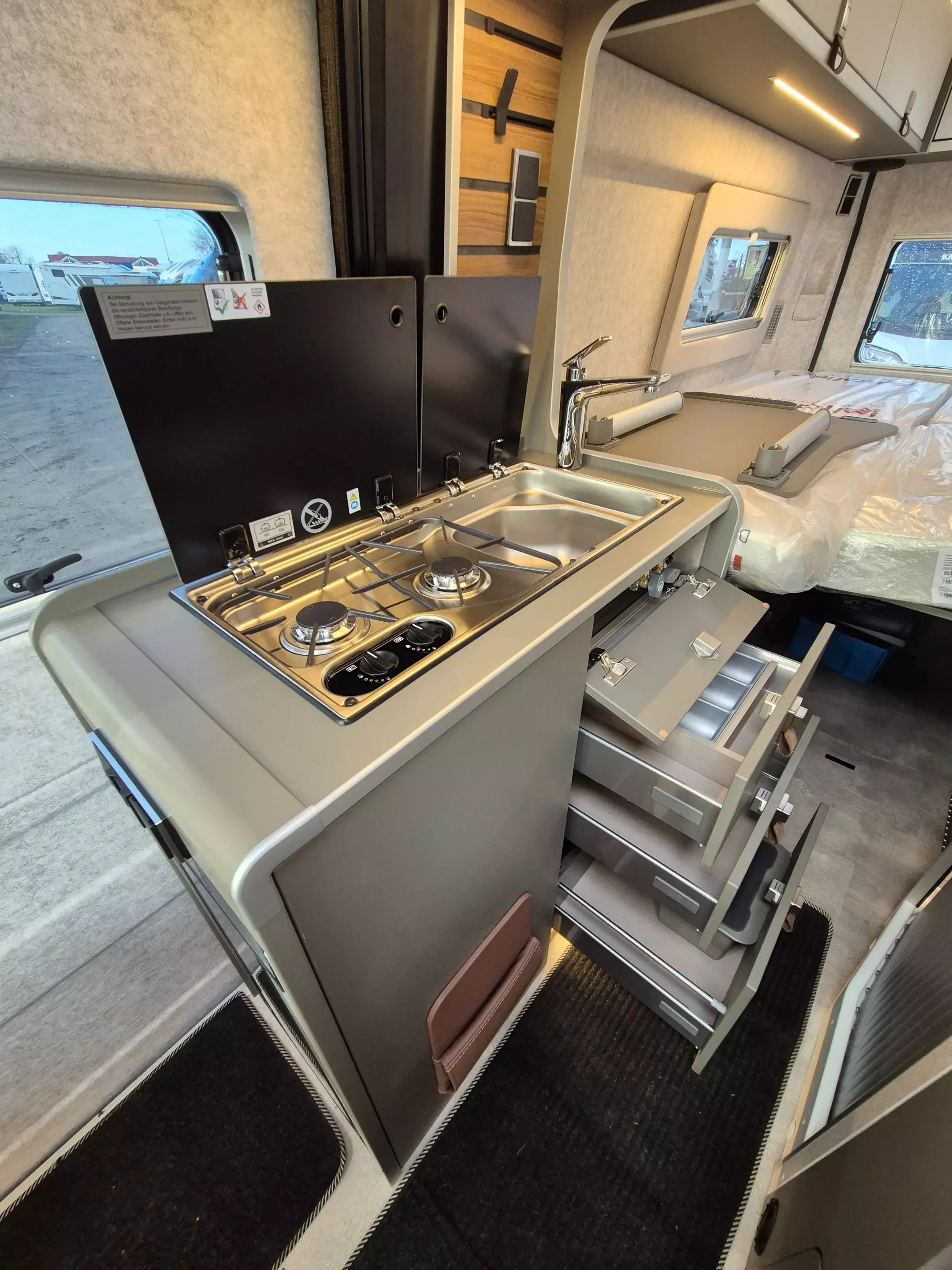 - 6 KW Diesel-Warmluftheizung mit 10l Warmwasserboiler, 1.800 Watt Elektroheizstab und kompakter Gaskasten für 6kg-Gasflasche sowie 3 Stauraum-Schubladen