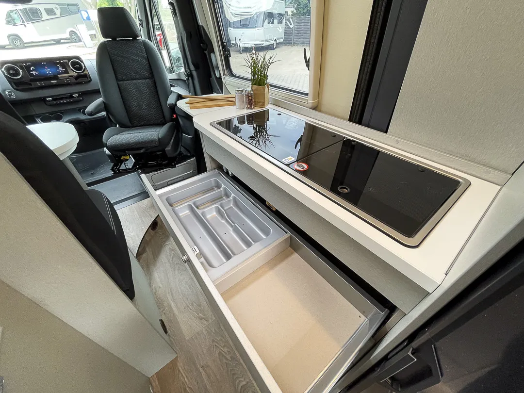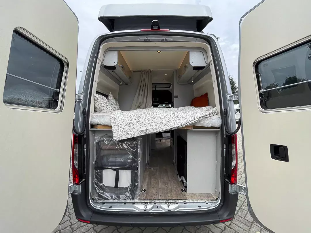 Praktische Details wie das GFK-Aufstelldach mit Schaumkern-Isolierung, isolierte Aluminium-Rahmenfenster, elektrisch anklappbare Außenspiegel, beheizbarer Abwassertank, Dieselheizung mit Warmwasserboiler, zahlreiche USB- und 230V-Steckdosen sowie ein durchdachtes Stauraumkonzept machen das Reisen besonders komfortabel. Das MBUX Multimedia-System mit Navigation, Sitzheizung, Lordosenstütze und viele weitere Extras runden das Gesamtpaket ab.