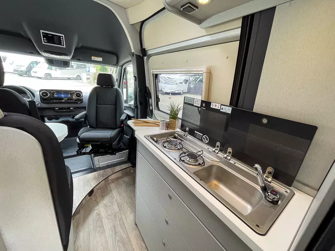 Praktische Details wie das GFK-Aufstelldach mit Schaumkern-Isolierung, isolierte Aluminium-Rahmenfenster, elektrisch anklappbare Außenspiegel, beheizbarer Abwassertank, Dieselheizung mit Warmwasserboiler, zahlreiche USB- und 230V-Steckdosen sowie ein durchdachtes Stauraumkonzept machen das Reisen besonders komfortabel. Das MBUX Multimedia-System mit Navigation, Sitzheizung, Lordosenstütze und viele weitere Extras runden das Gesamtpaket ab.