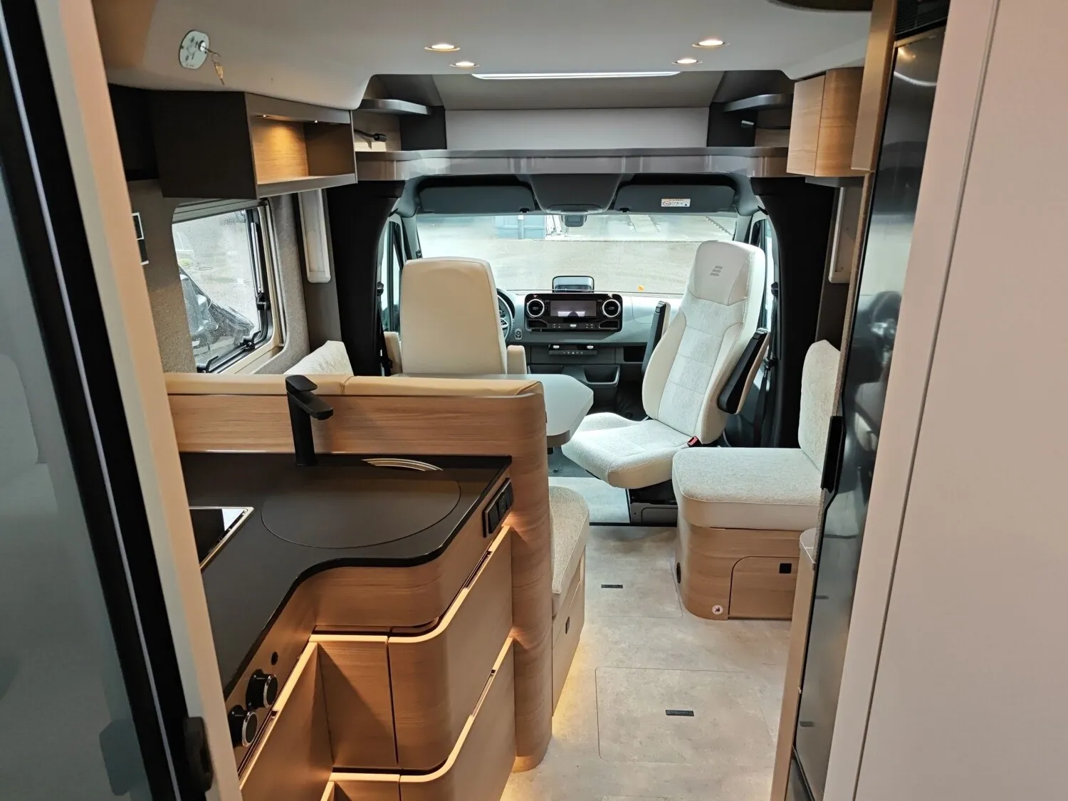 - Pilotensitze in Wohnraumstoff, dreh-/höhen- und neigungsverstellbar mit 2 Armlehnen sowie Sitzheizung und Lordosenverstellung