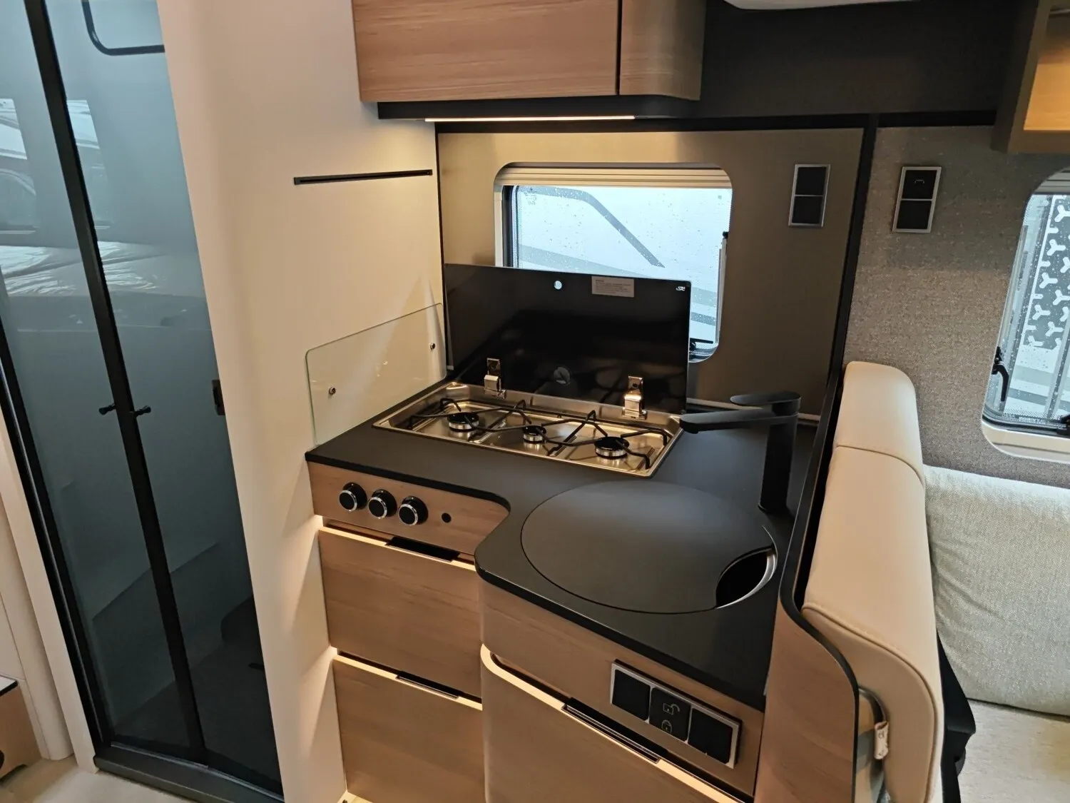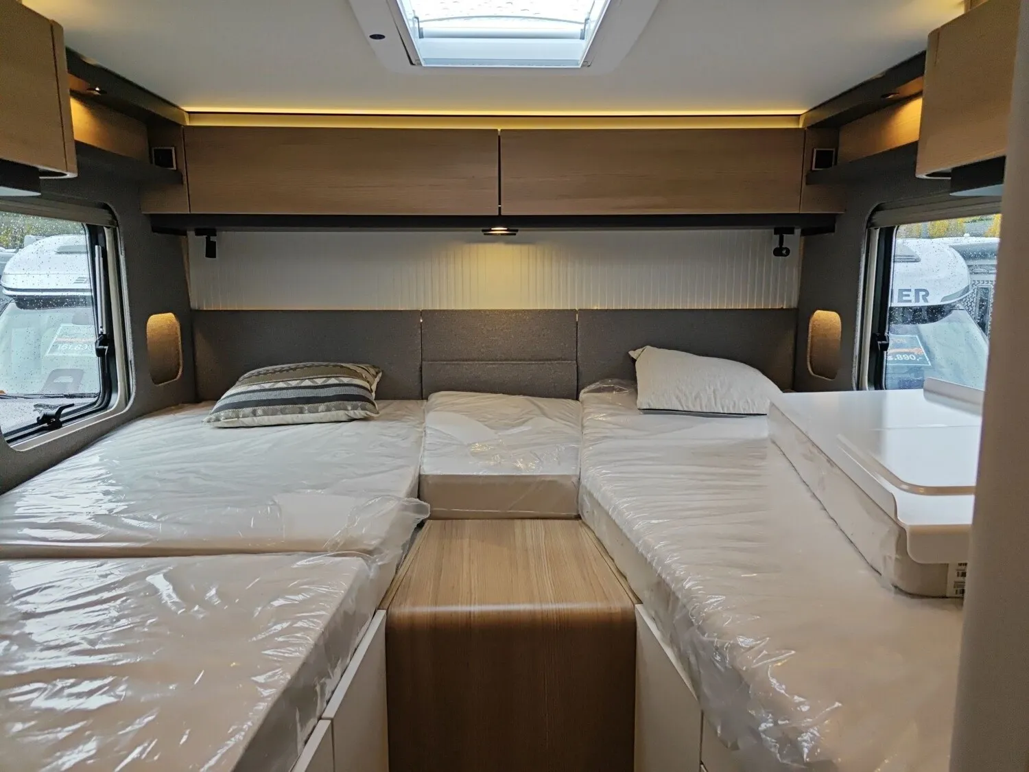 - Wohnkomfort-Paket (Filzverkleidung in Heckgarage, Spannbettlaken nach Maß für Heckbetten individuell an Matratzen angepasst, 4 Kissen mit Bezug, Ambient-Light-System: Mehr-Ebenen Lichtsystem mit dynamischer und individueller Steuerung der Beleuchtung (inkl. Lichttemperatur) sowie stimmungsvoller Sockelbeleuchtung, 4 x 230 V / 2 x Doppel-USB Zusatzsteckdosen)