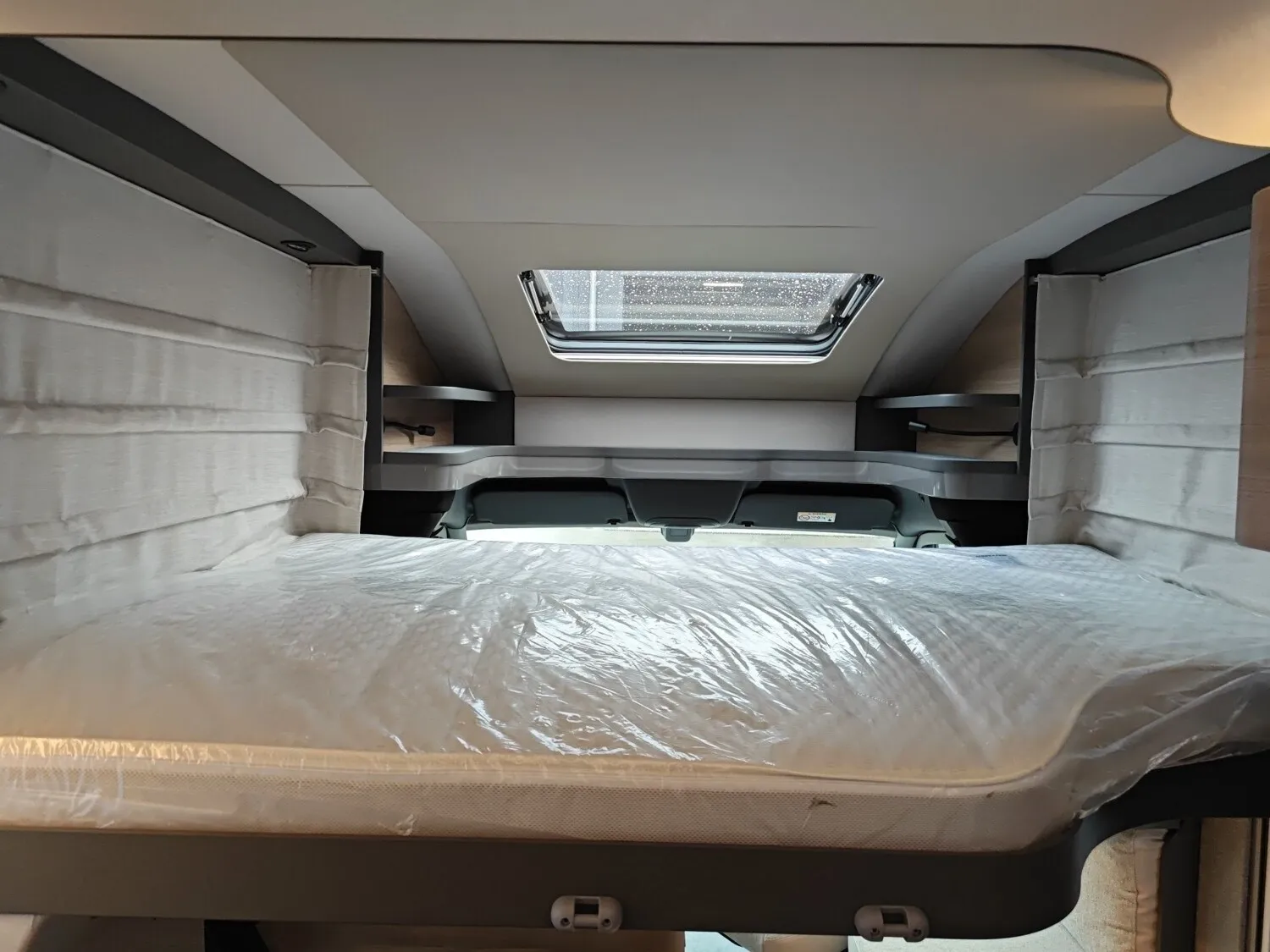 - Absenkbares Doppelbett über der Sitzgruppe mit Kaltschaummatratze (elektrische Ausführung) inkl. Dachintegration