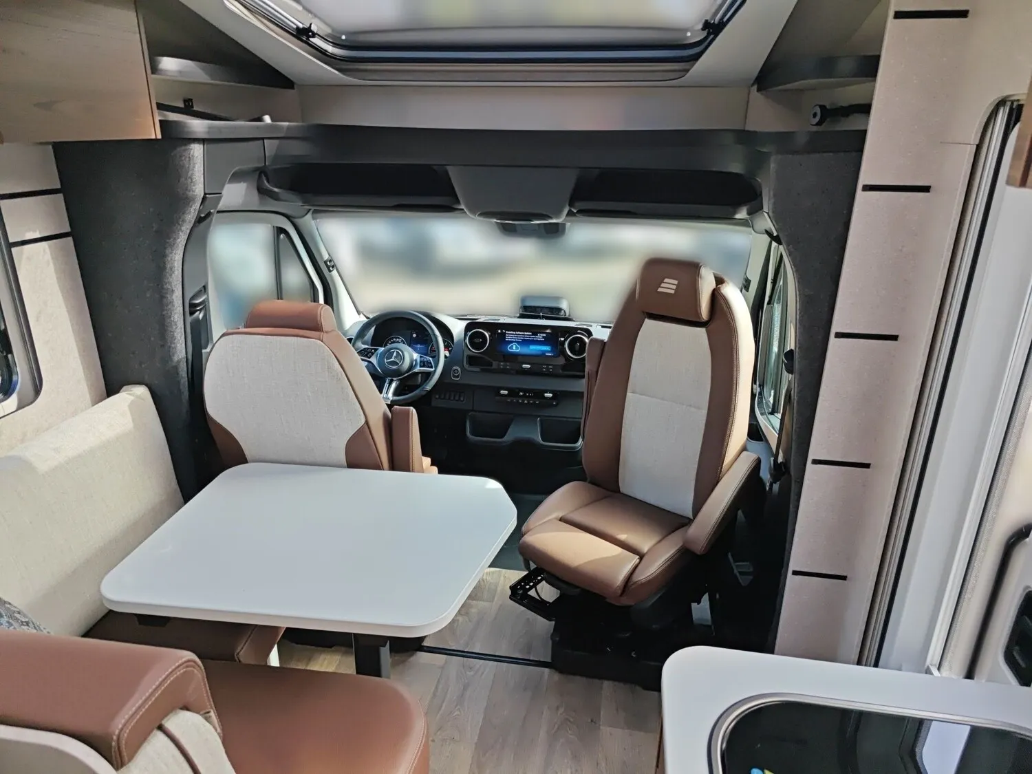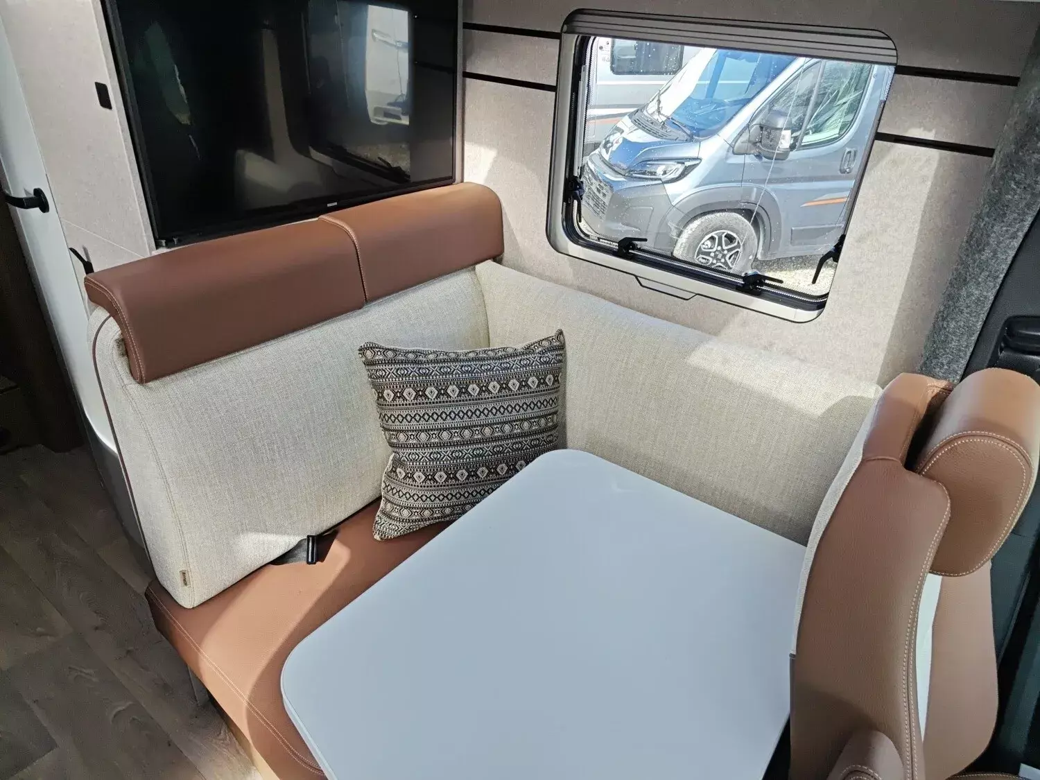 - Bettenbau für Komfort L-Sitzgruppe inkl. Zusatzpolster und absenkbarem Tisch unter Einbeziehung des Fahrersitzes
