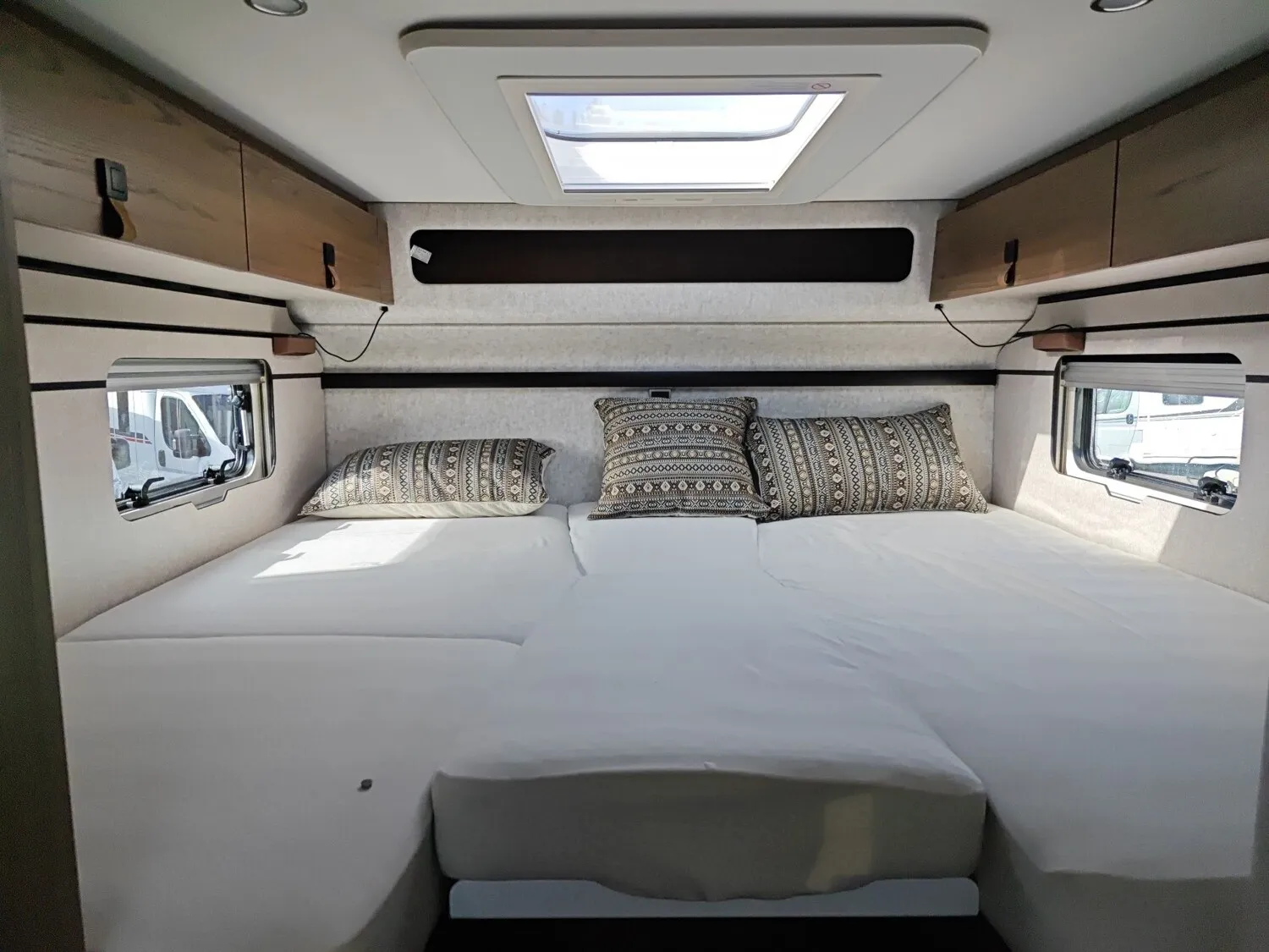 - Wohnkomfort-Paket (Schlafsystem mit Tellerfederrost für Heckbett(en), Spannbettlaken nach Maß für Heckbetten individuell an Matratzen angepasst, Filzverkleidung in Heckgarage, Einlegeboden in der Dusche für ebenen Laufboden, 4 Kissen mit Bezug, Ambient-Light-System: Mehr-Ebenen Lichtsystem mit dynamischer und individueller Steuerung der Beleuchtung (inkl. Lichttemperatur) sowie stimmungsvoller Sockelbeleuchtung, Lichtpaket (Multifunktionale Pendelleuchte sowie eine Ambiente-Leseleuchte für die Multifunktionswände), 4 x 230 V / 1 x 12 V Zusatzsteckdosen)