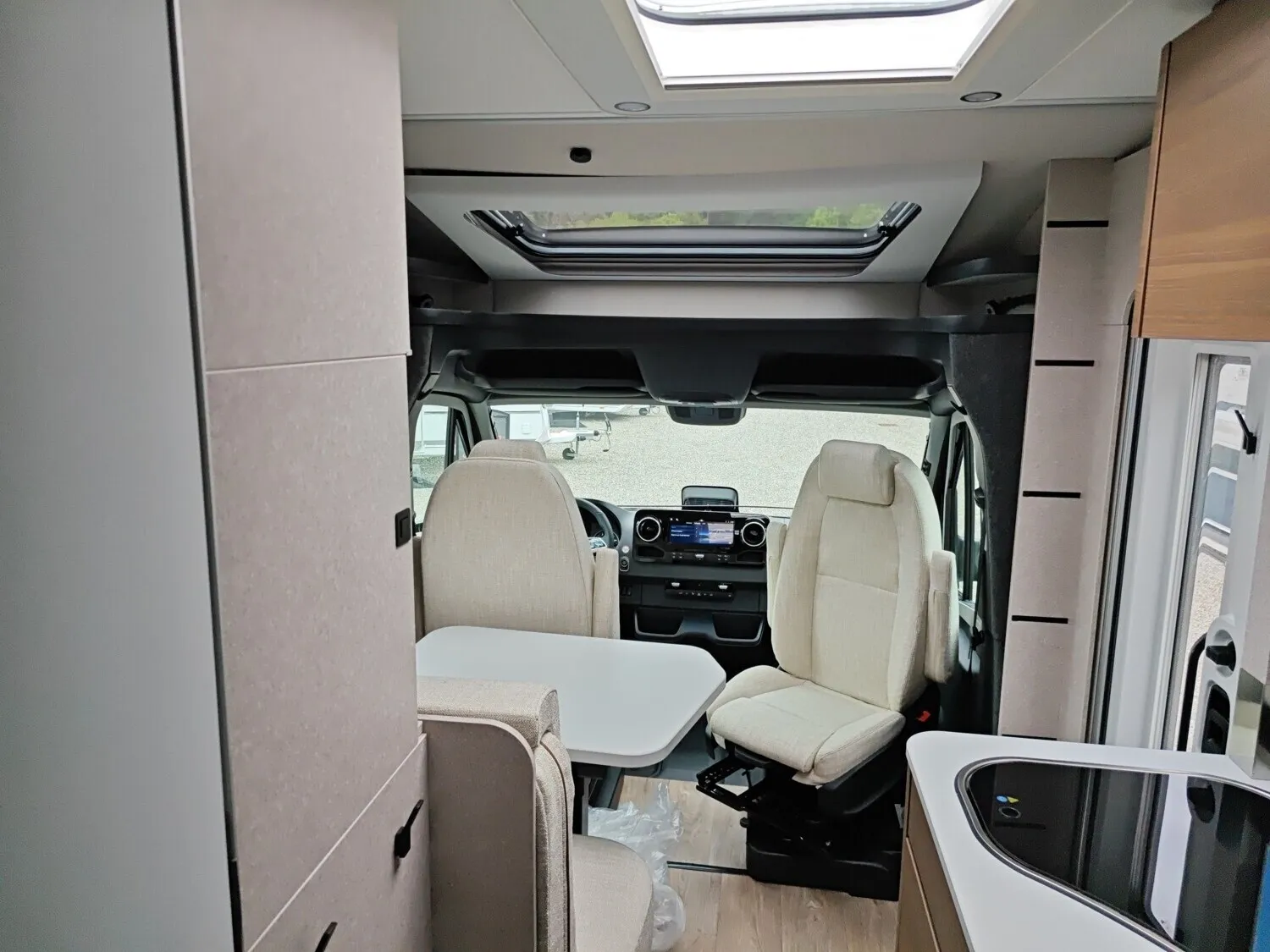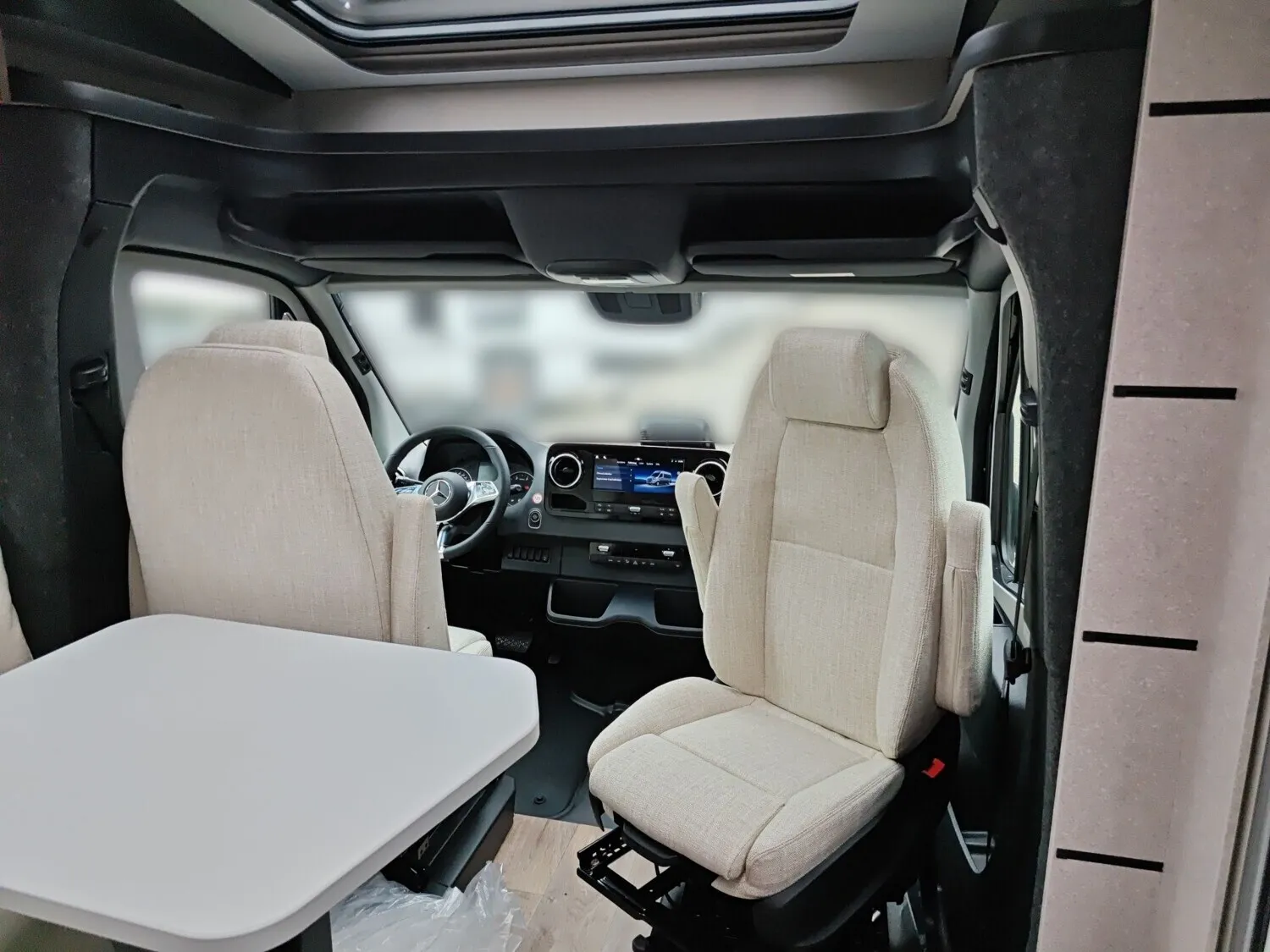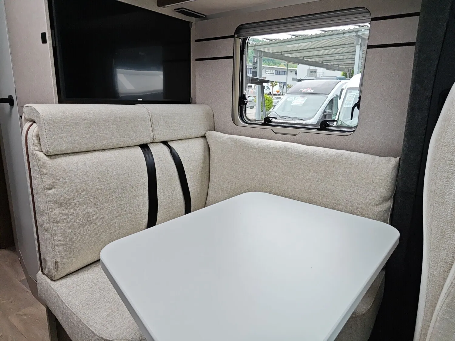 - Bettenbau für Komfort L-Sitzgruppe inkl. Zusatzpolster und absenkbarem Tisch unter Einbeziehung des Fahrersitzes