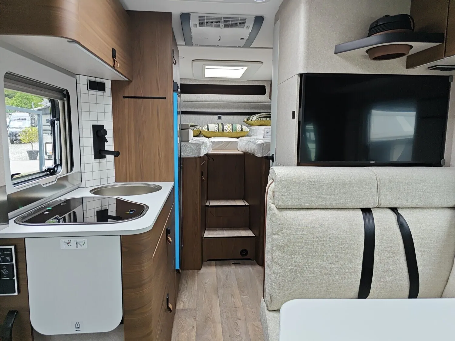 - Wohnkomfort-Paket (Schlafsystem mit Tellerfederrost für Heckbett(en), Spannbettlaken nach Maß für Heckbetten individuell an Matratzen angepasst, Filzverkleidung in Heckgarage, Einlegeboden in der Dusche für ebenen Laufboden, 4 Kissen mit Bezug, Ambient-Light-System: Mehr-Ebenen Lichtsystem mit dynamischer und individueller Steuerung der Beleuchtung (inkl. Lichttemperatur) sowie stimmungsvoller Sockelbeleuchtung, Lichtpaket (Multifunktionale Pendelleuchte sowie eine Ambiente-Leseleuchte für die Multifunktionswände), 3 x 230 V / 1 x 12 V Zusatzsteckdosen)