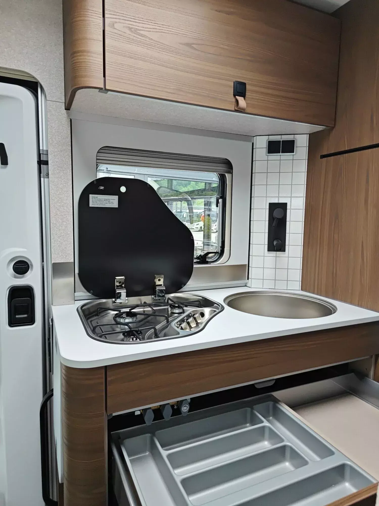 - Komfort-Eingangstür mit Fenster, Verdunkelungsrollo, integriertem Mülleimer und 2-fach Verriegelung