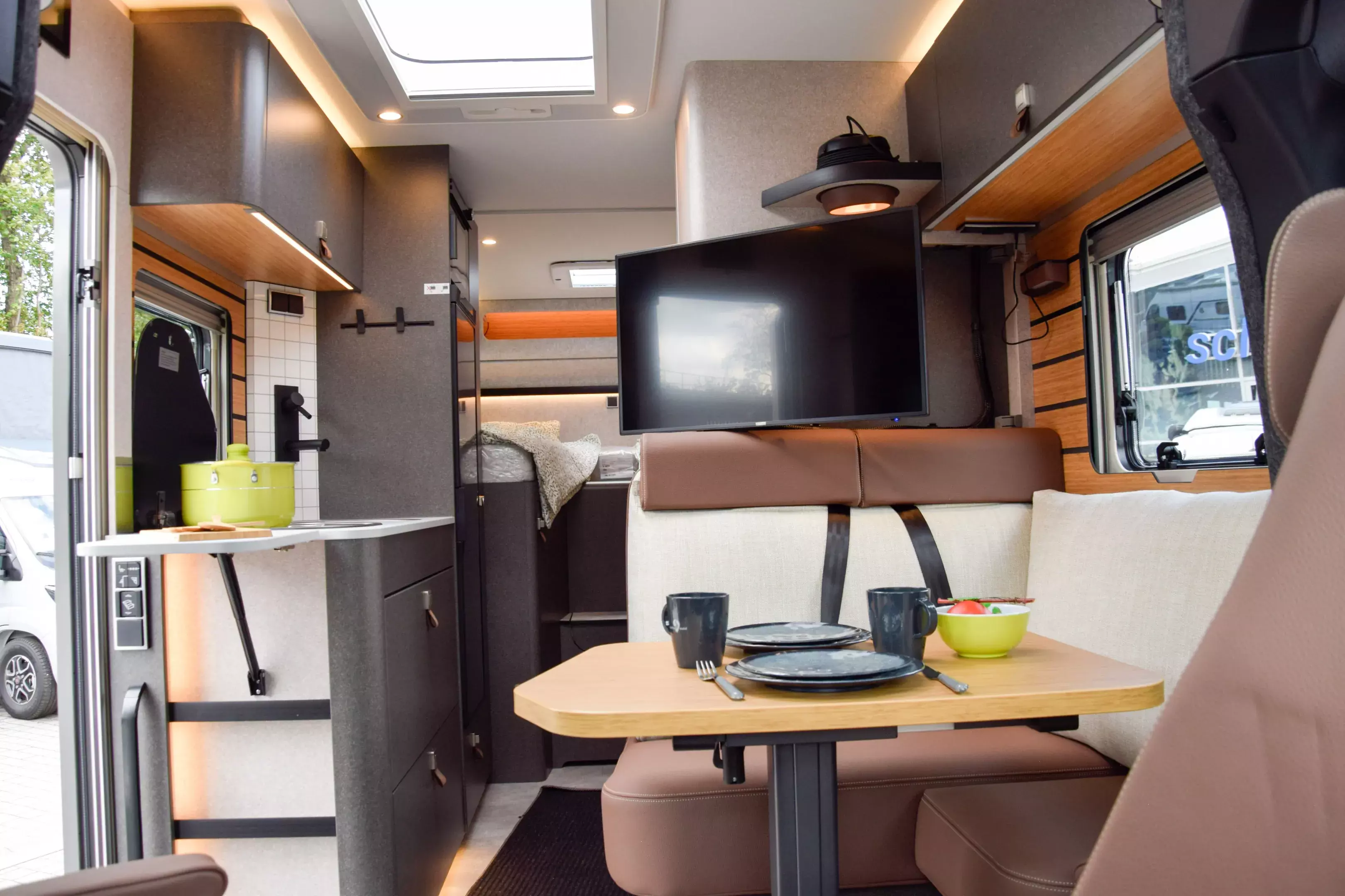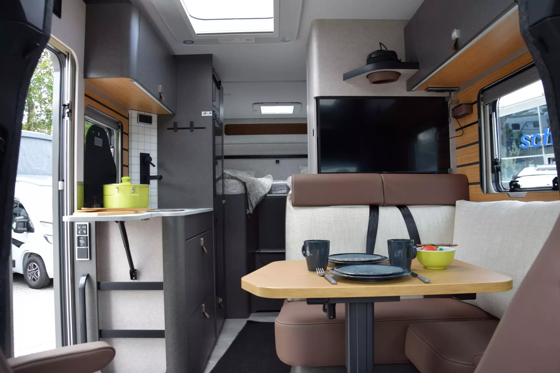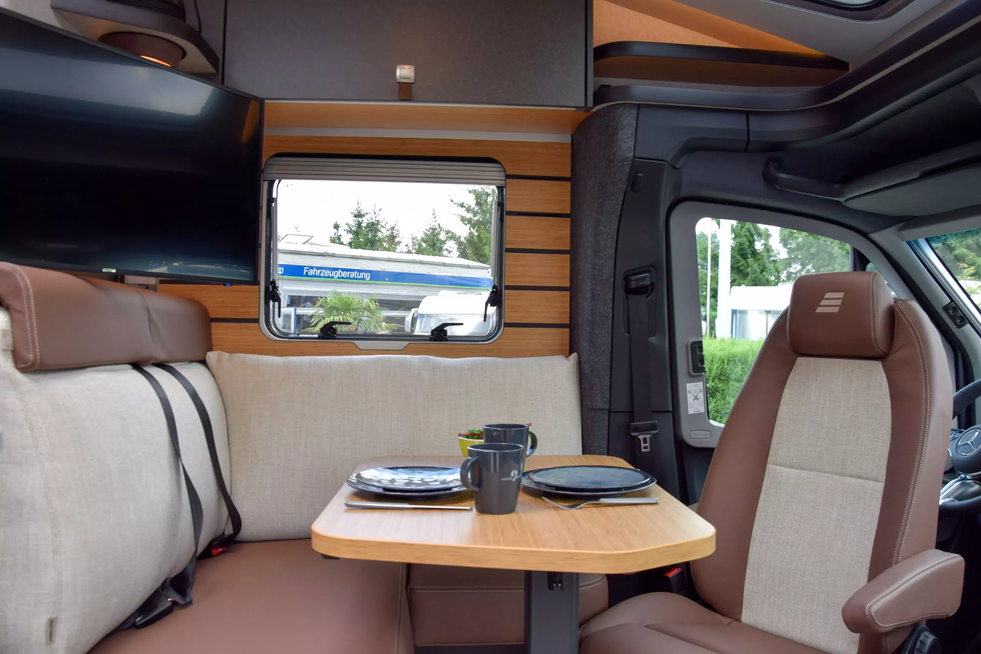 - Bettenbau für Komfort L-Sitzgruppe inkl. Zusatzpolster und absenkbarem Tisch unter Einbeziehung des Fahrersitzes