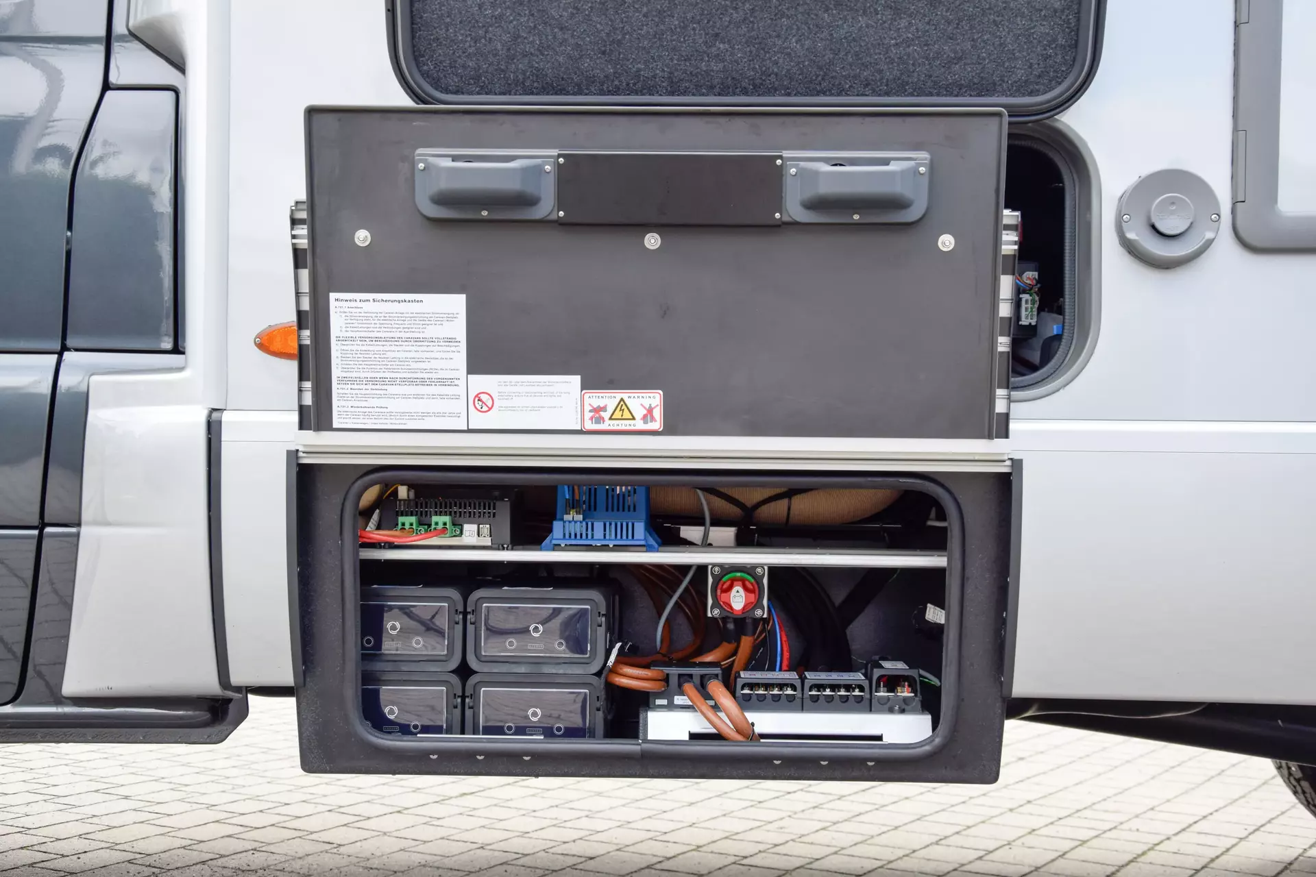 - Autarkie-Paket Lithium XL; HYMER-Smart-Battery-System 2.0: Zweite Aufbaubatterie 80 Ah LFP inkl. Zusatzlader; HYMER-Smart-Battery-System 2.0: Dritte Aufbaubatterie 160 Ah LFP; Wechselrichter 12 V auf 230 V, 1800 Watt mit Netzvorrangschaltung