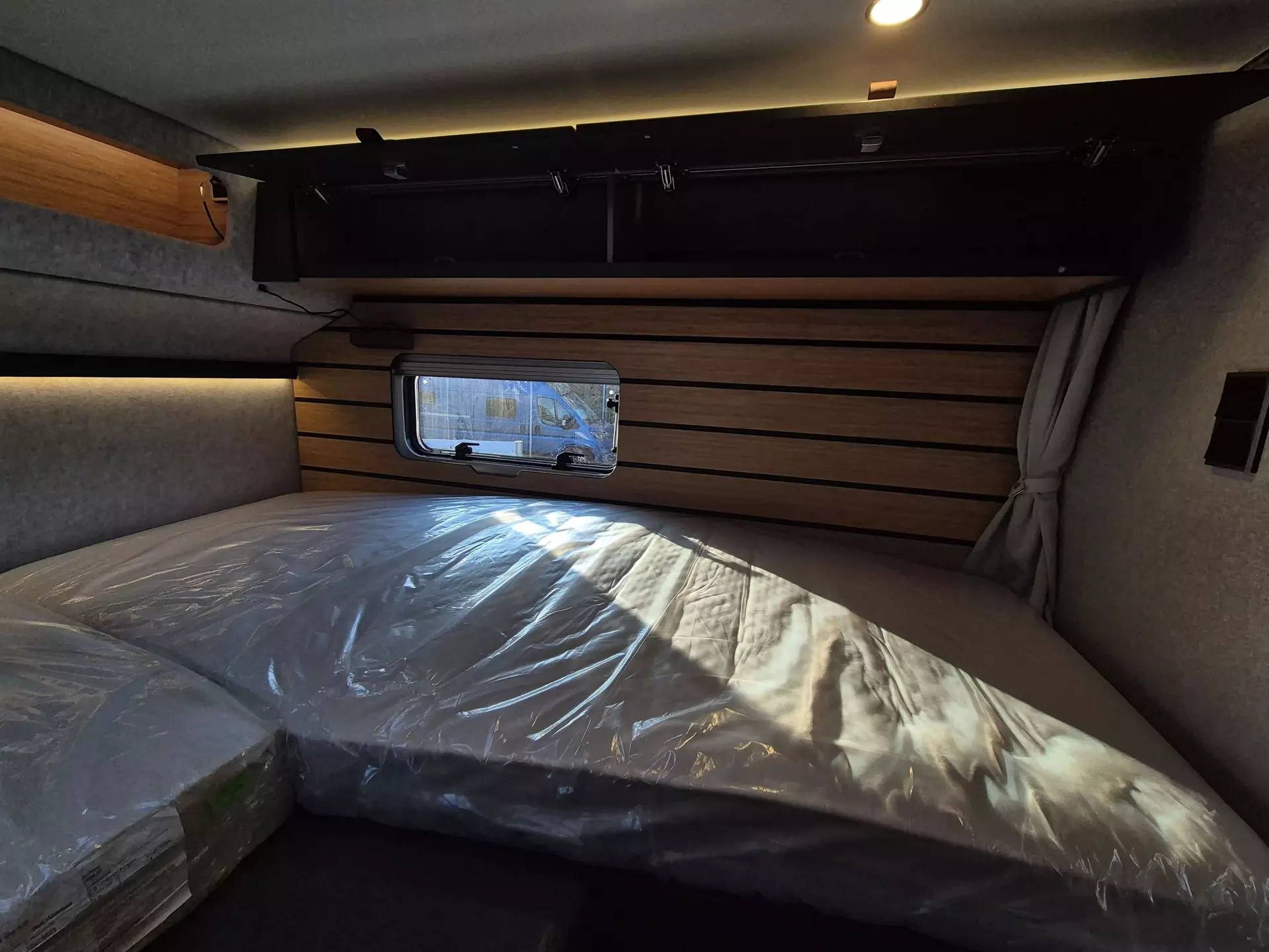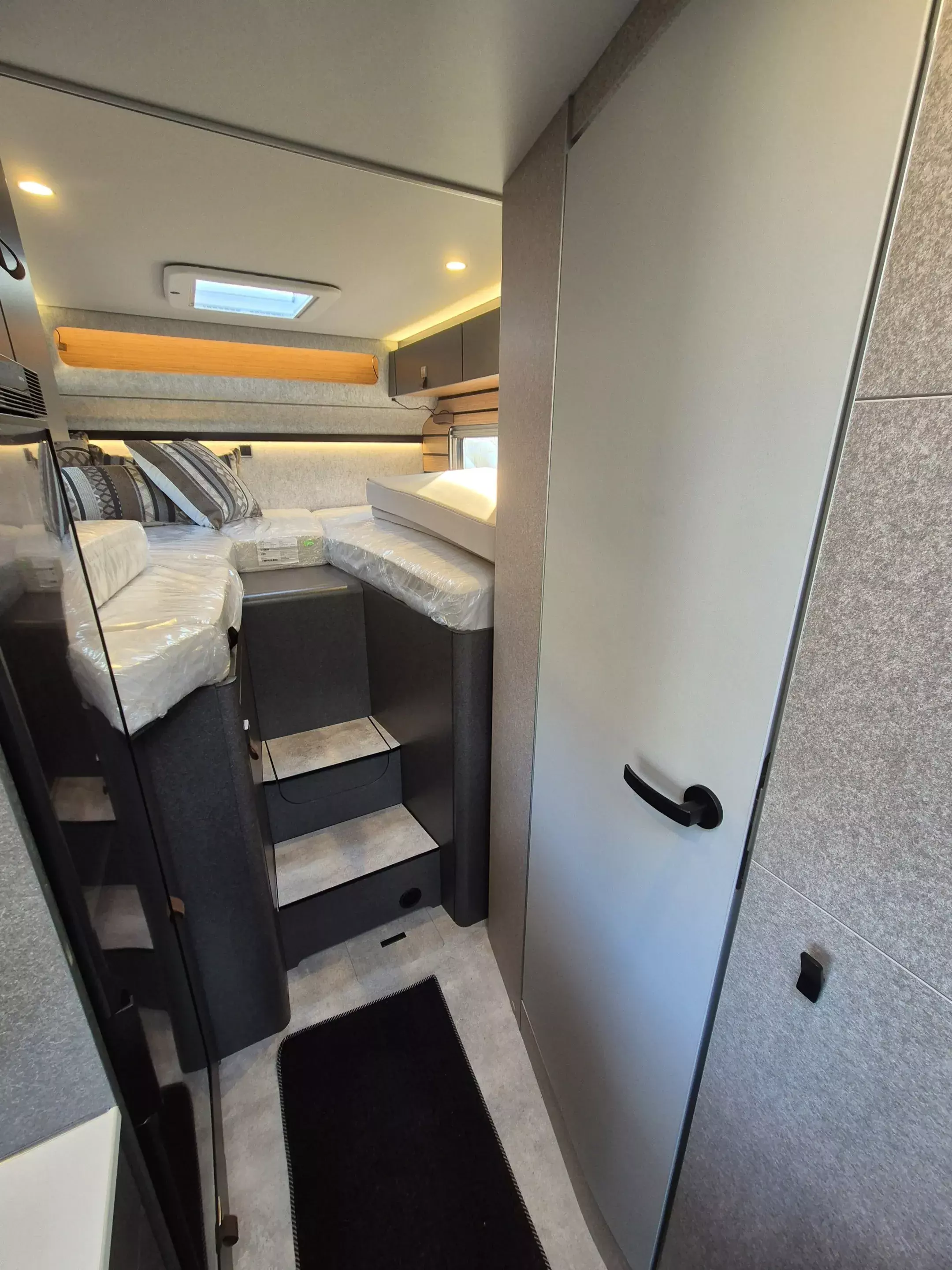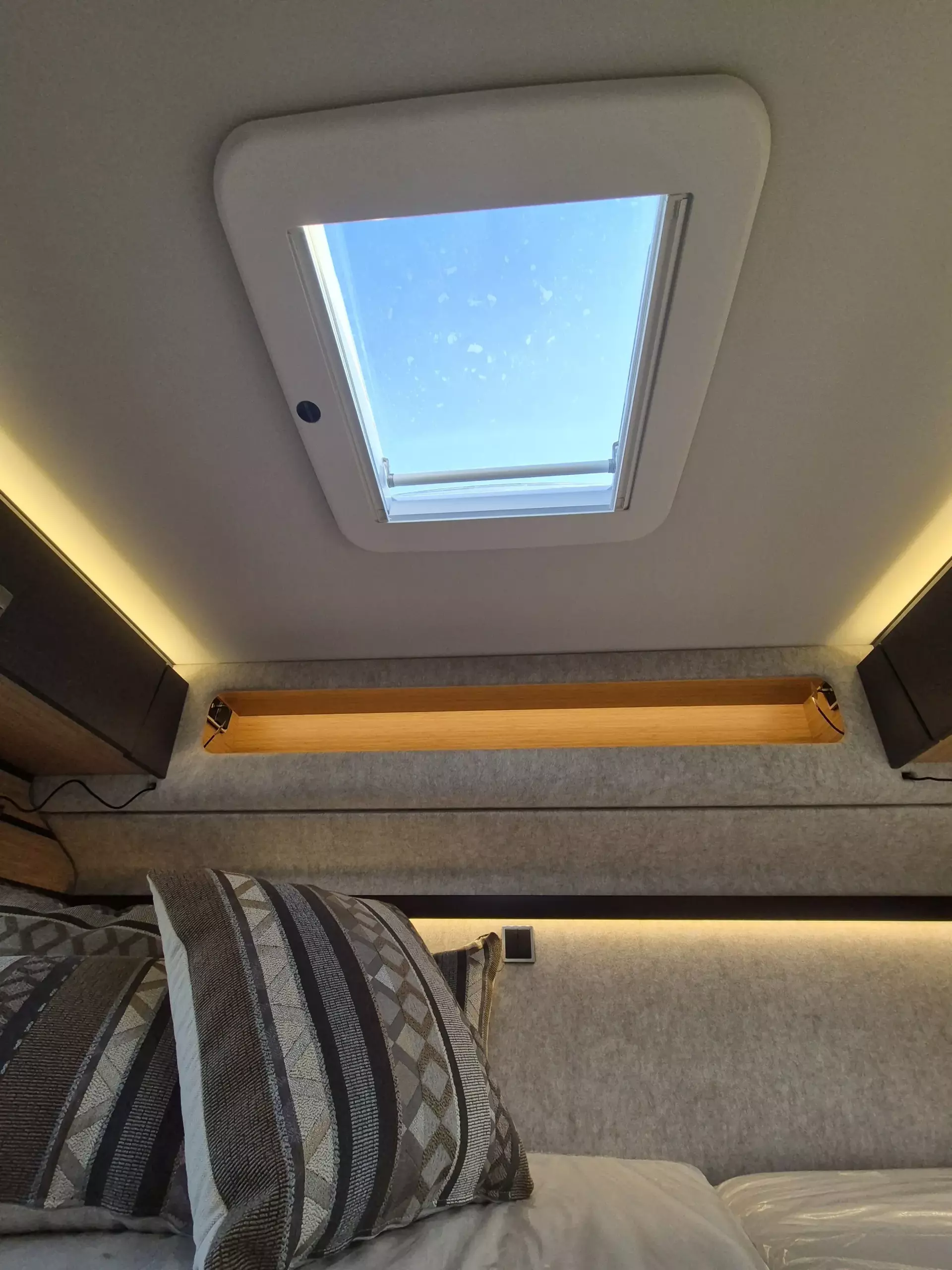 - Wohnkomfort-Paket: Schlafsystem mit Tellerfederrost für Heckbett(en); Spannbettlaken nach Maß für Heckbetten individuell an Matratzen angepasst; Filzverkleidung in Heckgarage; Einlegeboden in der Dusche für ebenen Laufboden; 4 Kissen mit Bezug; Ambient-Light-System: Mehr-Ebenen Lichtsystem mit dynamischer und individueller Steuerung der Beleuchtung (inkl. Lichttemperatur) sowie stimmungsvoller Sockelbeleuchtung; Lichtpaket (Multifunktionale Pendelleuchte sowie eine Ambiente-Leseleuchte für die Multifunktionswände); 3 x 230 V / 1 x 12 V Zusatzsteckdosen