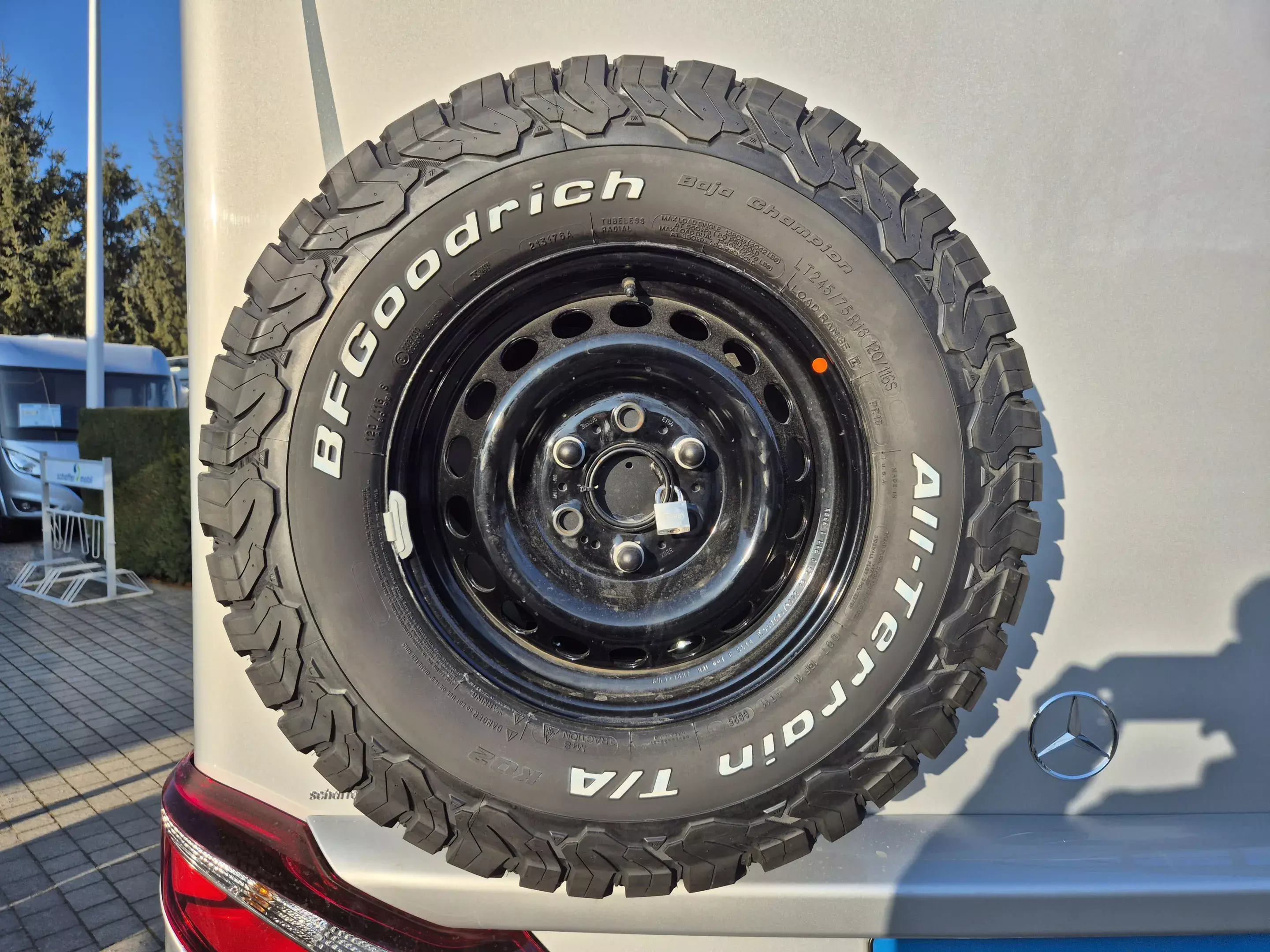 - 16'' Stahl Reserverad inkl. Stollenbereifung (All-Terrain) und Halterung außen an der Heckwand