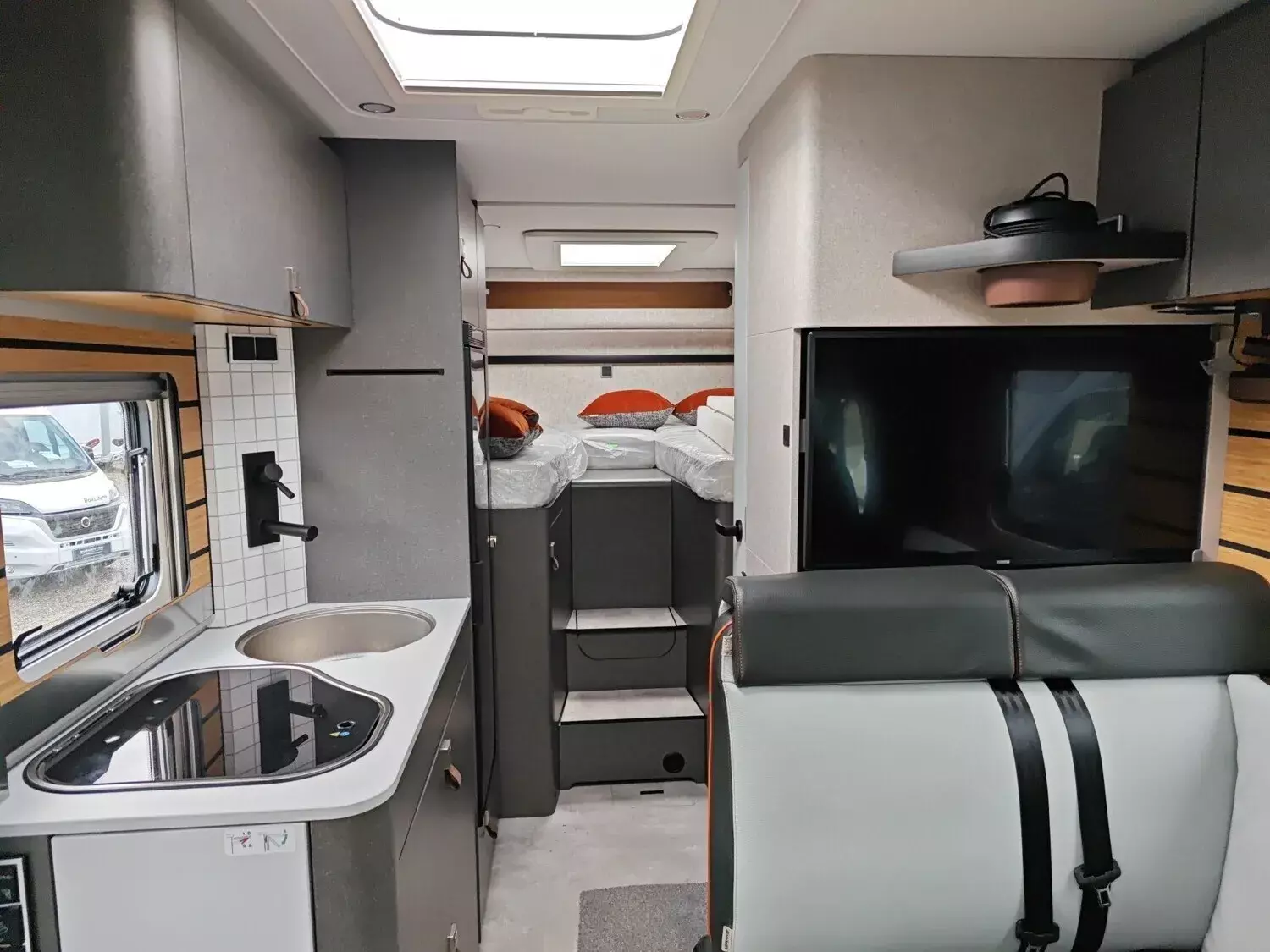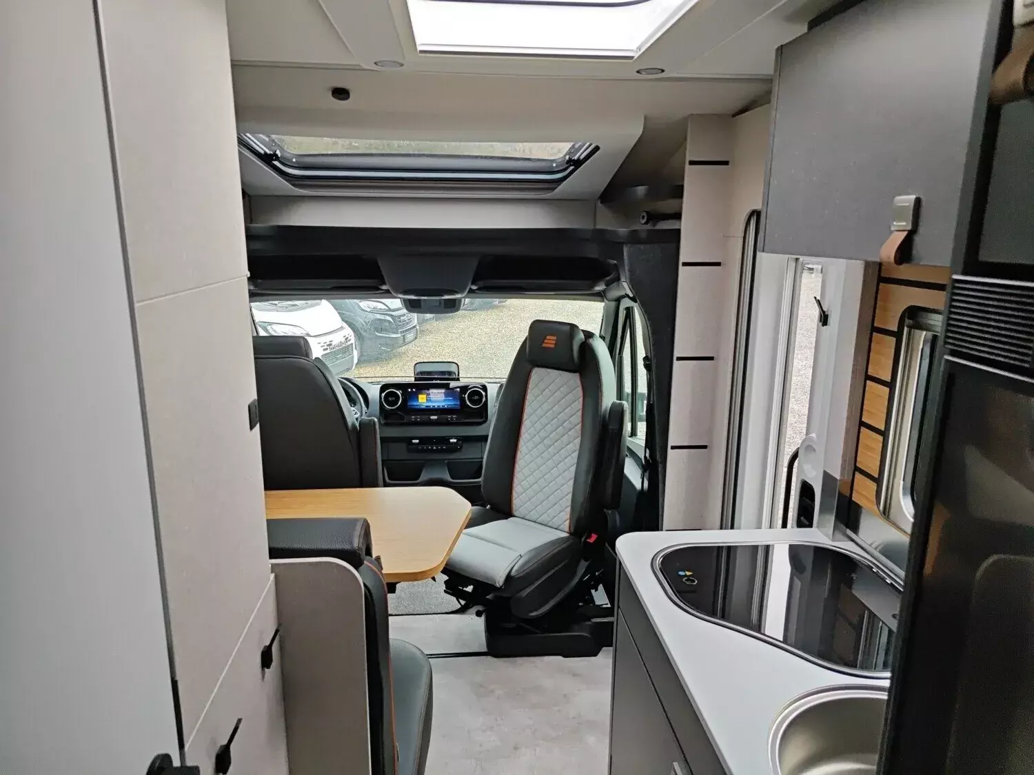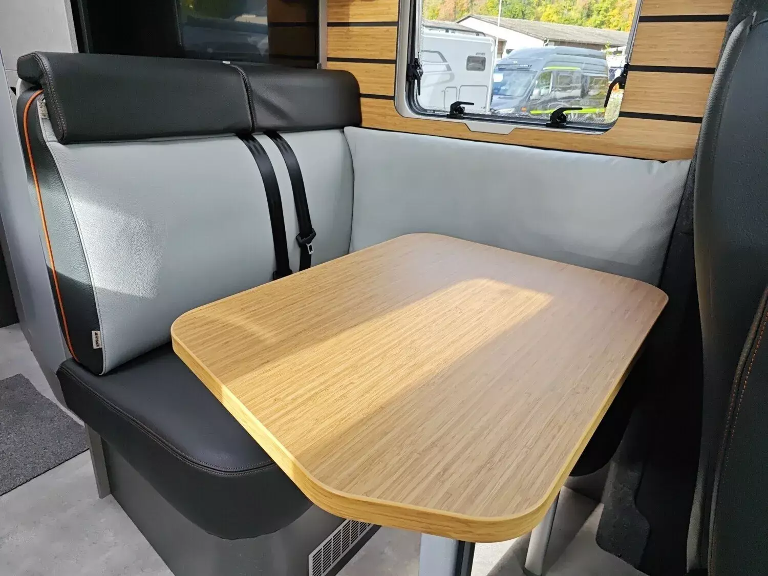 - Bettenbau für Komfort L-Sitzgruppe inkl. Zusatzpolster und absenkbarem Tisch unter Einbeziehung des Fahrersitzes