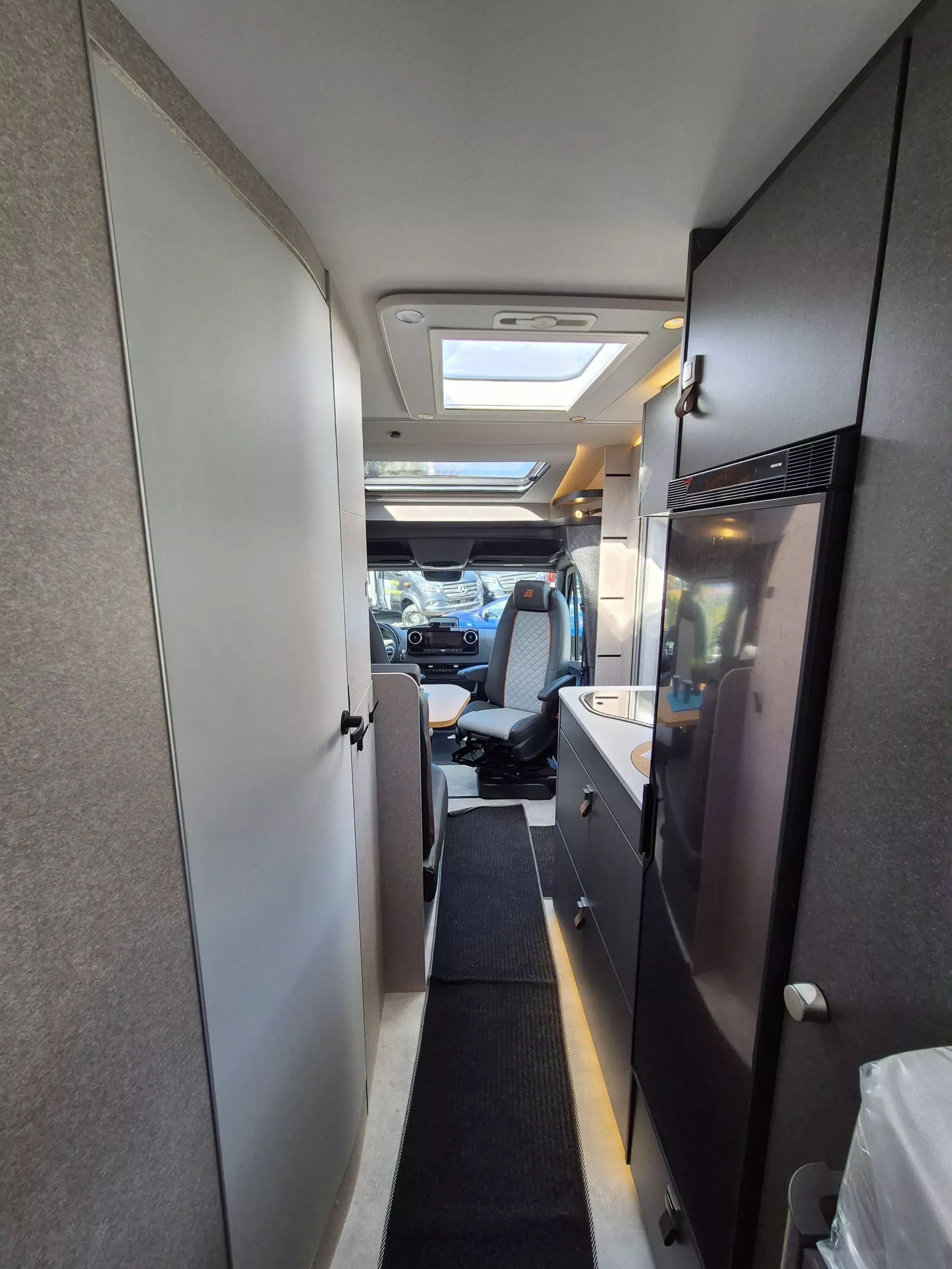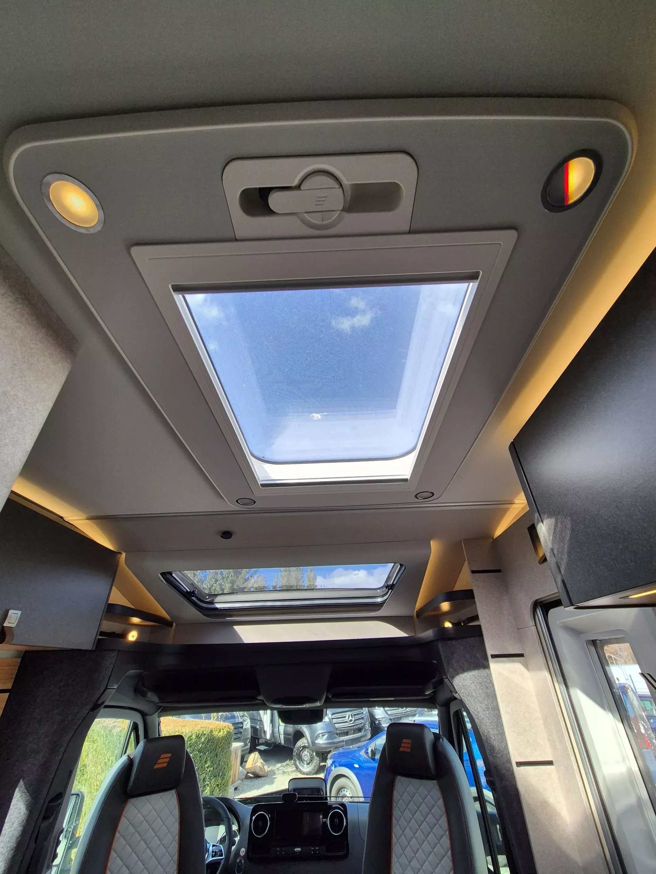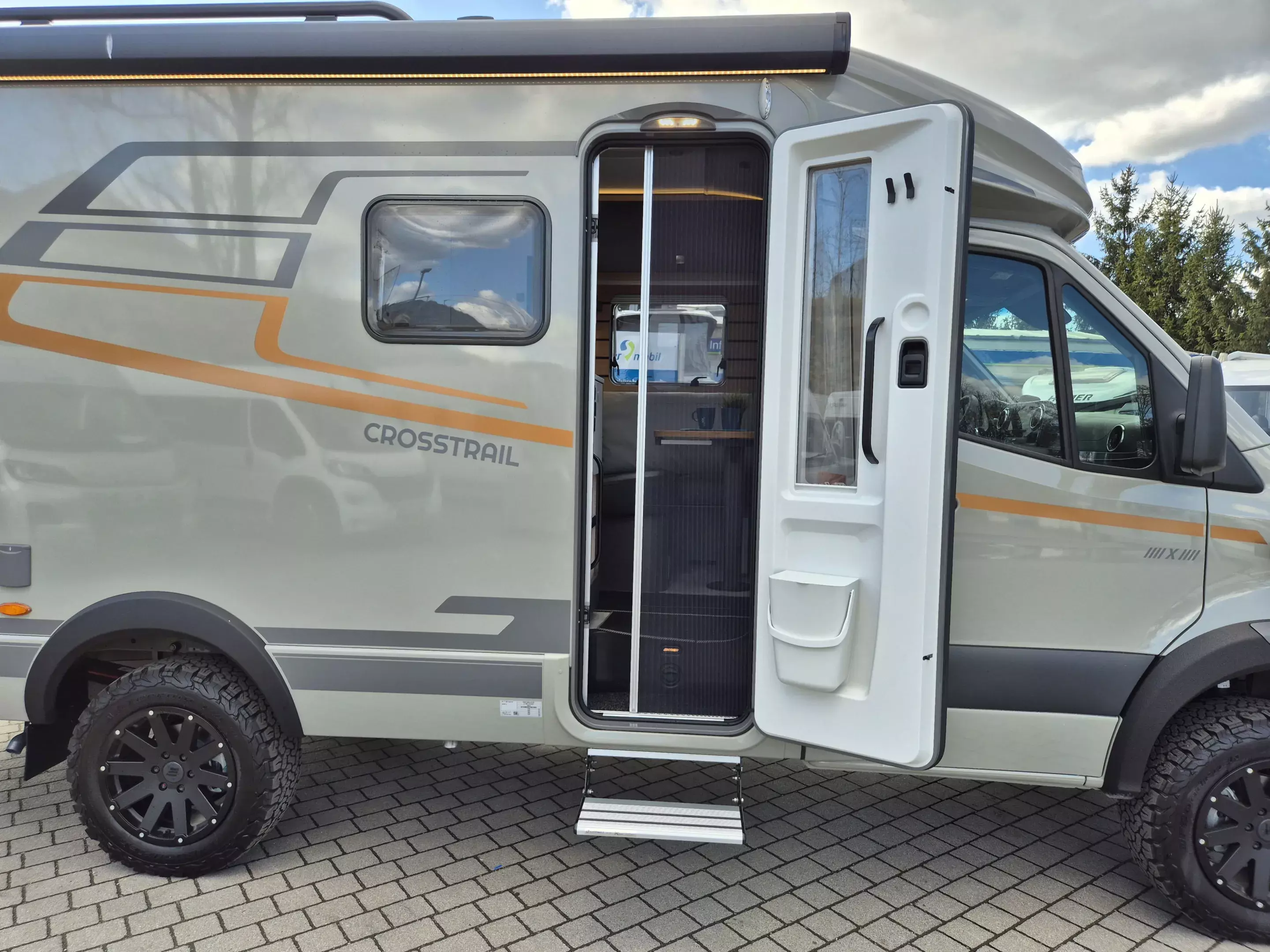 - CrossTrail Paket (Teil 2): MBUX-Navigation mit Rückfahrkamera, Lederlenkrad, Vollautomatische Klimaanlage THERMOTRONIC, Downhill Speed Regulation (Offroad-Betrieb), Verkehrszeichen-Assistent, Aktiver Abstands-Assistent DISTRONIC PLUS, Fernlicht-Assistent, Markise mit dimmbarer LED-Beleuchtung, Dachreling mit Heckleiter, 44" LED-Lightbar über Fahrerhaus, Unterfahrschutz für Motor und Wassertank, Radlaufverbreiterung vorne, Designbeklebung CrossTrail, Komfort-Eingangstür mit Fenster und Verdunkelungsrollo, integriertem Mülleimer und 2-fach Verriegelung.