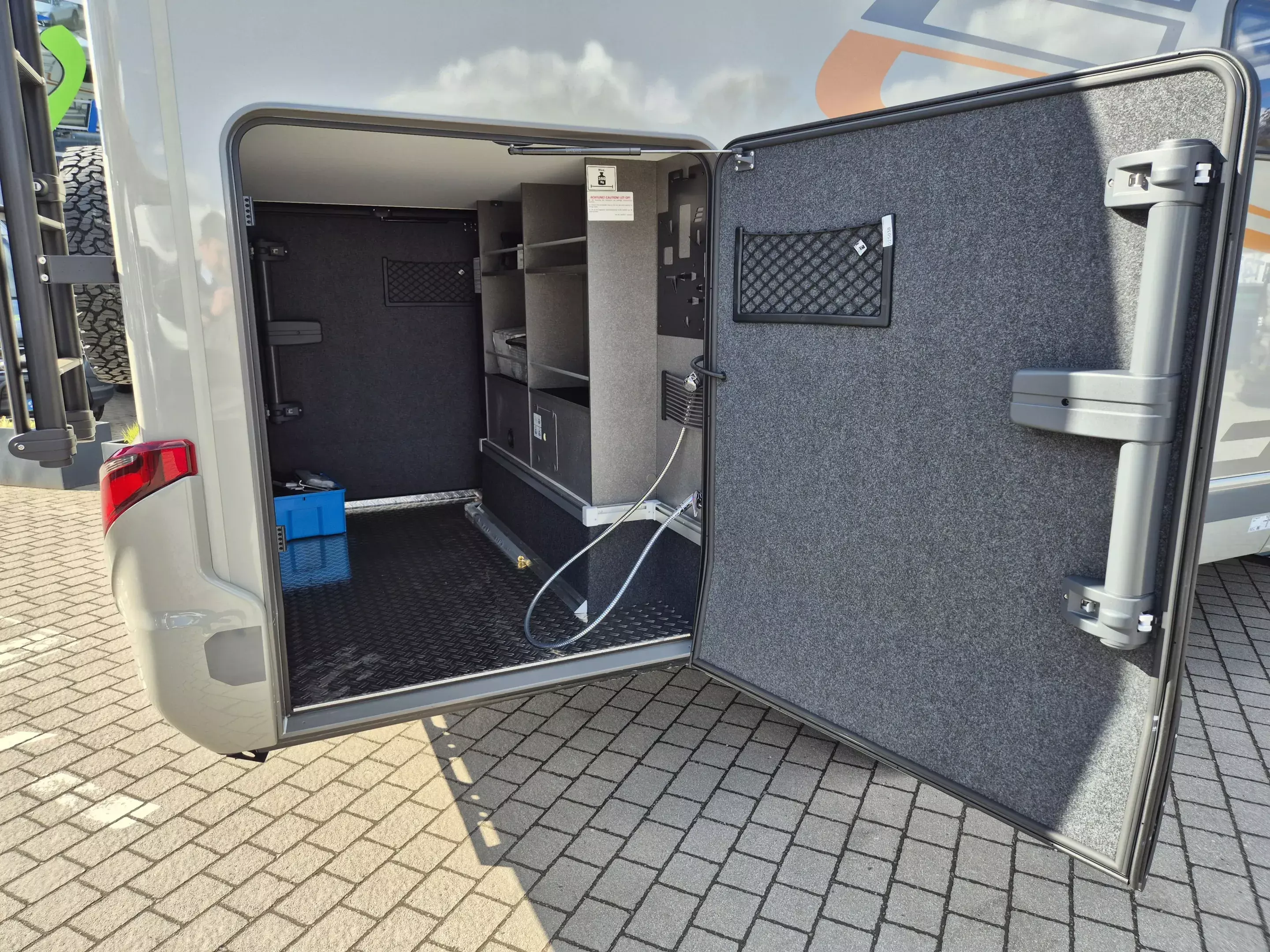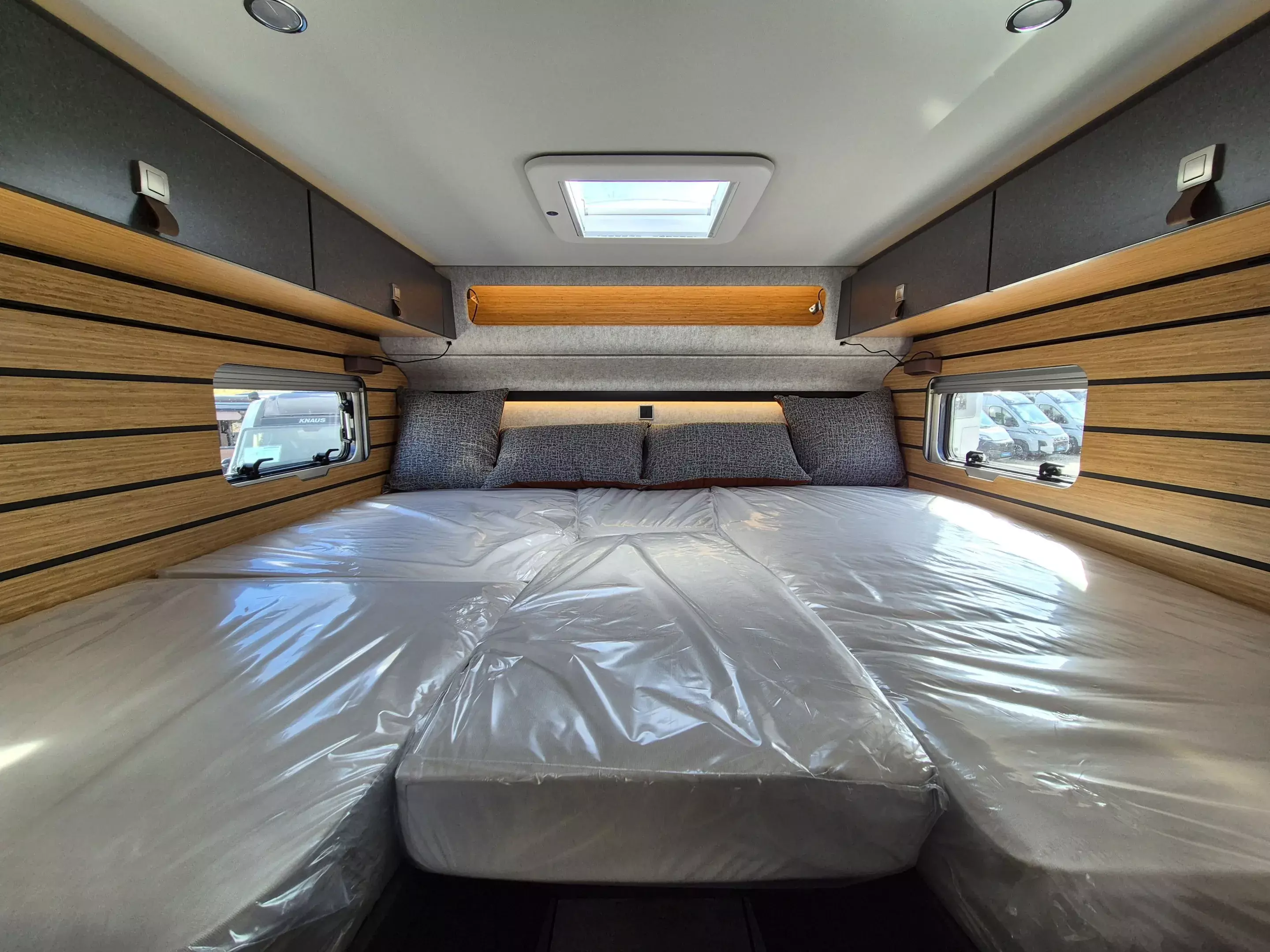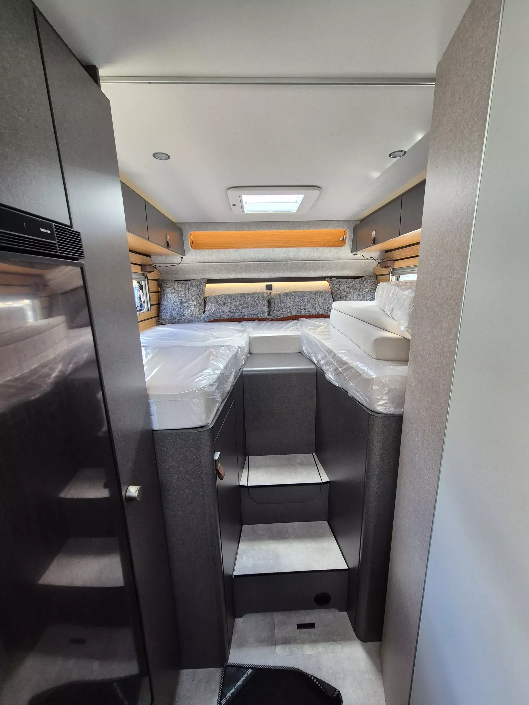 - CrossTrail Paket (Teil 3): Riffelblechboden und Filzverkleidung in Heckgarage, Außendusche in Garage, Werkzeug-Set (Klappspaten, Axt) im Heckstauraum, Komfort L-Sitzgruppe mit Loungepolstern und längs-/ quer verschiebbarem Tisch, Bettenbau für Komfort L-Sitzgruppe inkl. Zusatzpolster unter Einbeziehung Fahrersitz, Schlafsystem mit Tellerfederrost für Heckbetten, Spannbettlaken nach individuellem Maß für Heckbetten, Zusatzpolster zwischen Längseinzelbetten mit Komfortaufstieg, 4 Kissen mit Bezug, Einlegeboden in Dusche für ebenen Laufboden.