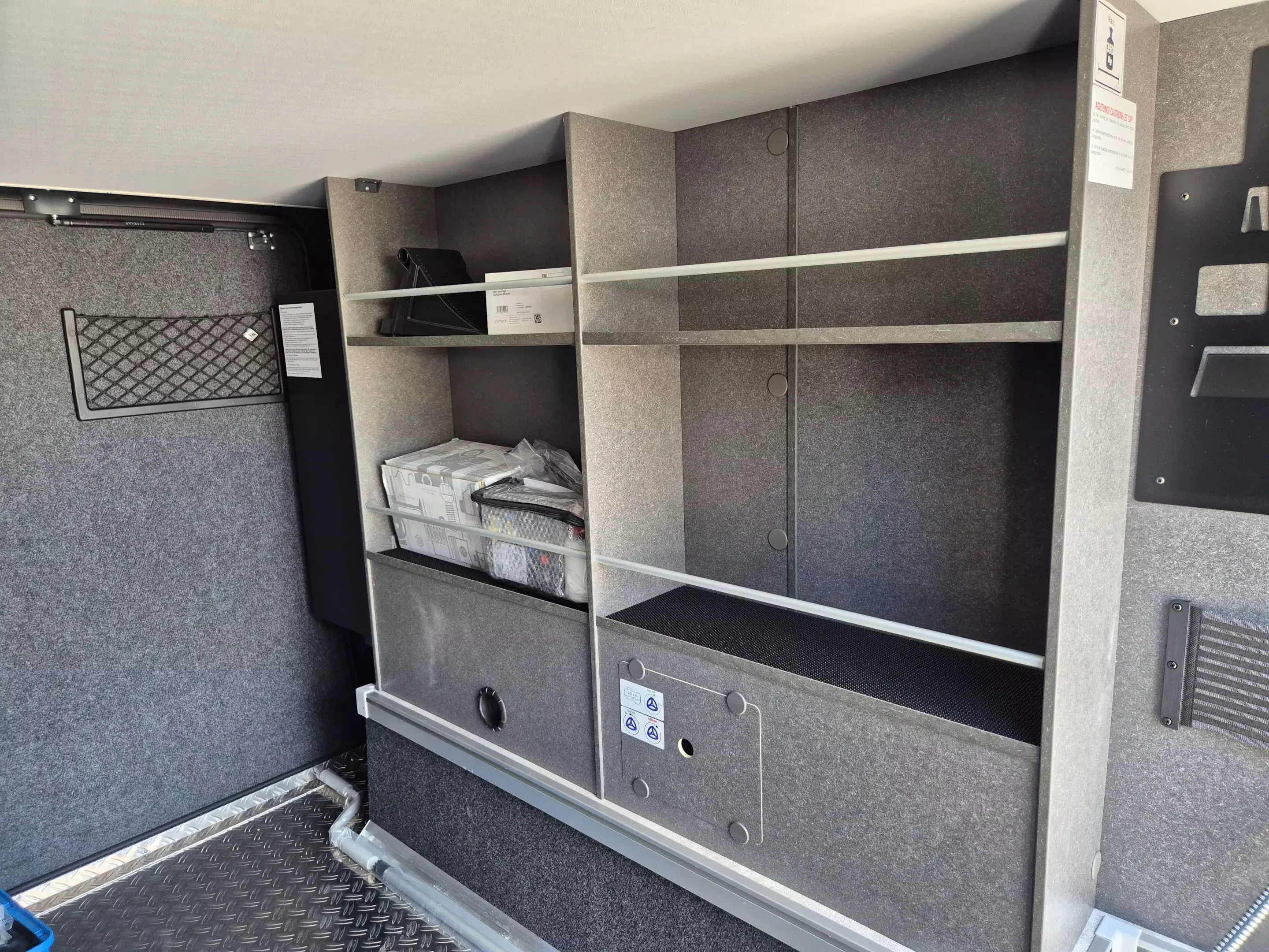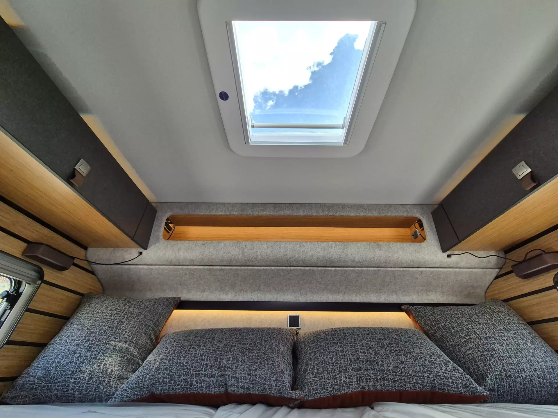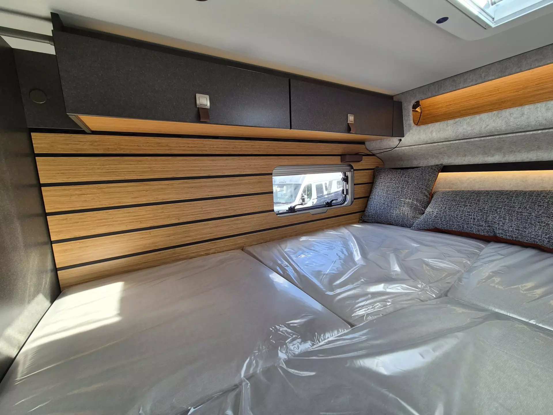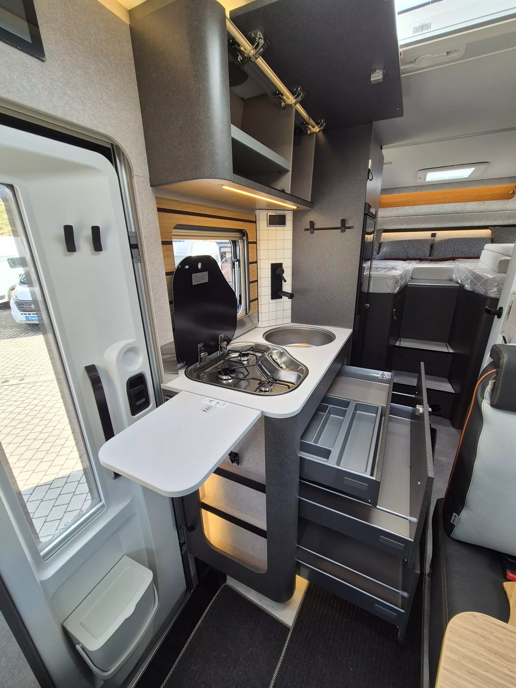 - CrossTrail Paket (Teil 3): Riffelblechboden und Filzverkleidung in Heckgarage, Außendusche in Garage, Werkzeug-Set (Klappspaten, Axt) im Heckstauraum, Komfort L-Sitzgruppe mit Loungepolstern und längs-/ quer verschiebbarem Tisch, Bettenbau für Komfort L-Sitzgruppe inkl. Zusatzpolster unter Einbeziehung Fahrersitz, Schlafsystem mit Tellerfederrost für Heckbetten, Spannbettlaken nach individuellem Maß für Heckbetten, Zusatzpolster zwischen Längseinzelbetten mit Komfortaufstieg, 4 Kissen mit Bezug, Einlegeboden in Dusche für ebenen Laufboden.