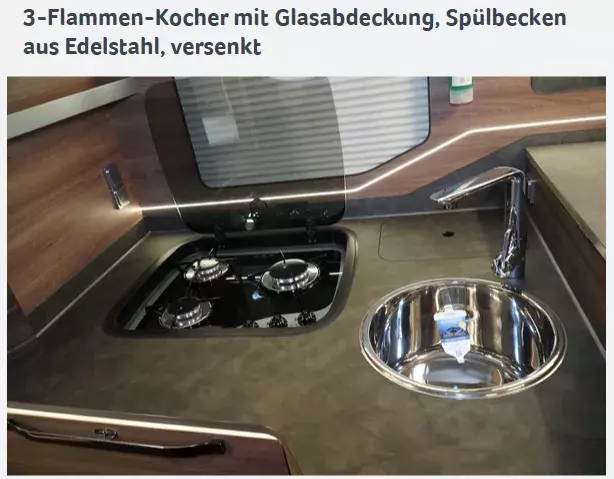 - 3-Flammen-Kocher mit Glasabdeckung, Spülbecken aus Edelstahl, versenkt