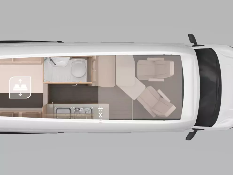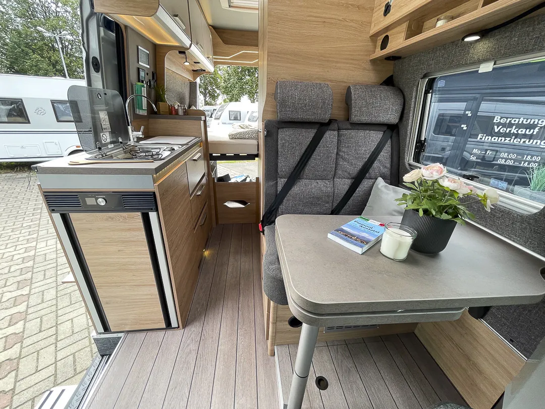 Der BOXDRIVE 600 XL überzeugt als moderner Kastenwagen mit Hochdach und bietet vier Schlaf- sowie vier Sitzplätze – ideal für Familien oder Paare, die Wert auf Flexibilität und Komfort legen. Das gemütliche Querbett, die Polsterung „Memphis“ und die durchdachte Innenraumaufteilung sorgen für ein angenehmes Wohngefühl.