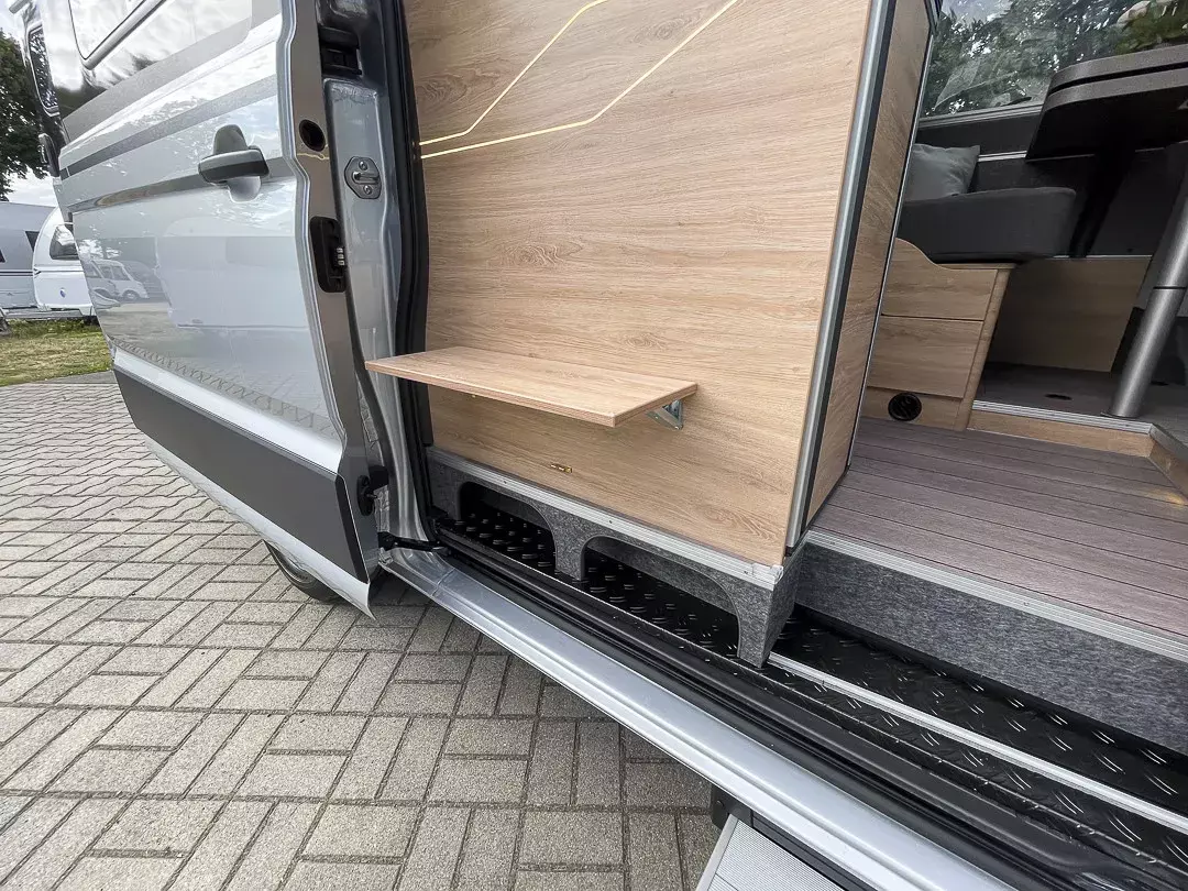 Praktische Details wie die elektrische Einstiegstufe, Insektenschutztür, Ambientebeleuchtung, Rückfahrkamera und zahlreiche Ablagen machen das Reisen besonders komfortabel. Das Hochdach in Wagenfarbe, die Metallic-Lackierung und das Premium-Paket mit digitalem Radioempfang und Navigationssystem runden das Gesamtpaket ab.