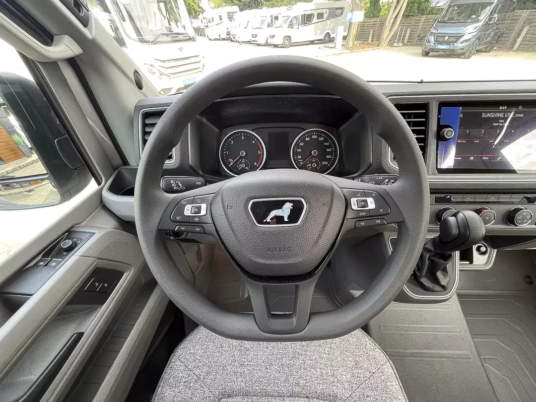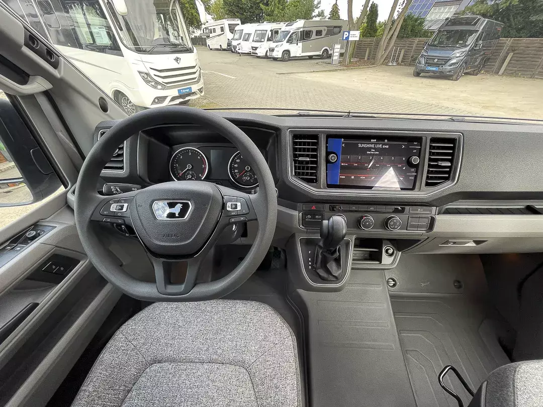 * Im Alltag zeigt der BOXDRIVE seine Stärken: die breite elektrische Trittstufe, die Insektenschutztür, das hochwertige Cockpit mit Multifunktionslenkrad und großem Navi-Bildschirm, das aufgeräumte Stauraumkonzept sowie das TRUMA CP-Plus Bedienpanel machen jede Reise angenehm unkompliziert. Das Premium-Paket bringt eine hochwertige Rückfahrkamera, DAB-Radioempfang und die voll integrierte MAN-Navigation – ideal für lange Touren. Dank Markise, isoliertem Abwassertank, Wassersystem mit Filter und umfangreicher Ambientebeleuchtung entsteht ein echter Wohlfühlcharakter, innen wie außen.