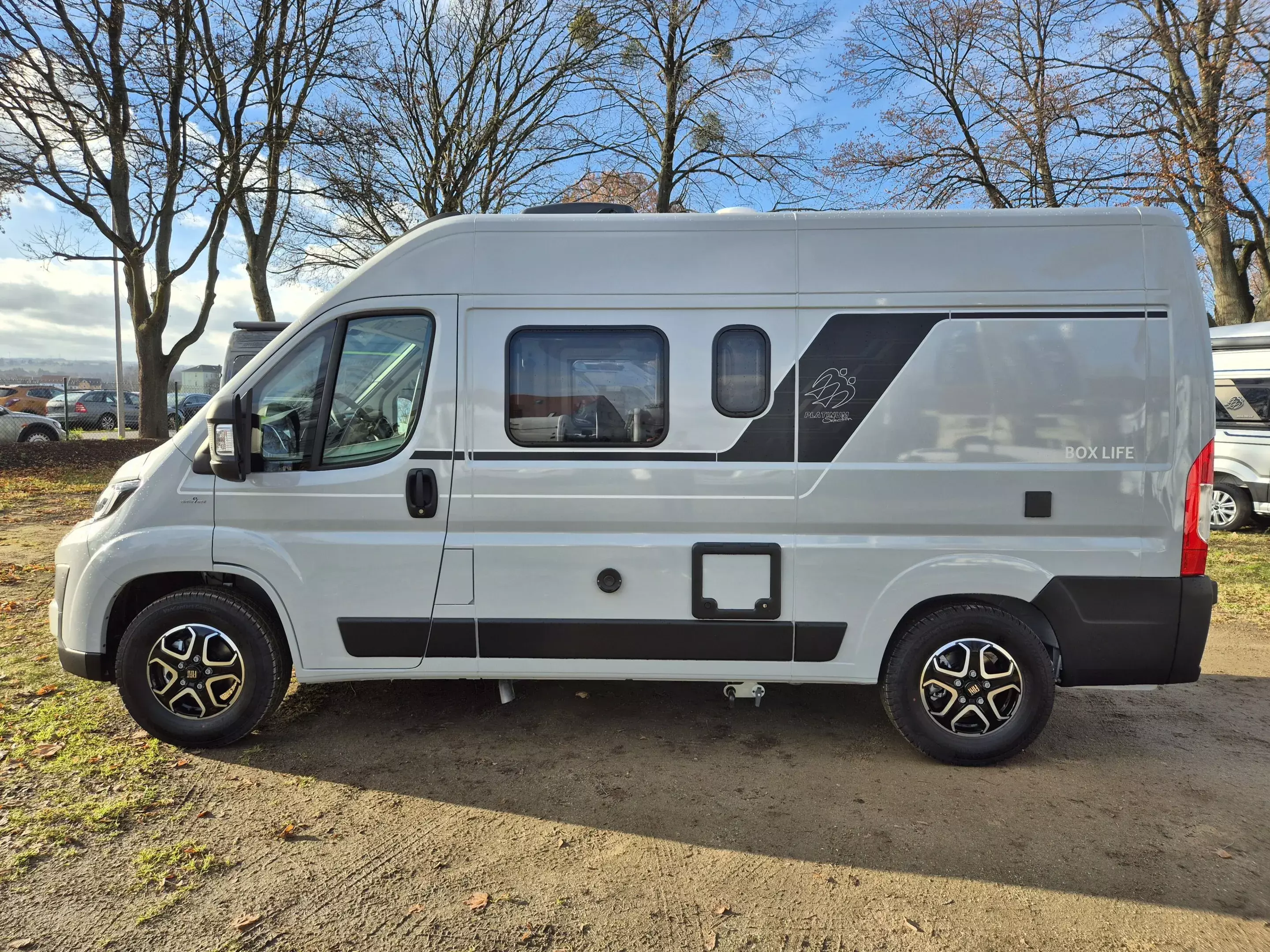 - Platinum Selection [1] (Spoilerlippen (skid-plate), Frontstoßfänger in Wagenfarbe lackiert, 16" Bereifung, Leichtmetallfelgen für Serienbereifung, Lenkrad und Schaltknauf in Techno-Lederausführung, Instrumententafel im Techno-Design (Alu), Front- und Seitenscheibenverdunklung, Nebelscheinwerfer mit Abbiegelicht, Leseleuchten im Fahrerhaus, Media-Center 6,8", Rückfahrkamera, inkl. Verkabelung, Einstiegstufe elektrisch (Breite: 70 cm), Sonderbeklebung „PLATINUM SELECTION", KNAUS Embleme im Bug und im Heck, schwarz/chrom)