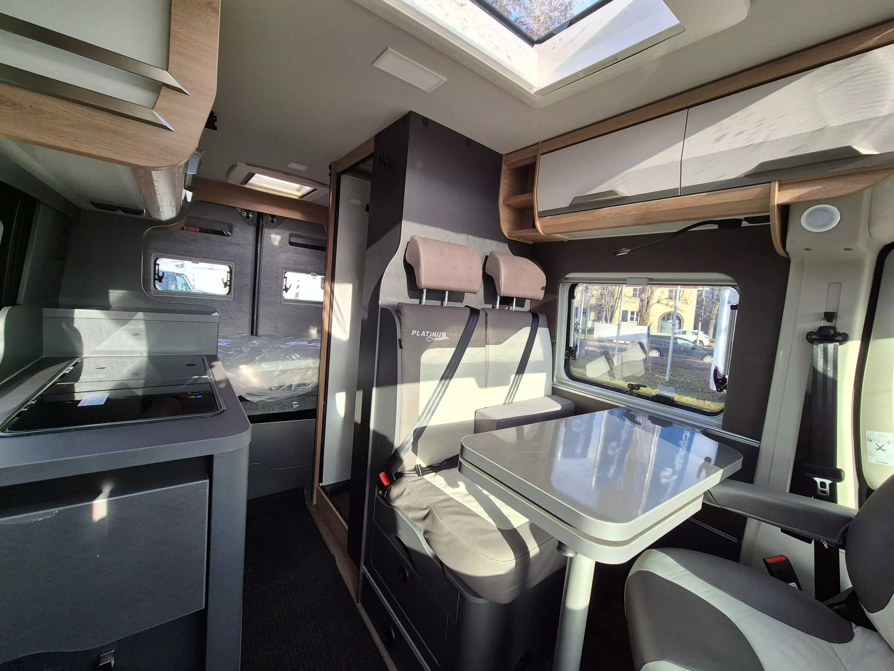 - Platinum Selection [2] (Regenrinne über der Schiebetür mit LED (dimmbar), Matratzentopper, Polster: Vegane Lederalternative "NATURAL STONE" "PLATINUM SELECTION", TRUMA CP-Plus, digitales Heizungsbedienpanel, Isolierhaube Abwassertank, beheizbar, Lichtsteuerung, Stimmungsvolle Ambientebeleuchtung, 230 V SCHUKO-Steckdose zusätzlich, im Heck (1 Stück), 230 V SCHUKO-Steckdose zusätzlich, im Deckenschrank Bug links (1 Stück), USB-Steckdose (1 Stück), im Toilettenraum, 12 V Powersteckdose (1 Stück), Kabelvorverlegung für Sat-Anlagen, Vorbereitung PV, Leselampe Schwanenhals im Sitzbereich inkl. USB-S