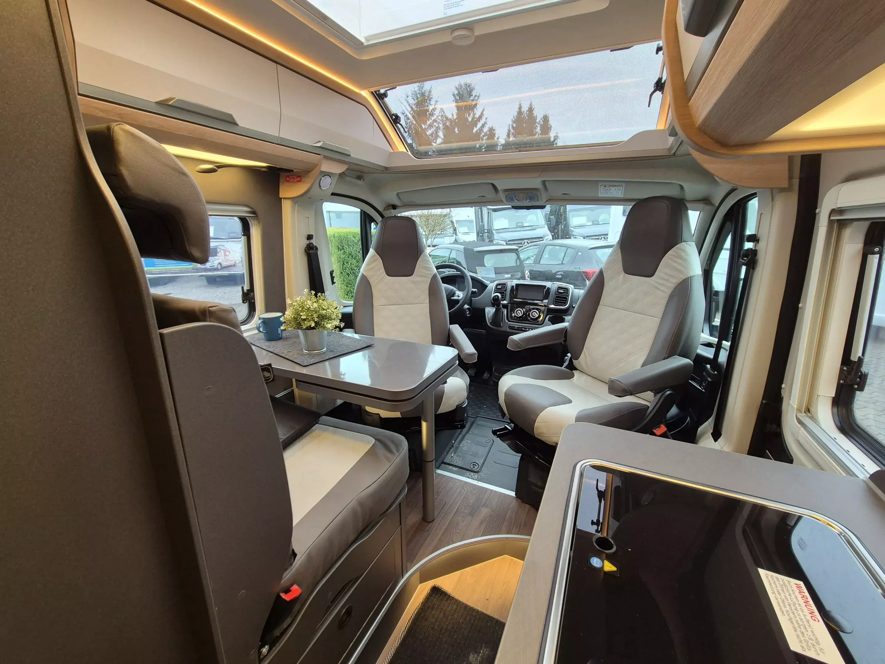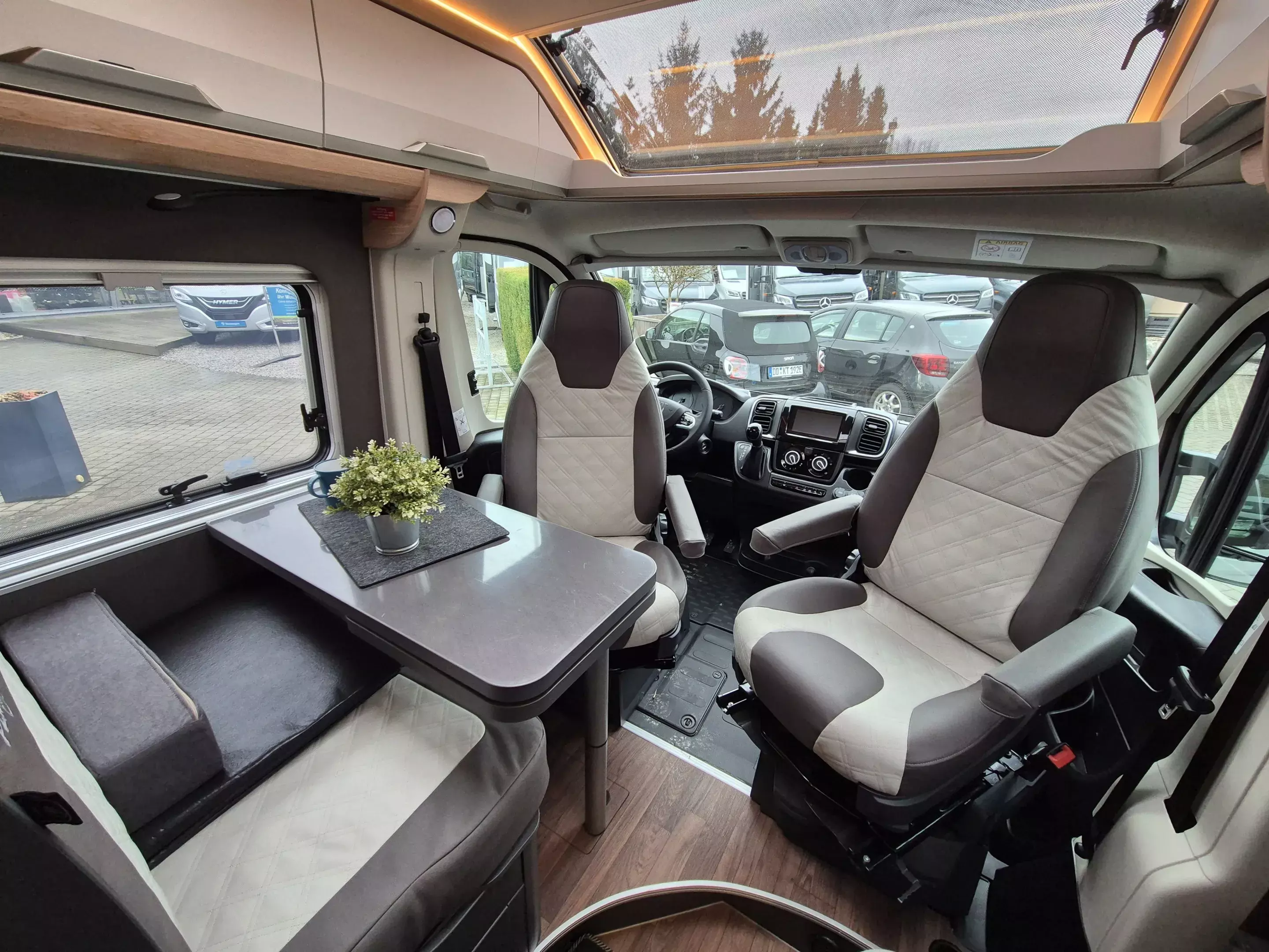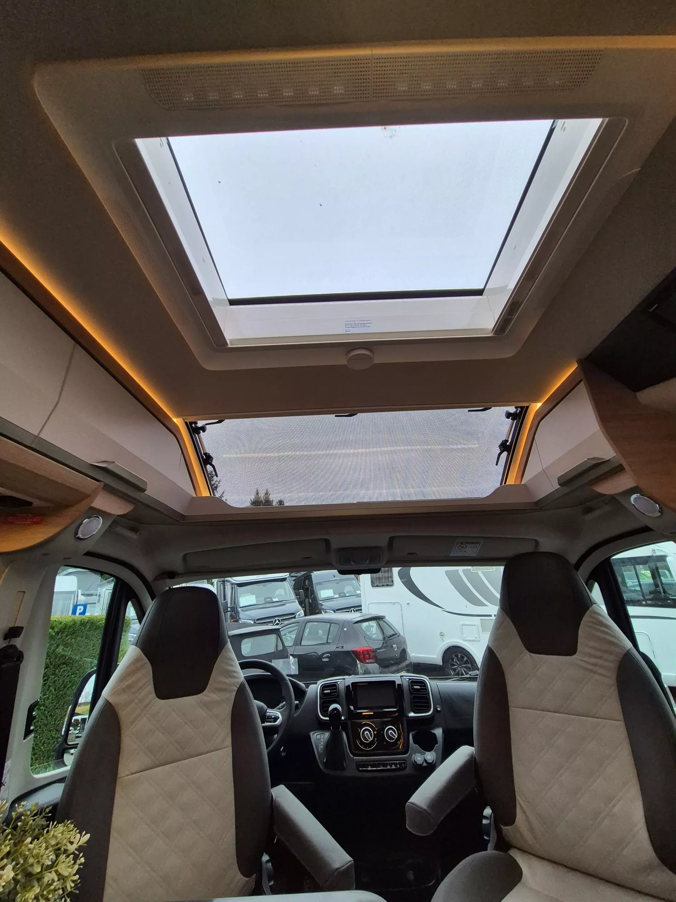 - Platinum Selection [2] (Regenrinne über der Schiebetür mit LED (dimmbar), Matratzentopper, Polster: Vegane Lederalternative "NATURAL STONE" "PLATINUM SELECTION", TRUMA CP-Plus, digitales Heizungsbedienpanel, Isolierhaube Abwassertank, beheizbar, Lichtsteuerung, Stimmungsvolle Ambientebeleuchtung, 230 V SCHUKO-Steckdose zusätzlich, im Heck (1 Stück), 230 V SCHUKO-Steckdose zusätzlich, im Deckenschrank Bug links (1 Stück), USB-Steckdose (1 Stück), im Toilettenraum, 12 V Powersteckdose (1 Stück), Kabelvorverlegung für Sat-Anlagen, Vorbereitung PV, Leselampe Schwanenhals im Sitzbereich inkl. USB-S