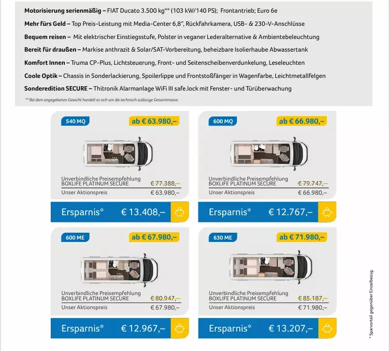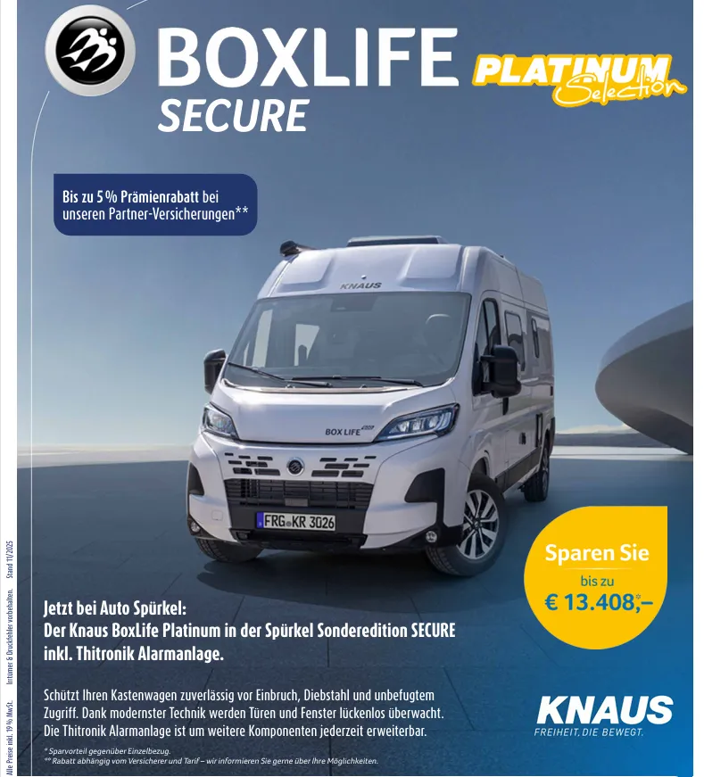 Erleben Sie die schönsten Momente noch komfortabler: Als Selection‐Modell bietet der BOXLIFE eine umfangreiche Ausstattung, die keine Wünsche offen lässt. Genießen Sie jetzt jede Ihrer Reisen voller Extra‐Features. __Zum Beispiel unsere TraumMobil Secure Ausstattung.__