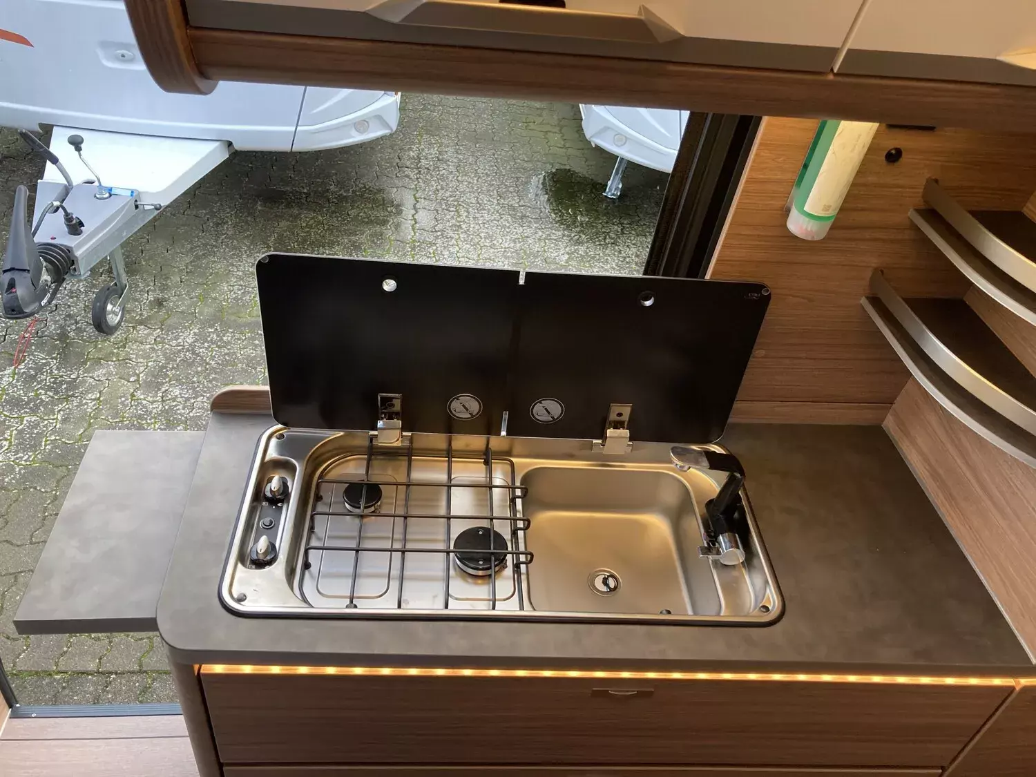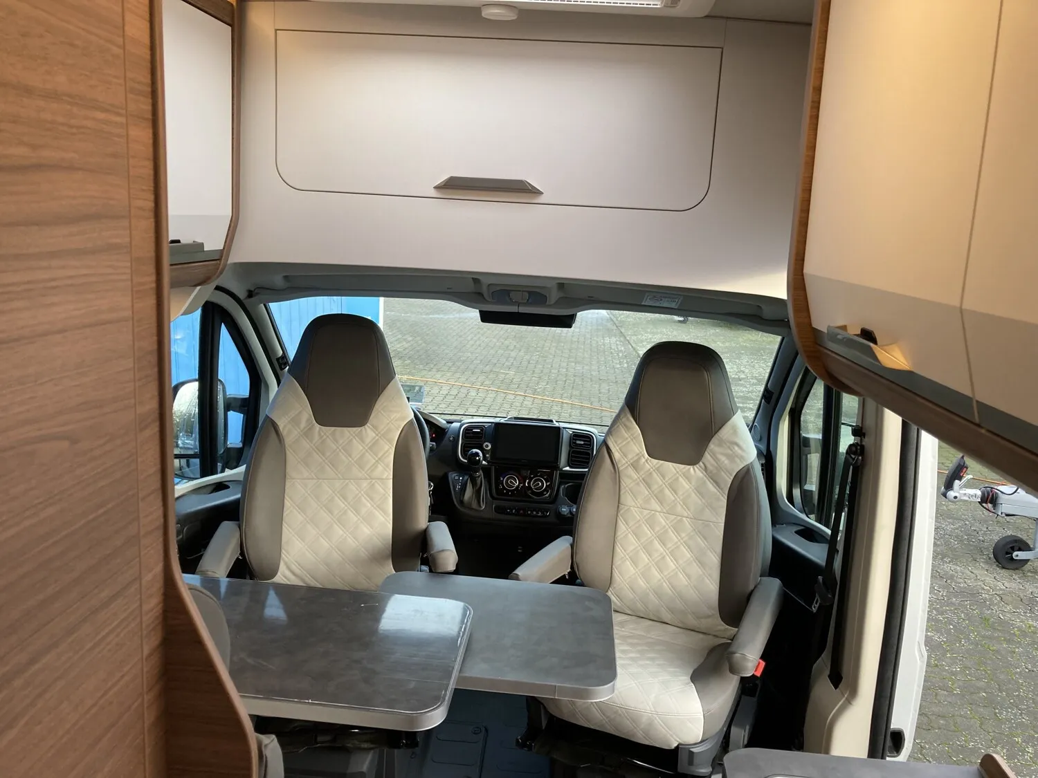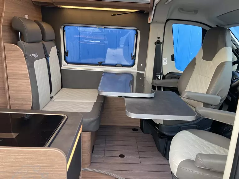 Einstiegstufe elektrisch (Breite: 70 cm), Regenrinne ueber der Schiebetür mit LED, Sonderbeklebung "PLATINUM SELECTION", MARKEN Embleme im Bug und im Heck, schwa, Nebelscheinwerfer mit Abbiegelicht, Fussmattenset im Fahrerhaus im MARKEN De, Lenkrad und Schaltknauf in Lederausfuehr, Traktionshilfe "Traction Plus", inkl. Be, Frontstossfaenger in Wagenfarbe lackiert, Leichtmetallfelgen fuer Serienbereifung, Hoehenverstellung Beifahrersitz, 16" Bereifung, Spoilerlippen (skid-plate), Instrumententafel im Techno-Design (Alu), Chassis in Sonderlack.: Campovolo Grau, Ablageschale unter dem Fahrersitz, Vorbereitung fuer Multimedia, 230 V SCHUKO-Steckdose zus. im Heck (1 S, 230 V SCHUKO-Steckdose zus. DKS bug link, Radiovorbereitung inkl. 2 Lautsprecher i, 12 V Powersteckdose (1 Stueck), Rueckfahrkamera, inkl. Verkabelung, Kabelvorverlegung fuer Solar- und Sat-An, Radio DAB+, All-in-One Navigationssystem, Leseleuchten im Fahrerhaus, Lichtsteuerung, Stimmungsvolle Ambientebeleuchtung, Leselampe Schwanenhals im Sitzbereich in, Head-up Display, TRUMA CP-Plus, digitales Heizungsbedienp, Isolierhaube Abwassertank, beheizbar, Markise 400 x 250 cm, anthrazit, Front- und Seitenscheibenverdunklung, Rauchmelder, Matratzentopper, Polster: Vegane Lederalternative "NATURA, Anzahl d. zug. Sitzplaetze: 4