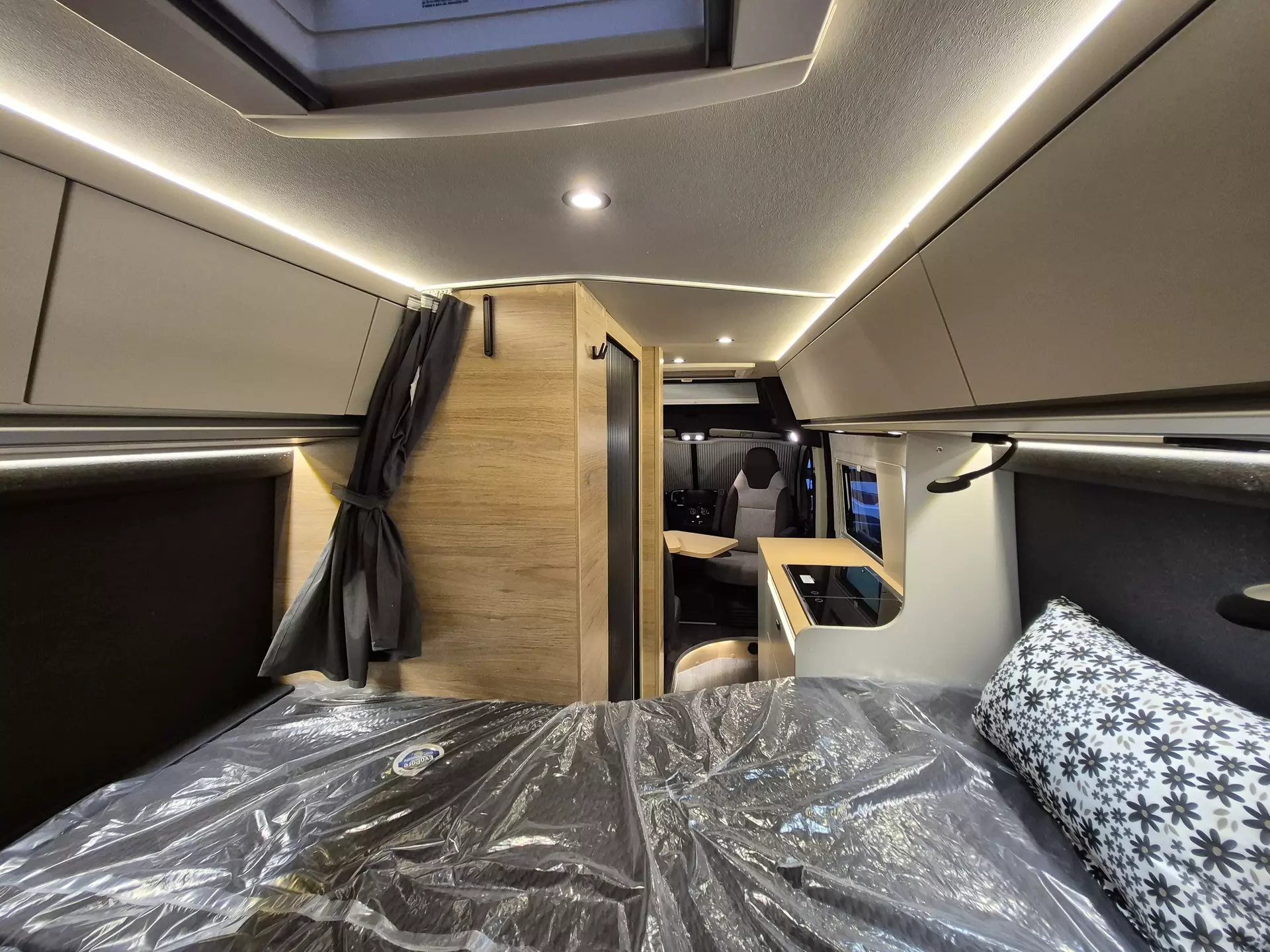 - E-Paket : Regenrinne über der Schiebetür mit LED (dimmbar) / 230 V SCHUKO-Steckdose zusätzlich, (Küche, 1 Stück) + im Heck (2 Stück) / 12 V Powersteckdose zusätzlich, in der Garage (1 Stück) / USB-Steckdose (1 Stück), im Küchenbereich + (1 Stück), im Toilettenraum / Leseleuchten im Fahrerhaus / Ambientebeleuchtung im Wohnraum/Nasszelle (dimmbar)