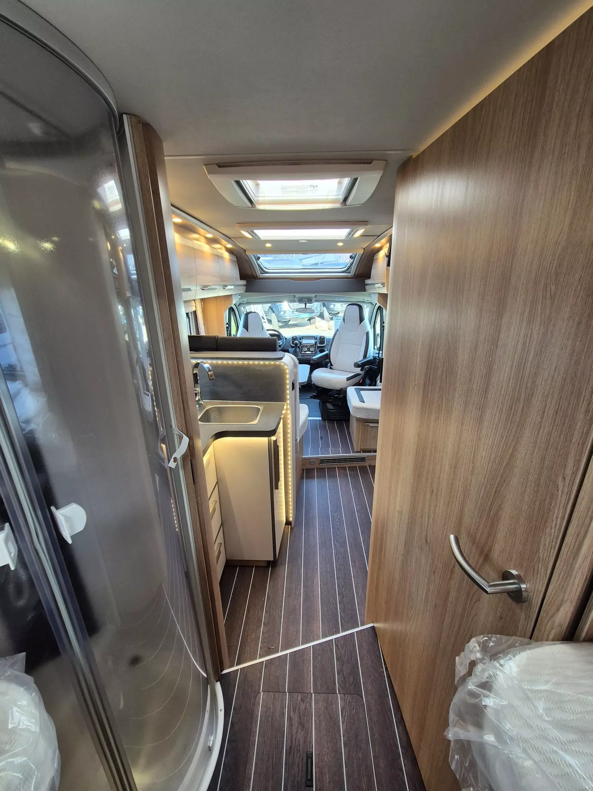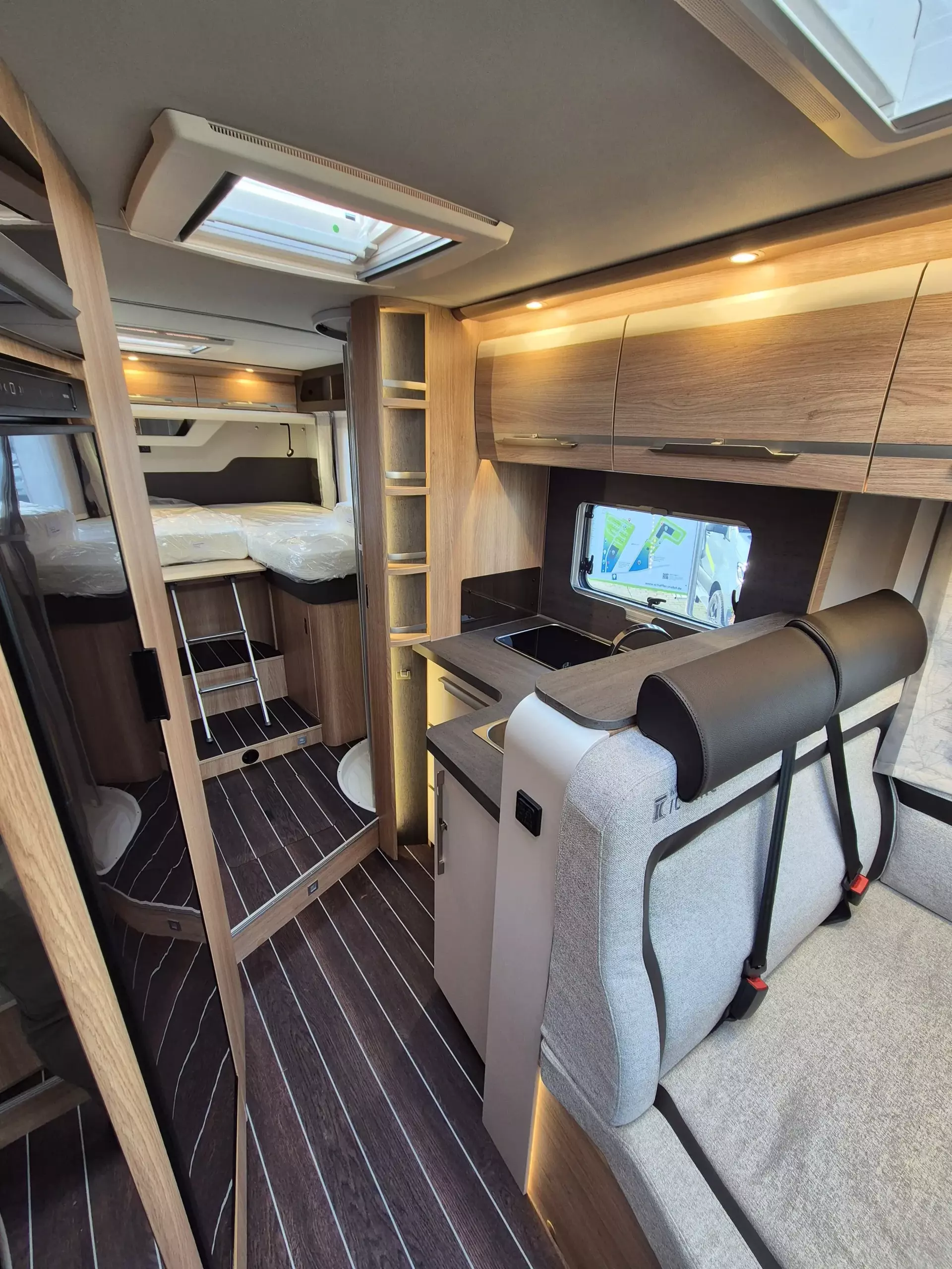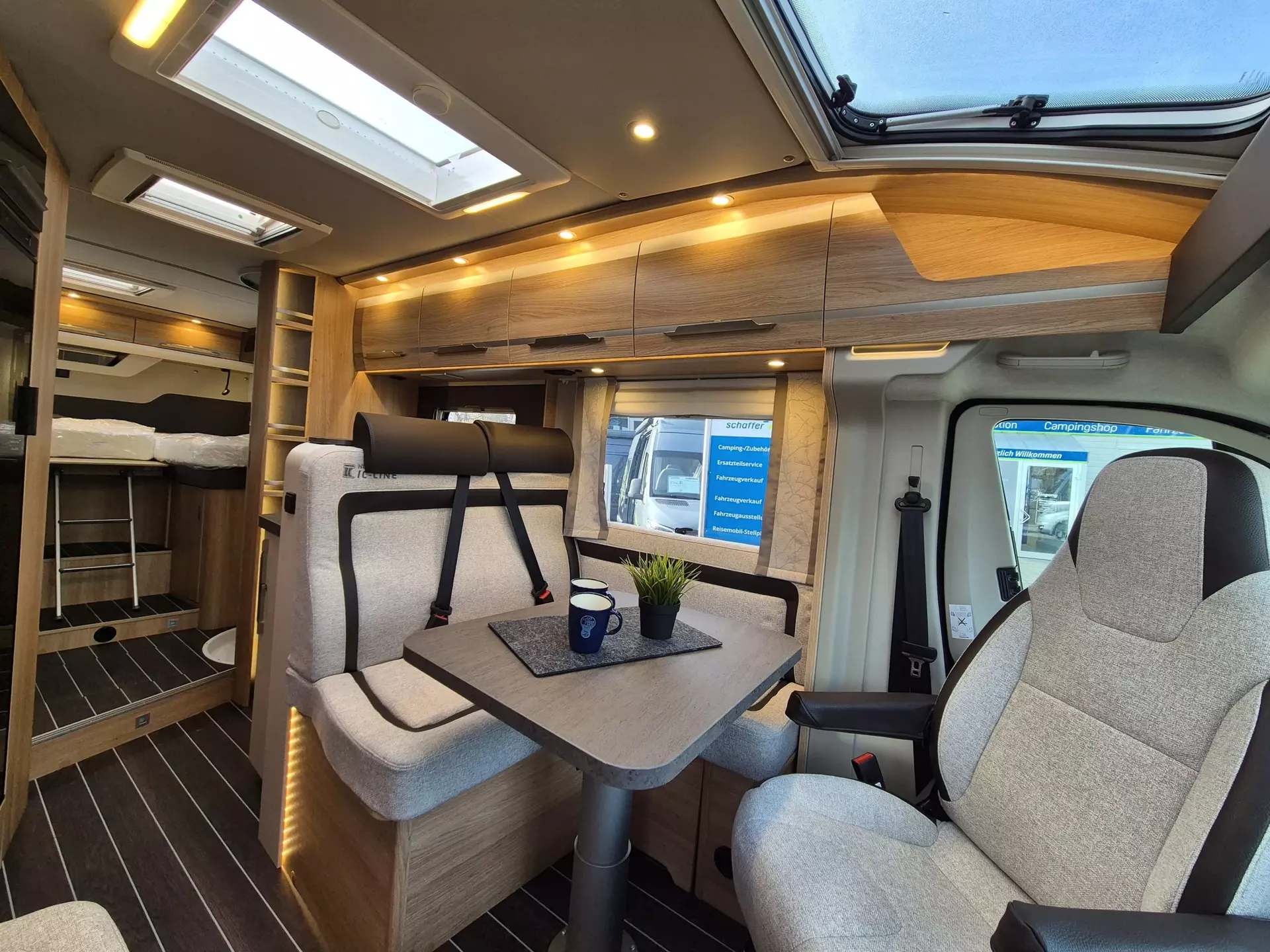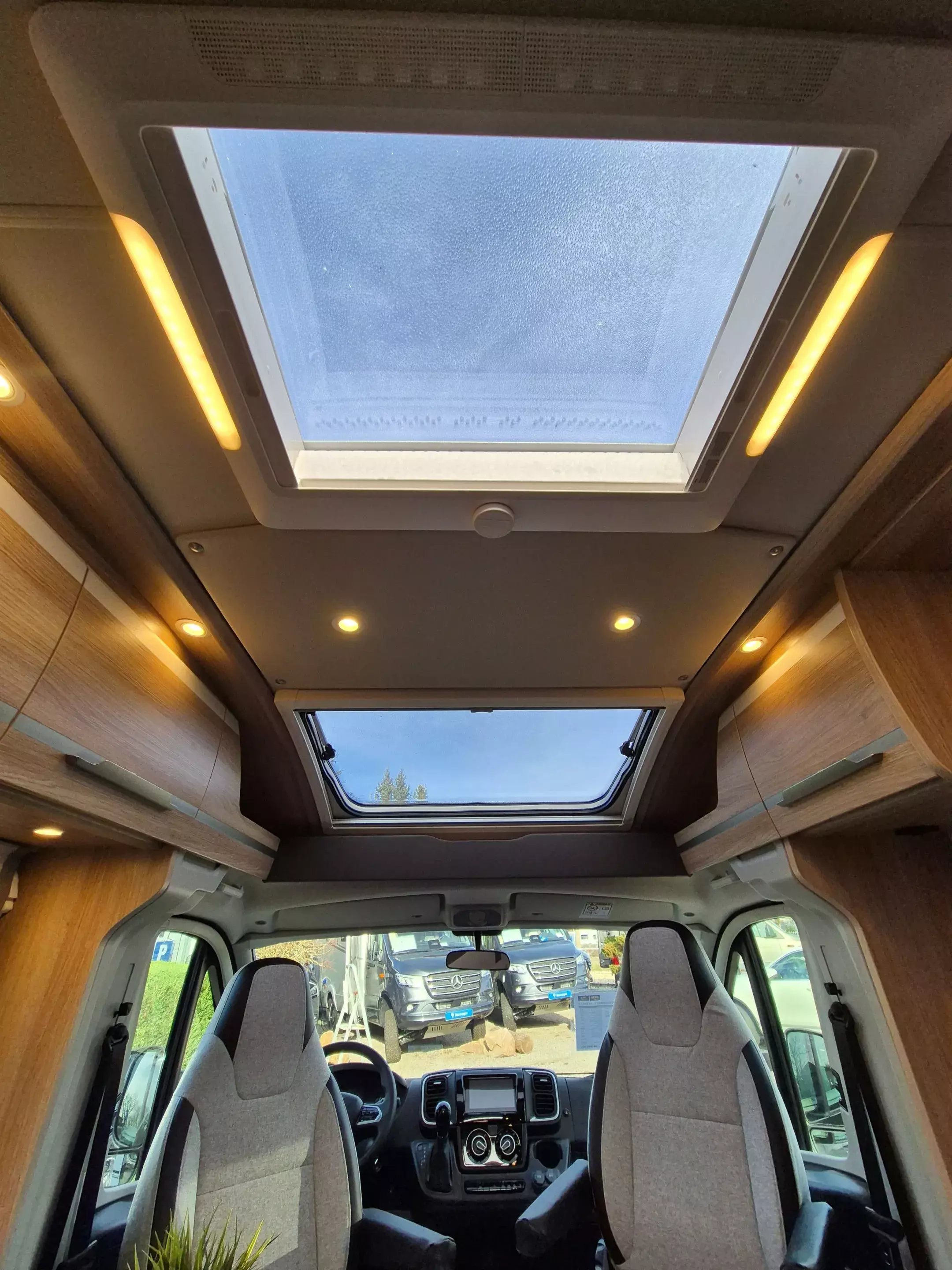 - SKY TI Paket (Ambientebeleuhtung und Küchenwandverkleidung Sitzbezüge Fahrerhaus in Wohnwelt-Design Truma CP-Plus Front- und Seitenscheibenverdunkelung Dachhaube 70 x 50 cm Stoffblenden mit Taschen im Bettbereich)