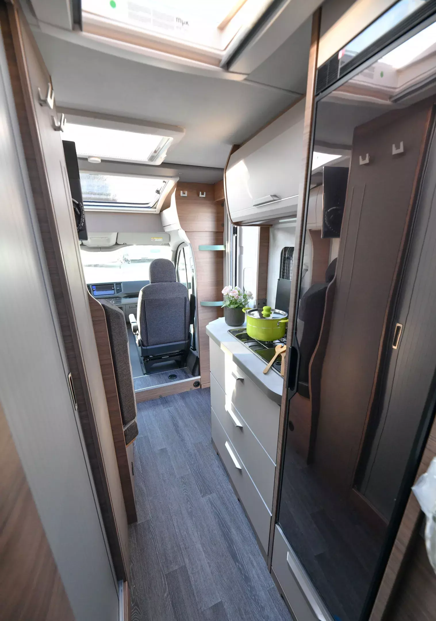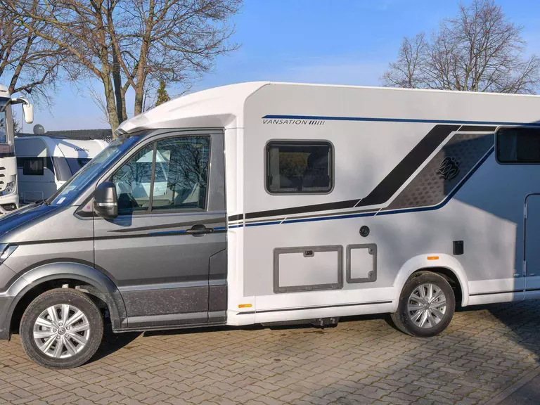 * Mit seinen 6,89 m Länge bleibt der VAN TI angenehm wendig, wirkt innen aber überraschend luftig. Das große Panoramadachfenster über dem Heck und die zusätzlichen Rahmenfenster bringen viel Licht ins Fahrzeug. Der Crafter-Antrieb mit 140 PS und Schaltgetriebe sorgt für ein ruhiges, sicheres Fahrgefühl, während die typische Vansation-Optik dem Fahrzeug einen frischen, hochwertigen Look verleiht.