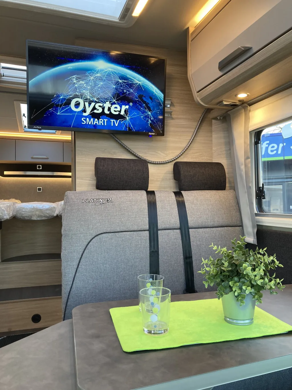 * Innen erwartet Sie ein hochwertiges Ambiente mit Einzelbetten, großer Heckgarage, drehbaren Pilotsitzen, Ambientebeleuchtung, gut ausgestatteter Küche und TV-Sat-System (Oyster 60 Twin inkl. 32"-TV). Die Premium-Aufbautür, Glattblech in Campovolo-Grau, Indium-Grau-Chassis, 17"-Alufelgen sowie die große Markise verleihen dem Fahrzeug einen edlen, modernen Look.