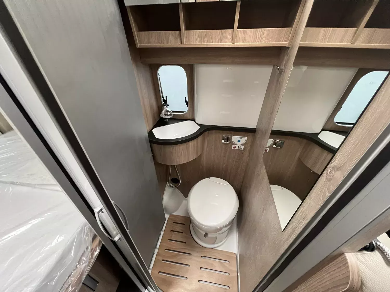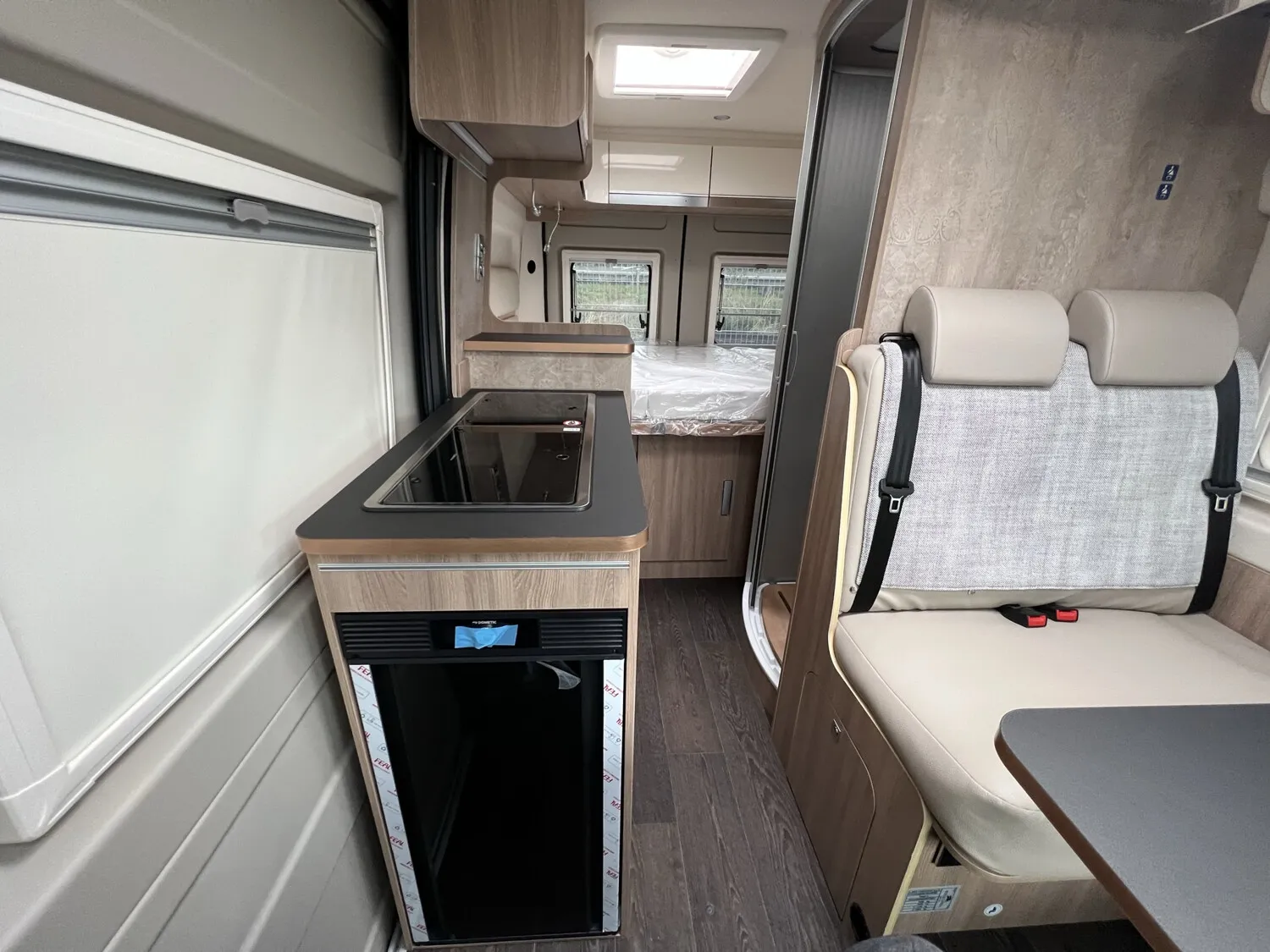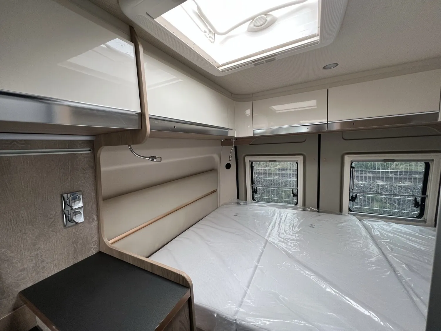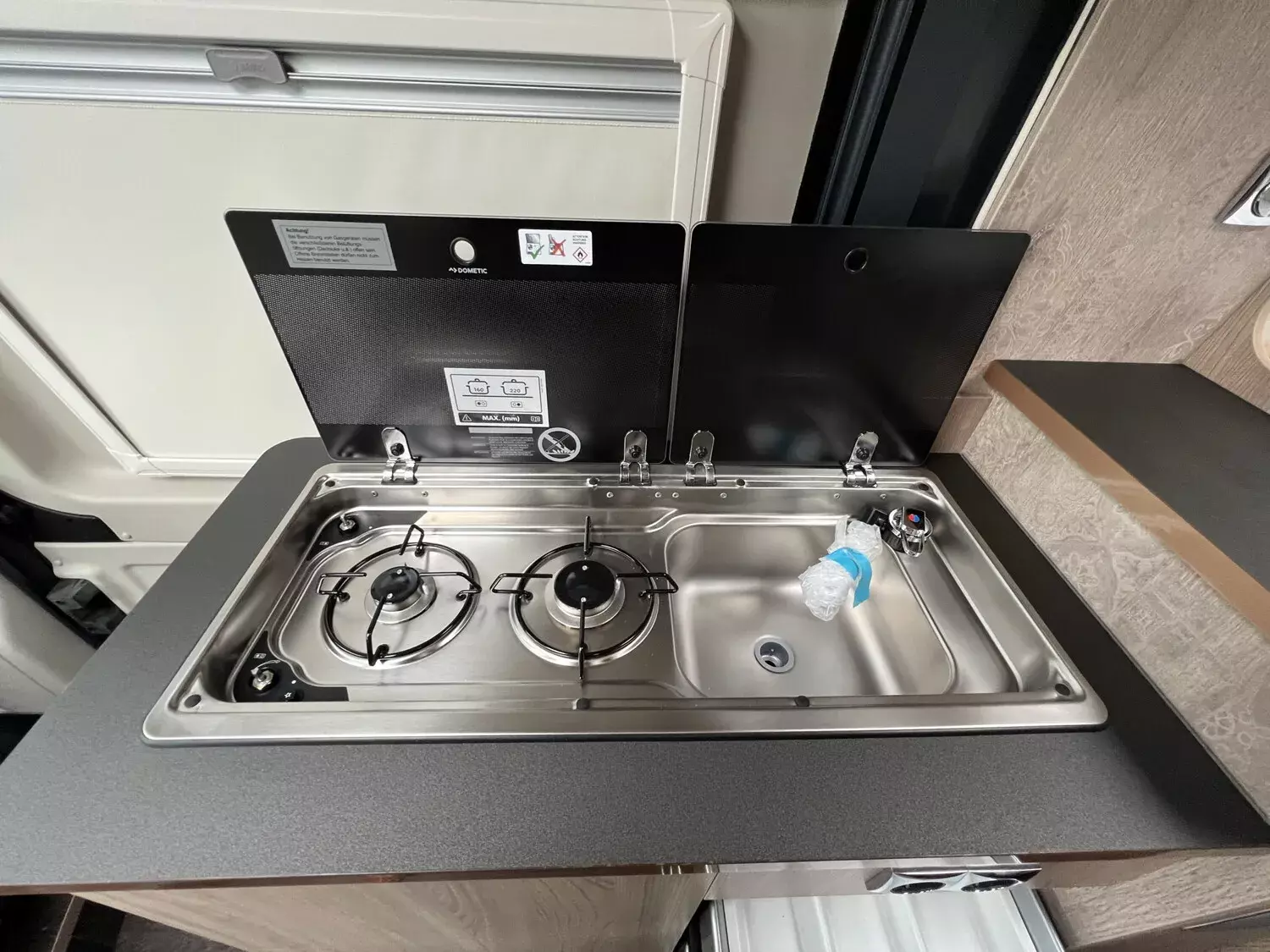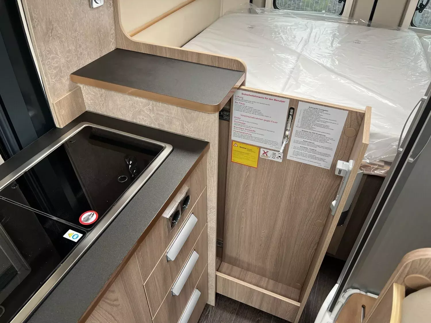 - Comfort Paket - Ecovip Camper Van (Schiebetür mit Fliegengitter, Vorbereitung Rückfahrkamera, Abwassertank, isoliert, Abwassertank, beheizt, Fenster seitlich links, LED-Außenleuchte und Raintech-System über Schiebetür, Holzeinlage für Duschwanne, Küchenausstattung: zusätzl. Arbeitsfläche seitlich, seitliche Ablagefächer mit Beleuchtung am Eingang)