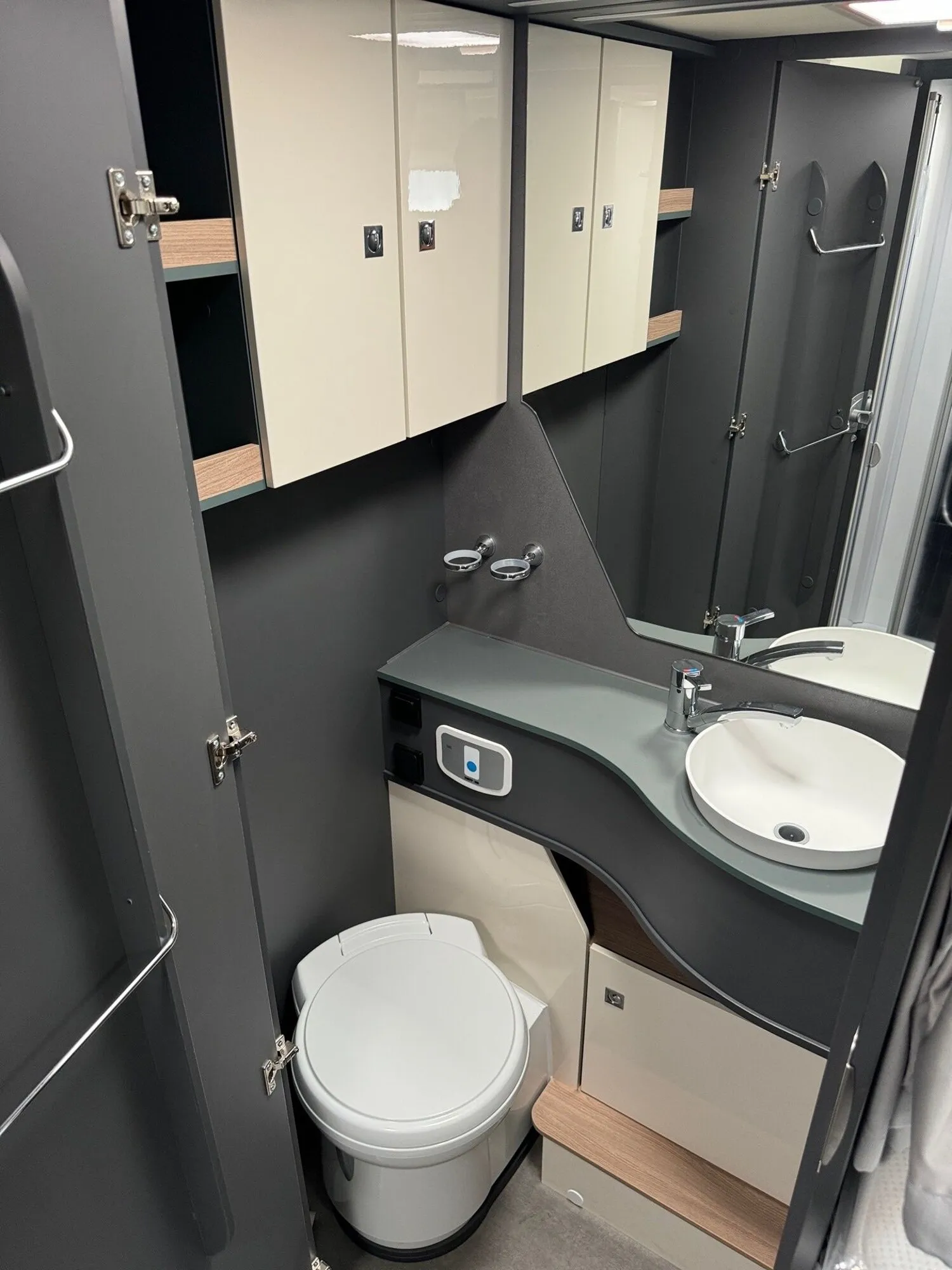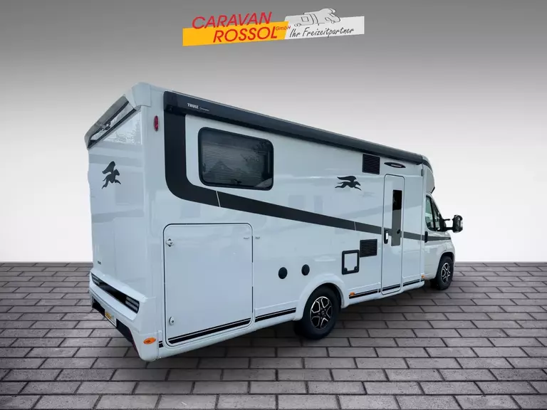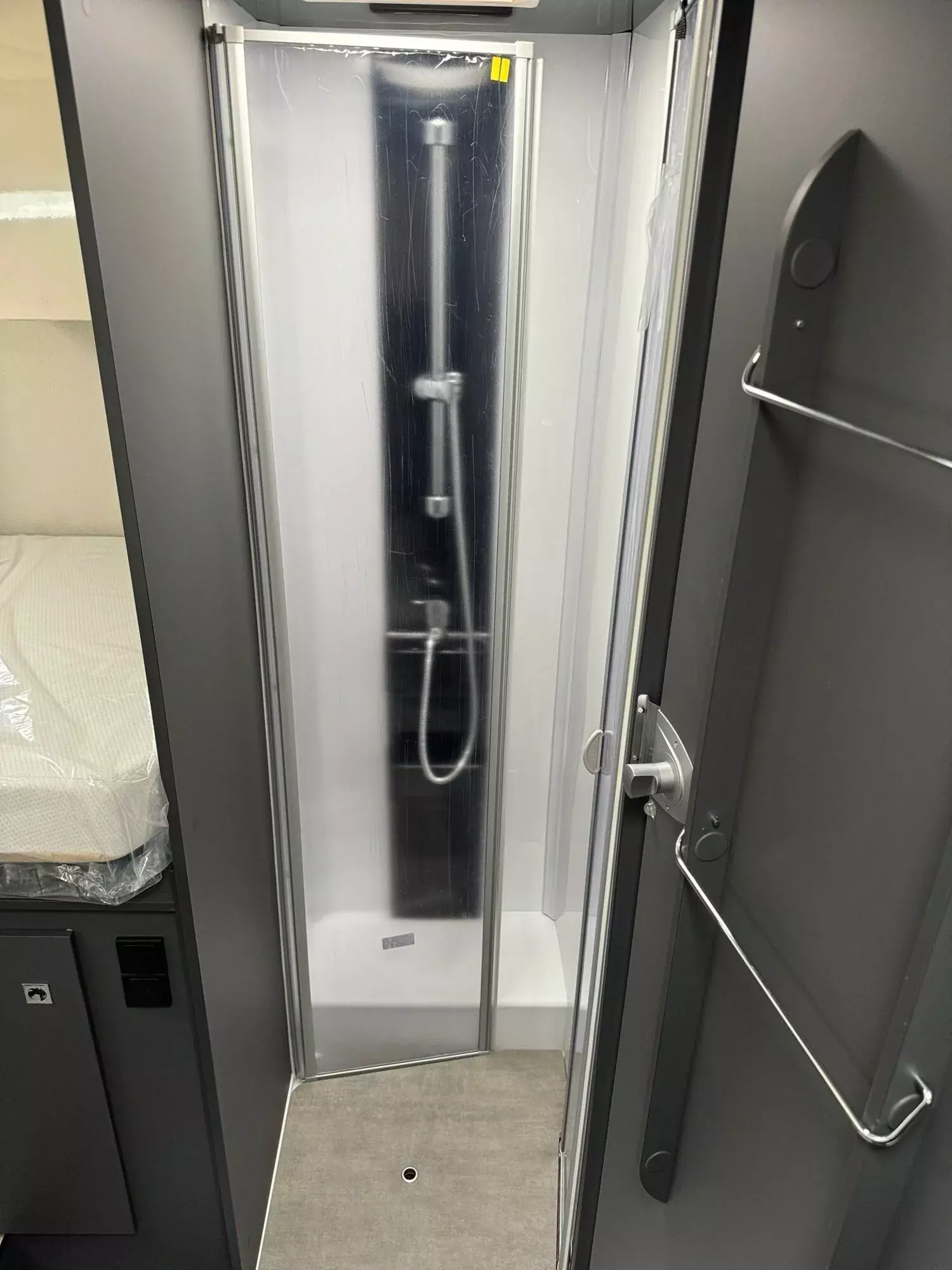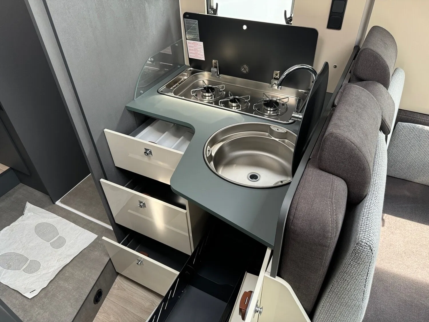 - Komfort Paket Kosmo L (Duscheinlage aus Holz, Fahrerhausteppich, Dunstabzugshaube, Isolierter Abwassertank, Beheizter Abwassertank, T-Haube mit Skyview zum Öffnen, Schlafzimmerwände in Eco-Leder verkleidet, Ausziehkörbe und -schränke in der Küche, Premium XL-Aufbautür, mit Fernbedienung, Zentralverriegelung, Fenster, Verdunkelung, Ablagefach und Gasdruckstoßdämpfer, Vorbereitung Rückfahrkamera, Auf den Wohnraum abgestimmte Sitzbezüge)