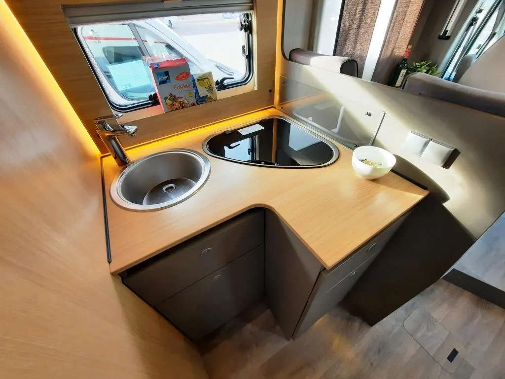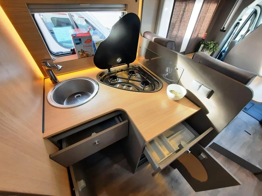 Fahrer+Beifahrerairbag, Kühlergrill verchromt, ASR, ABS+ESP inkl. Hillholder, Zentralverriegelung, DAB Radioantenne Spiegel, Aufbau komplett GFK, Ausstellfenster mit Multifunktionsrollos+Sichtschutz, Rauchmelder, 3 Flammenkocher mit elektrischer Taktfunkenzündung und Glasabdeckung, Combi 6 mit Bedienteil classic, Abwassertank 90 l, LED Innenbeleuchtung, Lesespots, Multifunktionsbedienpanel, Radiovorbereitung inkl. Lautsprecher Aktiv-Antenne DAB fähig, Rückfahrkamera inkl. Kabelverlegung ohne Monitor und vielen mehr*