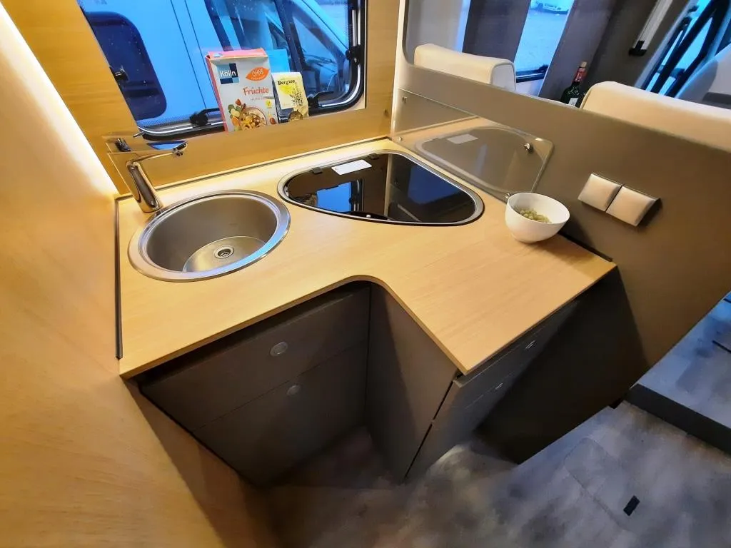 Tourer Paket (Multifunktionslenkrad mit Bedienelement, Lenkrad und Schaltknauf (Lederausführung), Alufelgen 16“, Fliegenschutztür, Vorbereitung SAT, Klima, Solar, inkl. Dachverstärkung, Dachhaube Midi-Heki, Panoramafenster (T-Haube), Traktion+, Beleuchtungsspots im Bodenbereich, Indirekte Beleuchtung Küchenrückwand und ober- und unterhalb der Hängeschränke, LED-Leisten im Schlafbereich, Falltrollosystem Fahrerhaus)