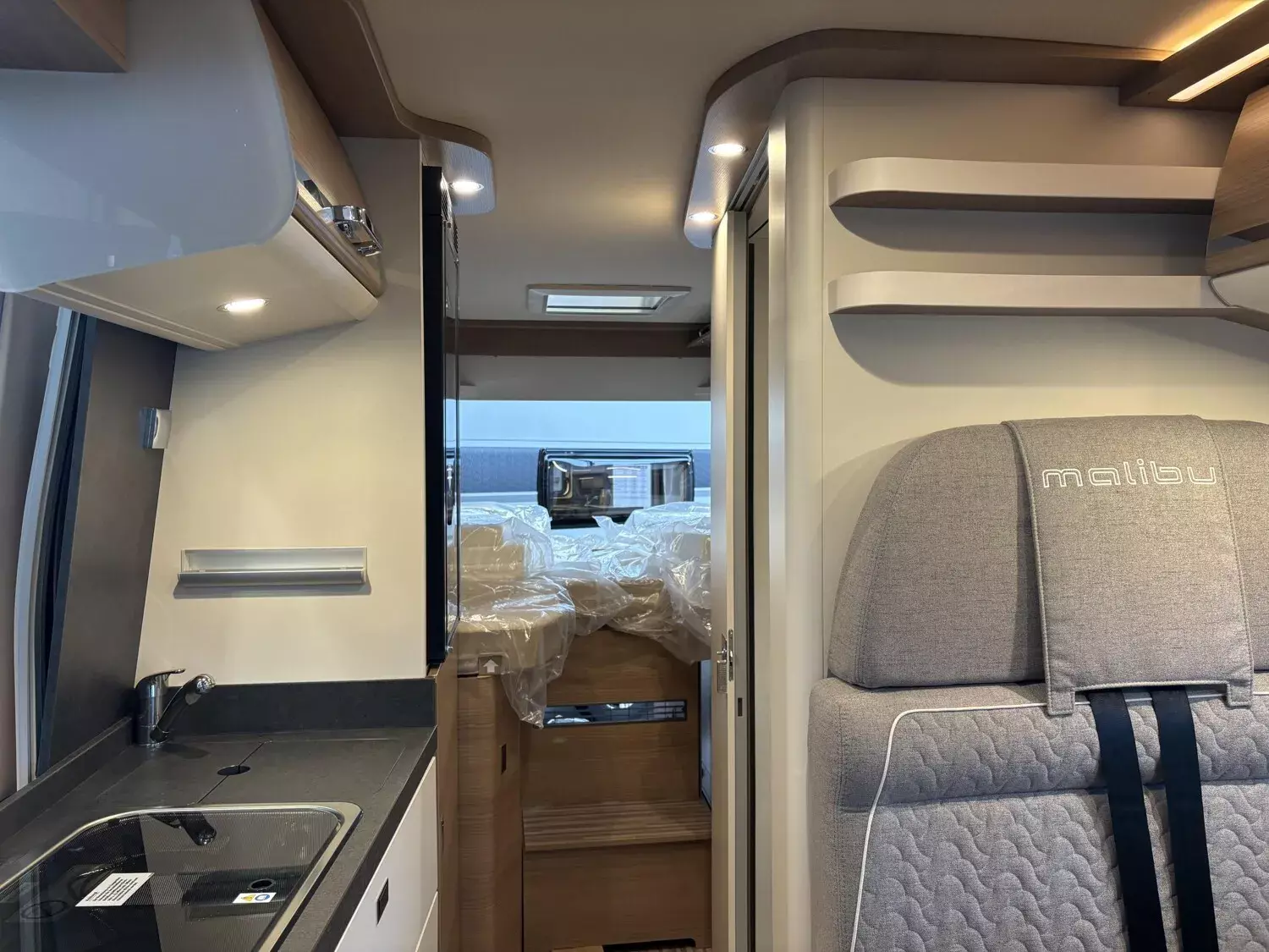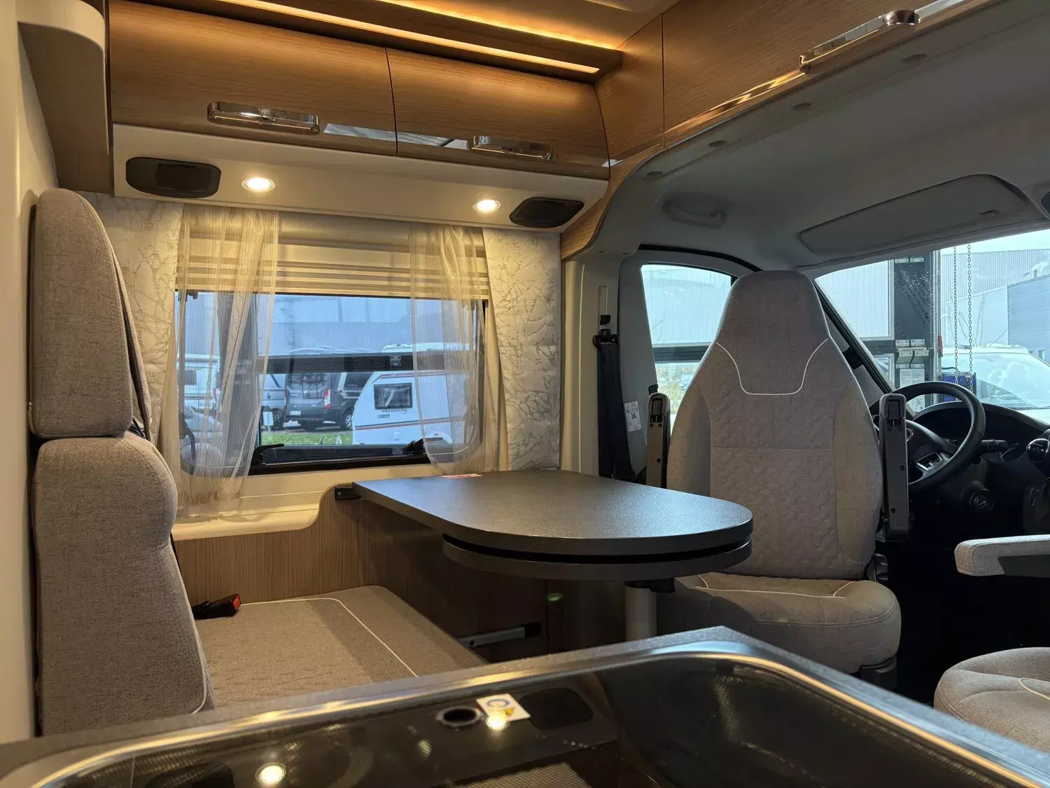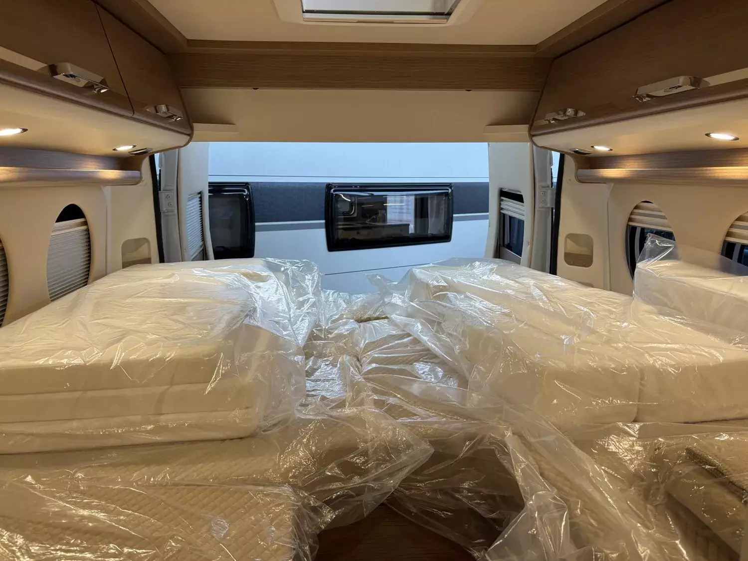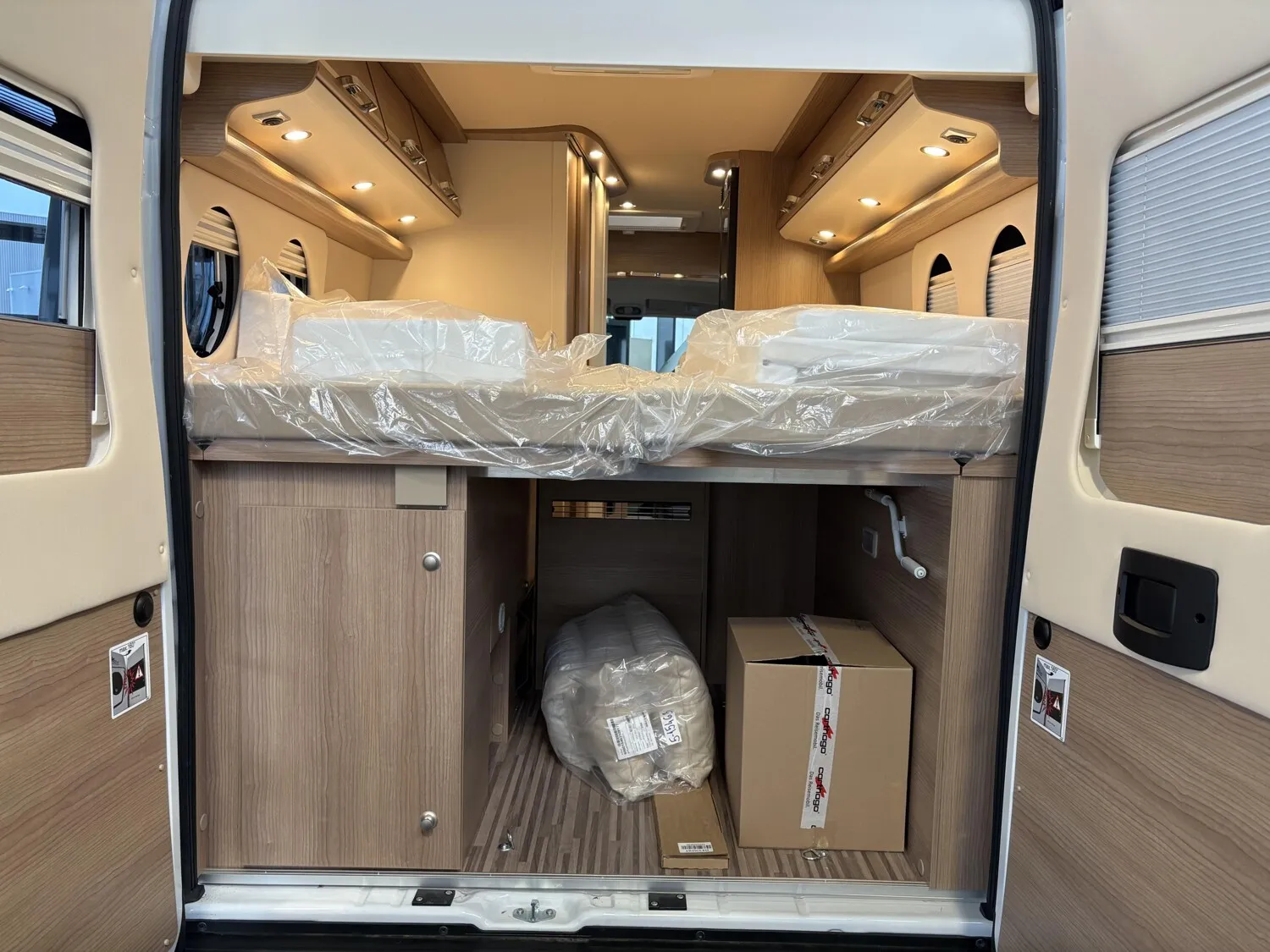 - Aufbau-Paket (Dachinnenverkleidung mit Mikrofaser-Klimabelag, Deckenbaldachin Wohnraum mit indirekter LED-Ambientebeleuchtung, Upgrade Küchencenter, Qualitäts-Kaltschaummatratze im Heckbett, Truma CP Plus digitales Bedienpanel, Verzurrsystem Gepäckraum, Abwassertank in Gehäuse eingefasst und isoliert)
