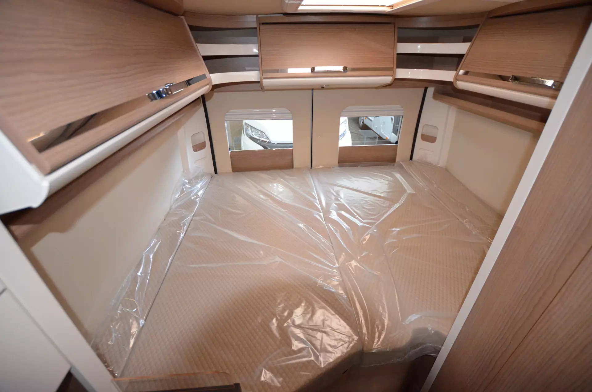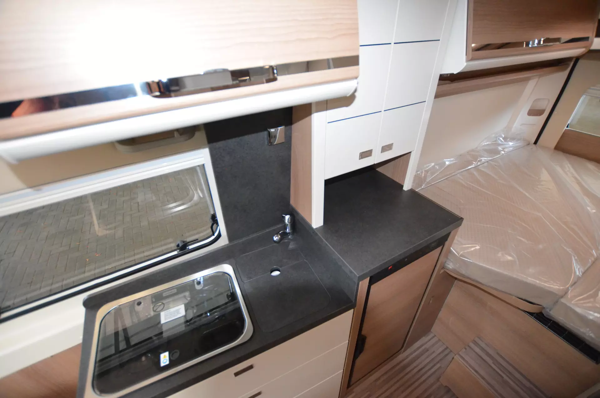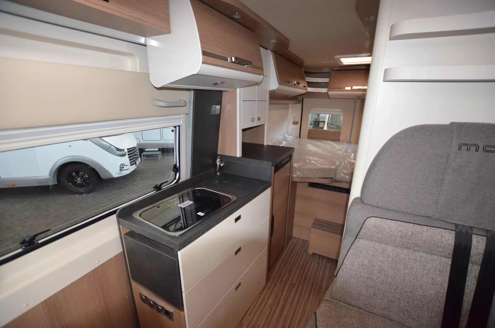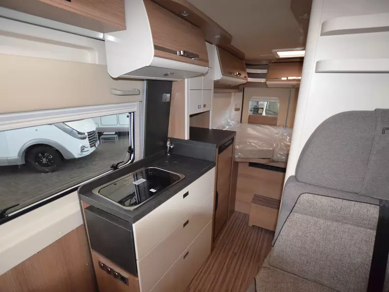 Heckmatratzen in 7 Zonen Qualität, Verzurrsystem im Gepäckraum, Abwassertank in Gehäuse eingefasst und isoliert, Truma CP Plus Bedienteil, Upgrade Küchencenter: Küchefront in Creme Arbeitsflächen Verbreiterung Spülabdeckung geteilt mit Schneidebrett und Wandhalterung, LED Ambientebeleuchtung, Dachinnenverkleidung mit Microfaser-Klimabelag