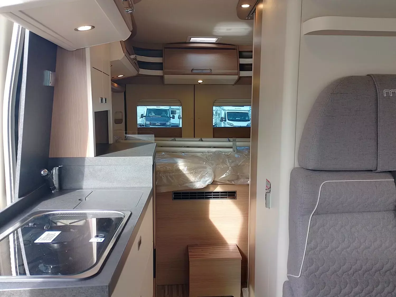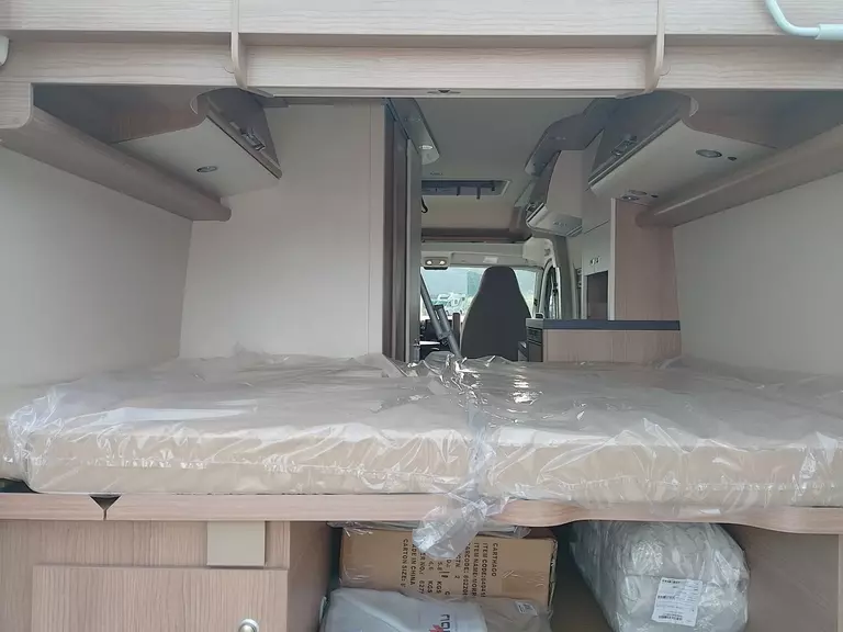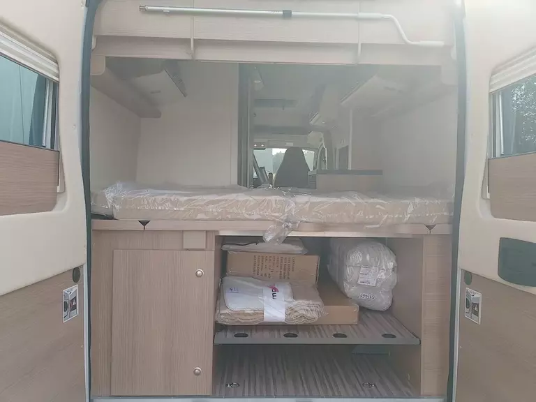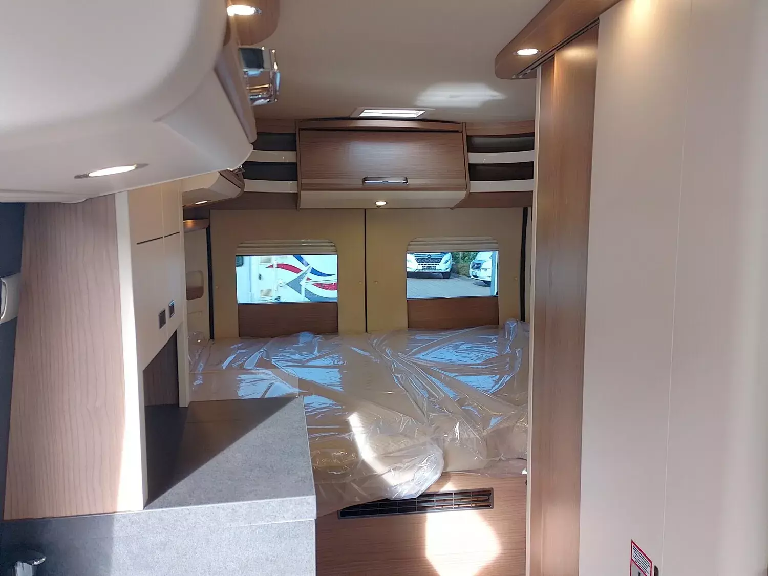 - Aufbau-Paket (Dachinnenverkleidung mit Mikrofaser-Klimabelag, Deckenbaldachin Wohnraum mit indirekter LED-Ambientebeleuchtung, Upgrade Küchencenter, Qualitäts-Kaltschaummatratze im Heckbett, Truma CP Plus digitales Bedienpanel, Verzurrsystem Gepäckraum, Abwassertank in Gehäuse eingefasst und isoliert)